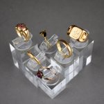 Ensemble de 6 bagues et chevalière en or jaune 18K 750/1000e, rubis et pierre blanche. Poids brut total: 14,97g.