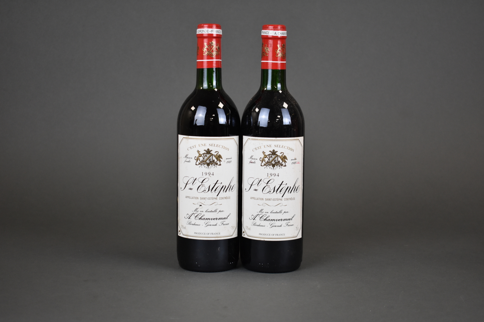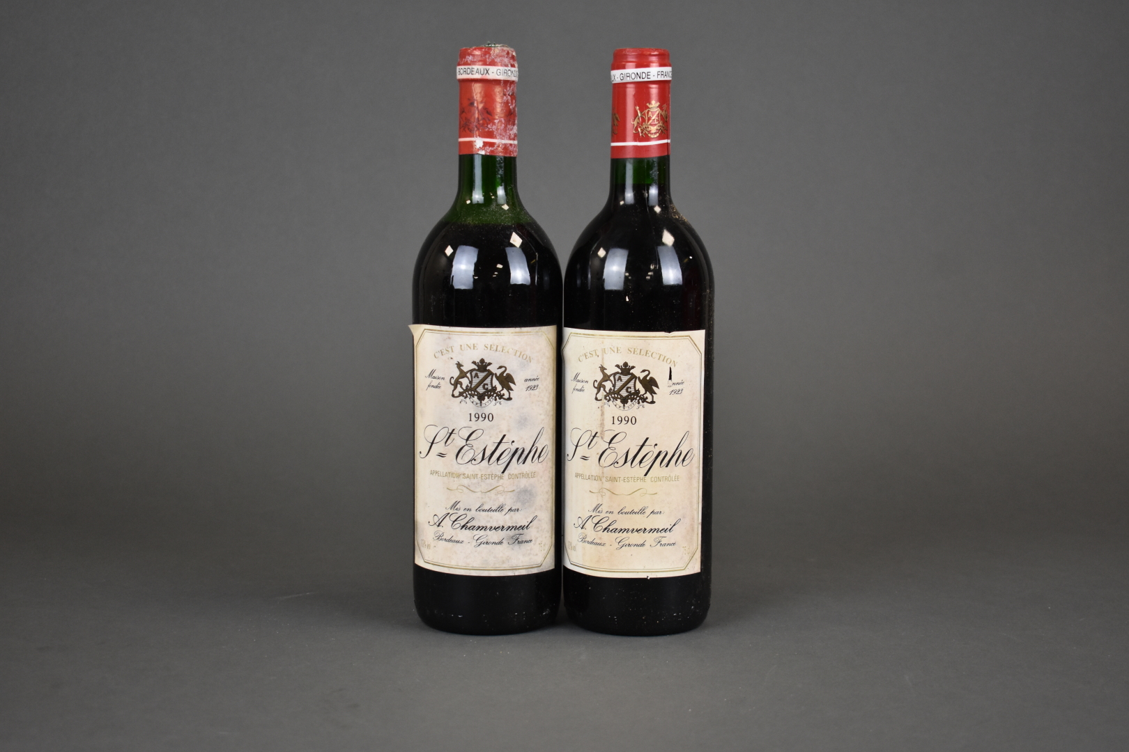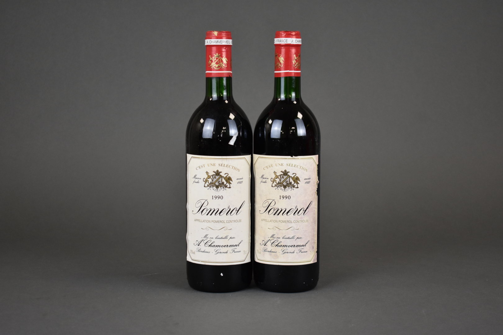 Ensemble de 6 bouteilles soit 4 ST ESTEPHE A.Chamvermeil (2 de 1994 et 2 de 1990), et 2 POMEROL A. Chamvermeil 1990 (étiquettes tachées, une capsule humide, niveau du bas goulot à l’épaule).