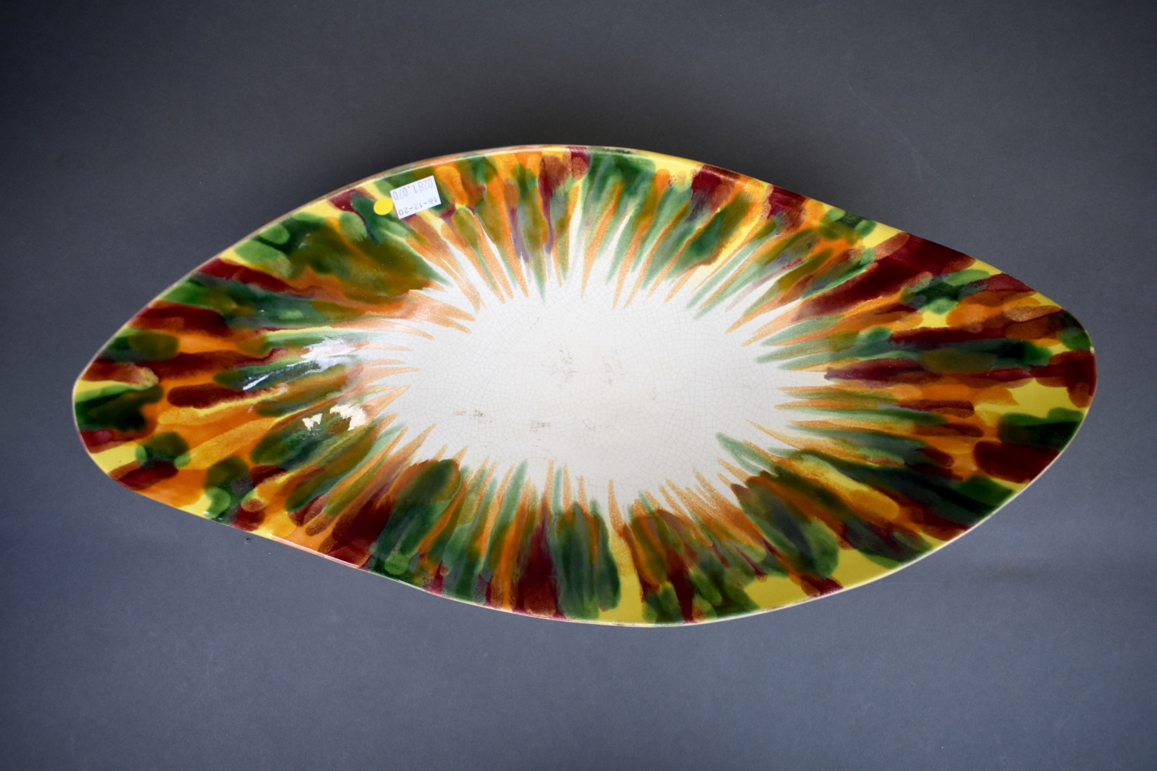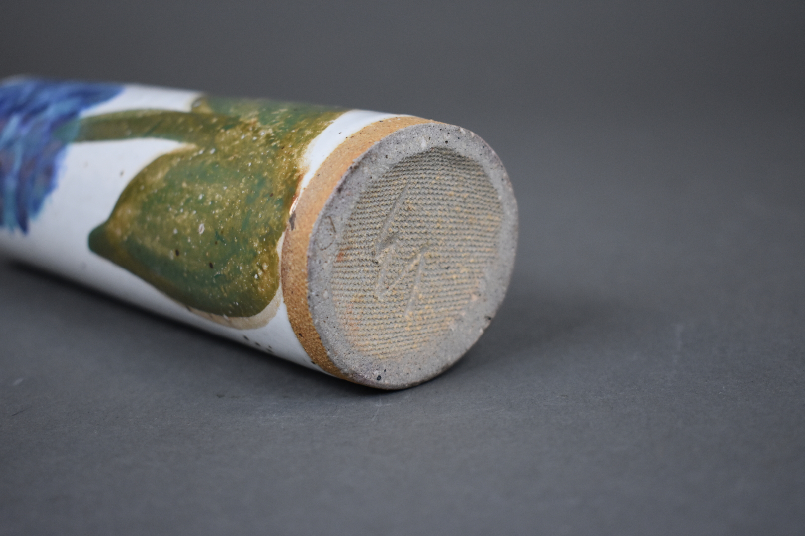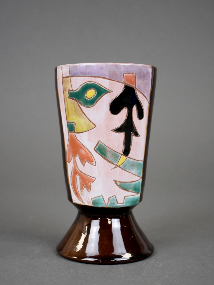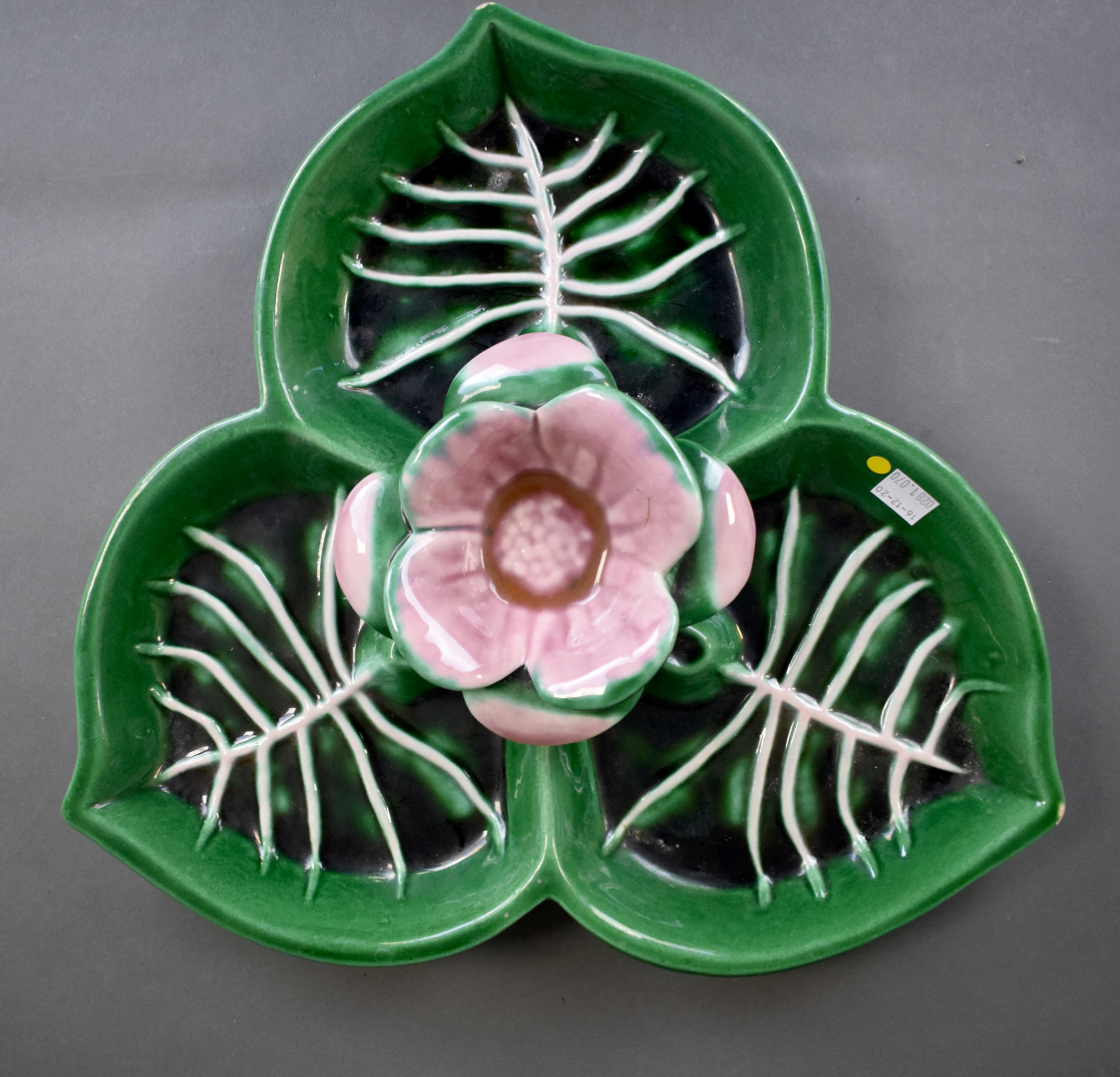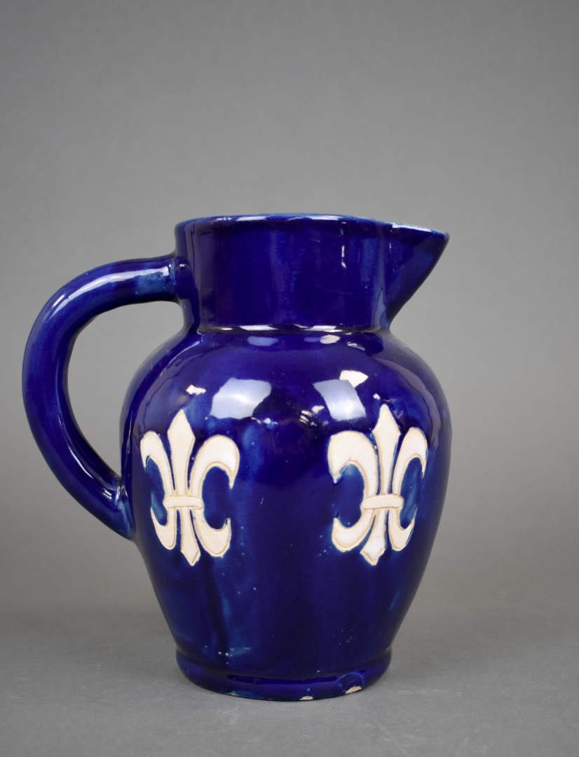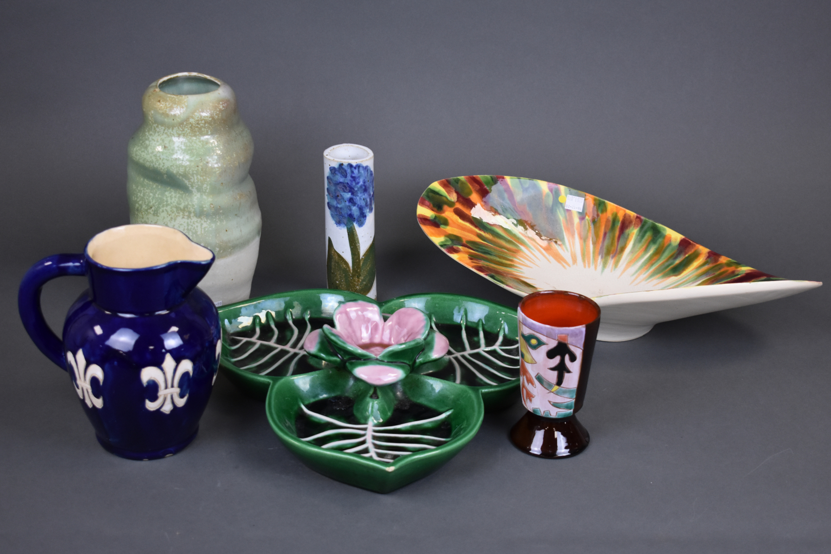 Ensemble de 6 céramiques soit un plat apéritif en barbotine verte, une coupe à fruit, un broc émaillé bleu à fleurs de lys, une coupe sur pied, un vase rouleau et un vase de forme libre.