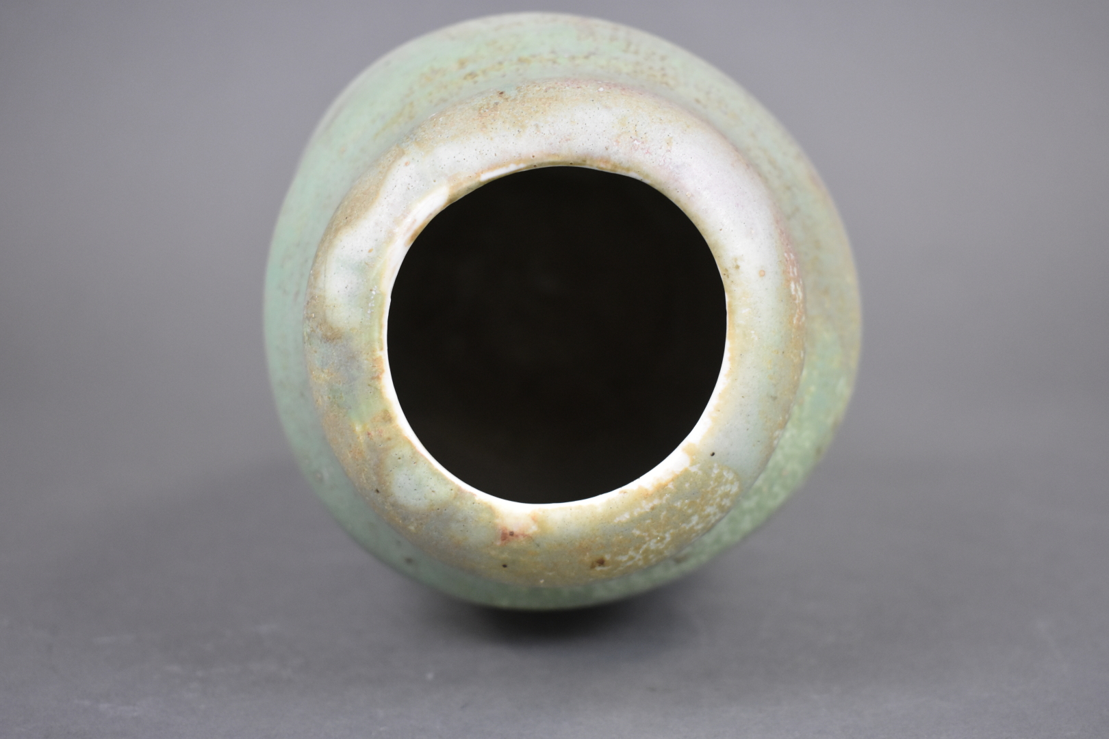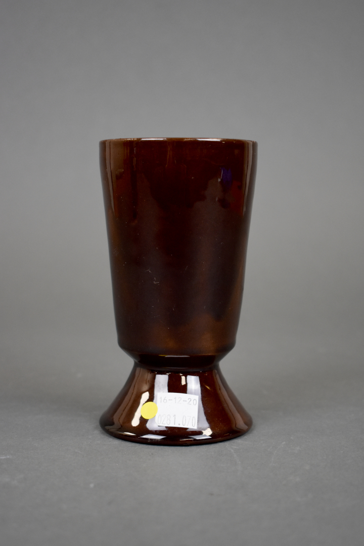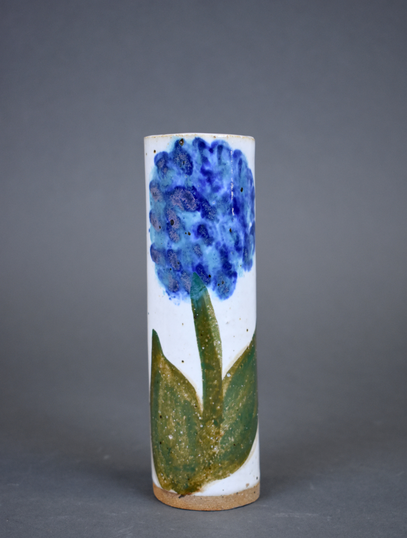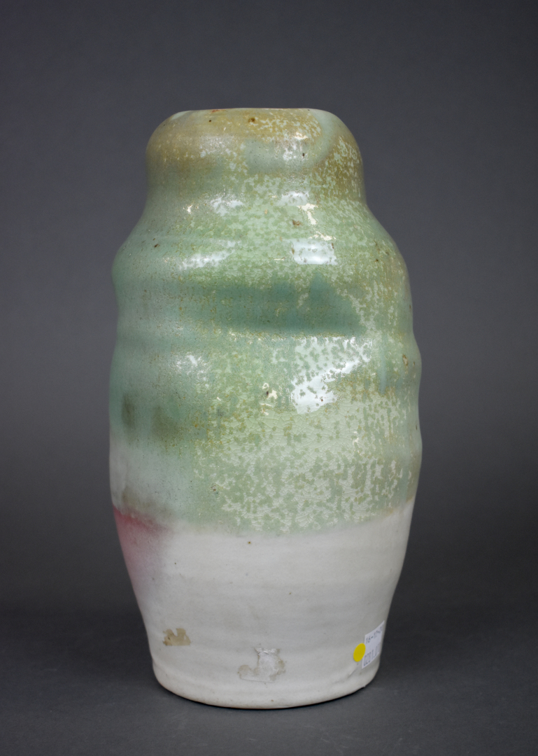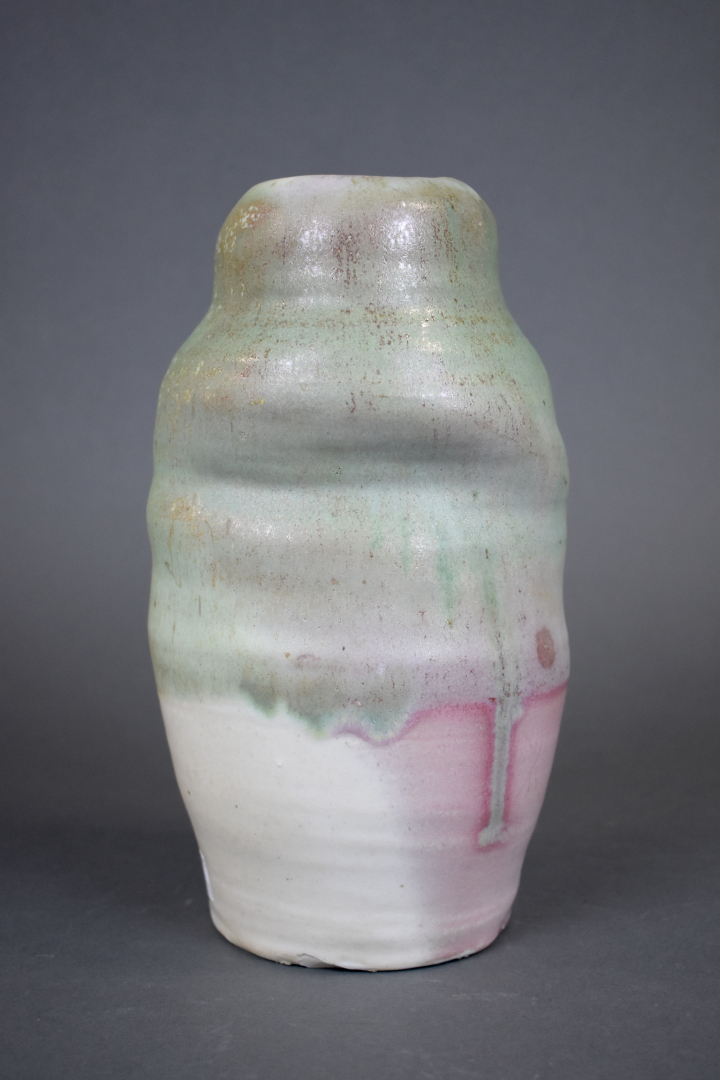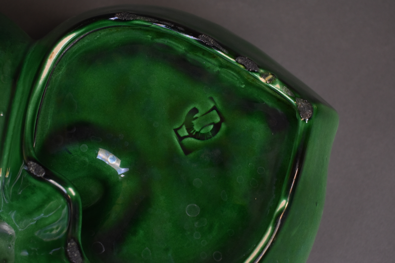 Ensemble de 6 céramiques soit un plat apéritif en barbotine verte, une coupe à fruit, un broc émaillé bleu à fleurs de lys, une coupe sur pied, un vase rouleau et un vase de forme libre.