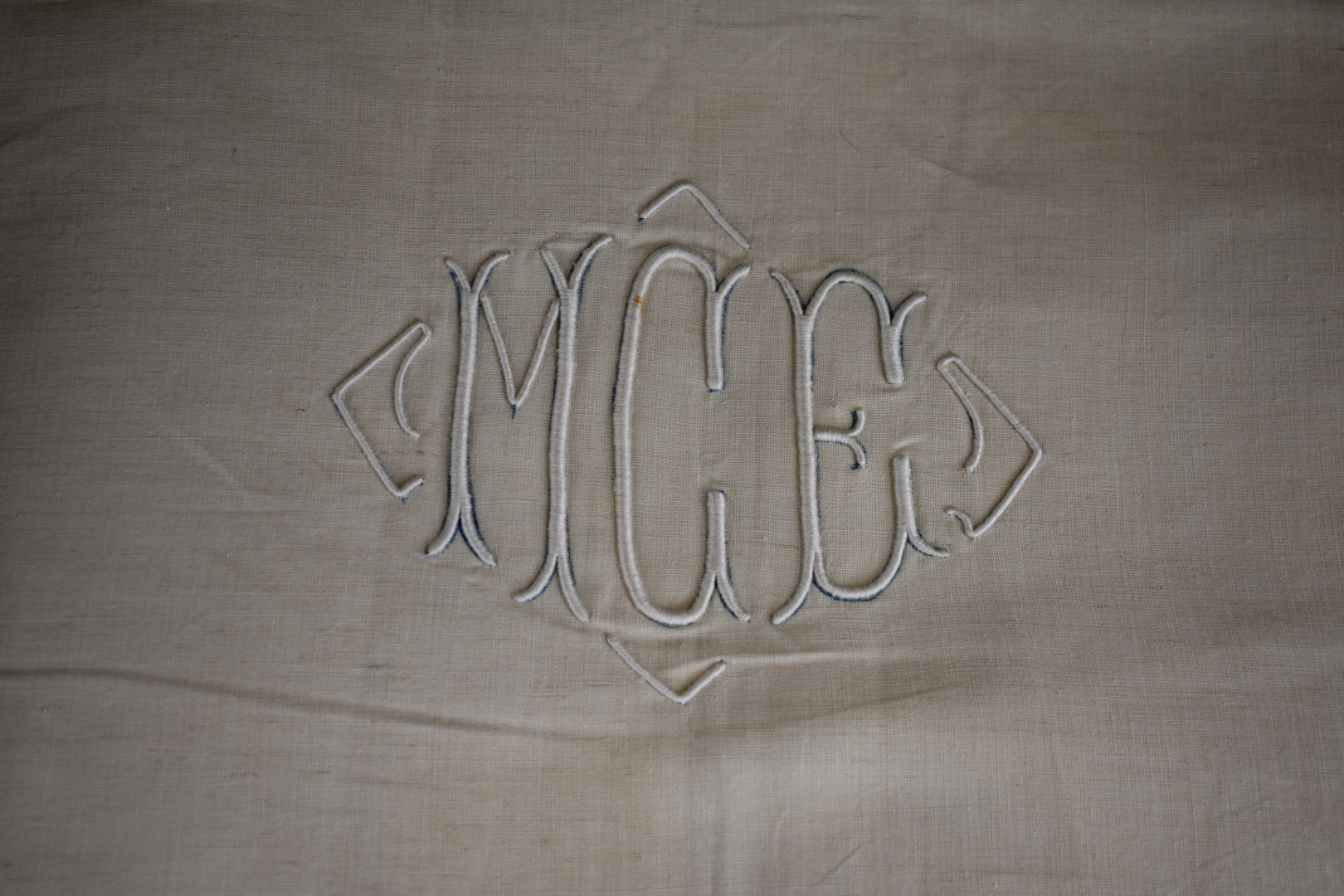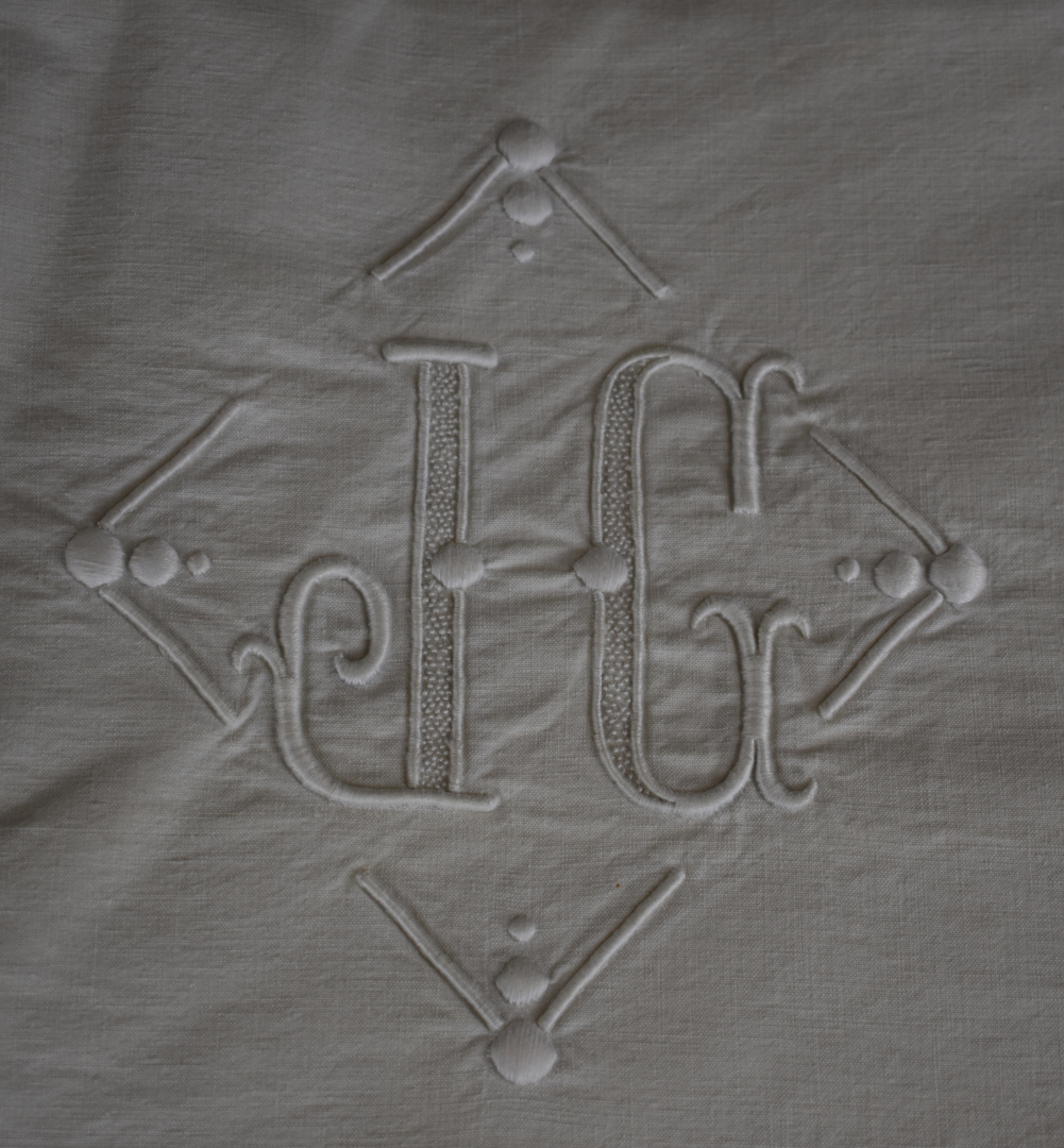 Ensemble de 6 draps brodés en lin ancien monogrammés PG, MCE, 5 taies de traversin, 6 taies d’oreiller