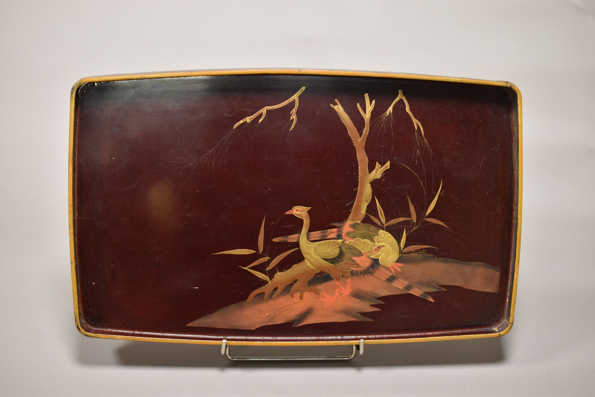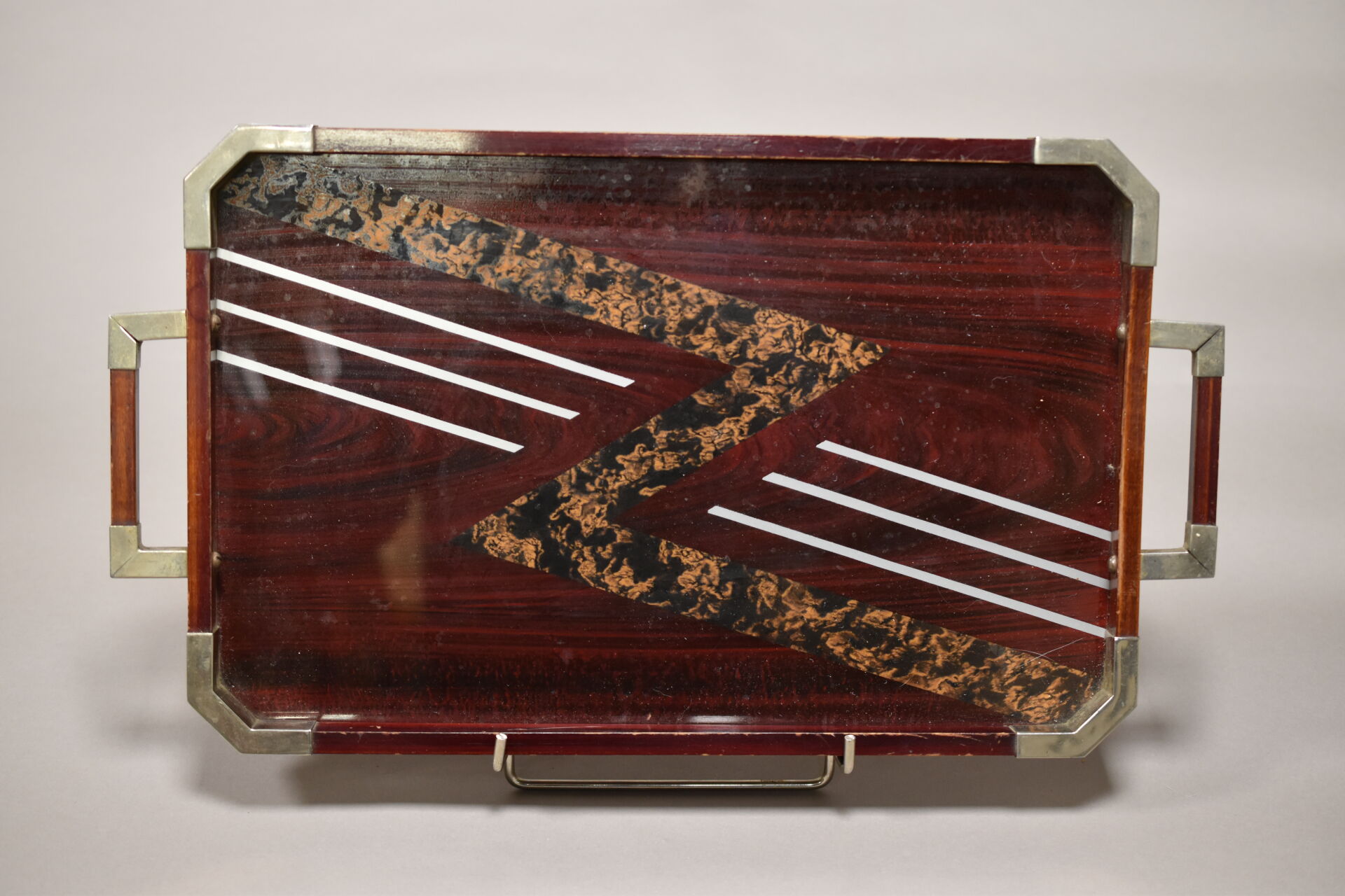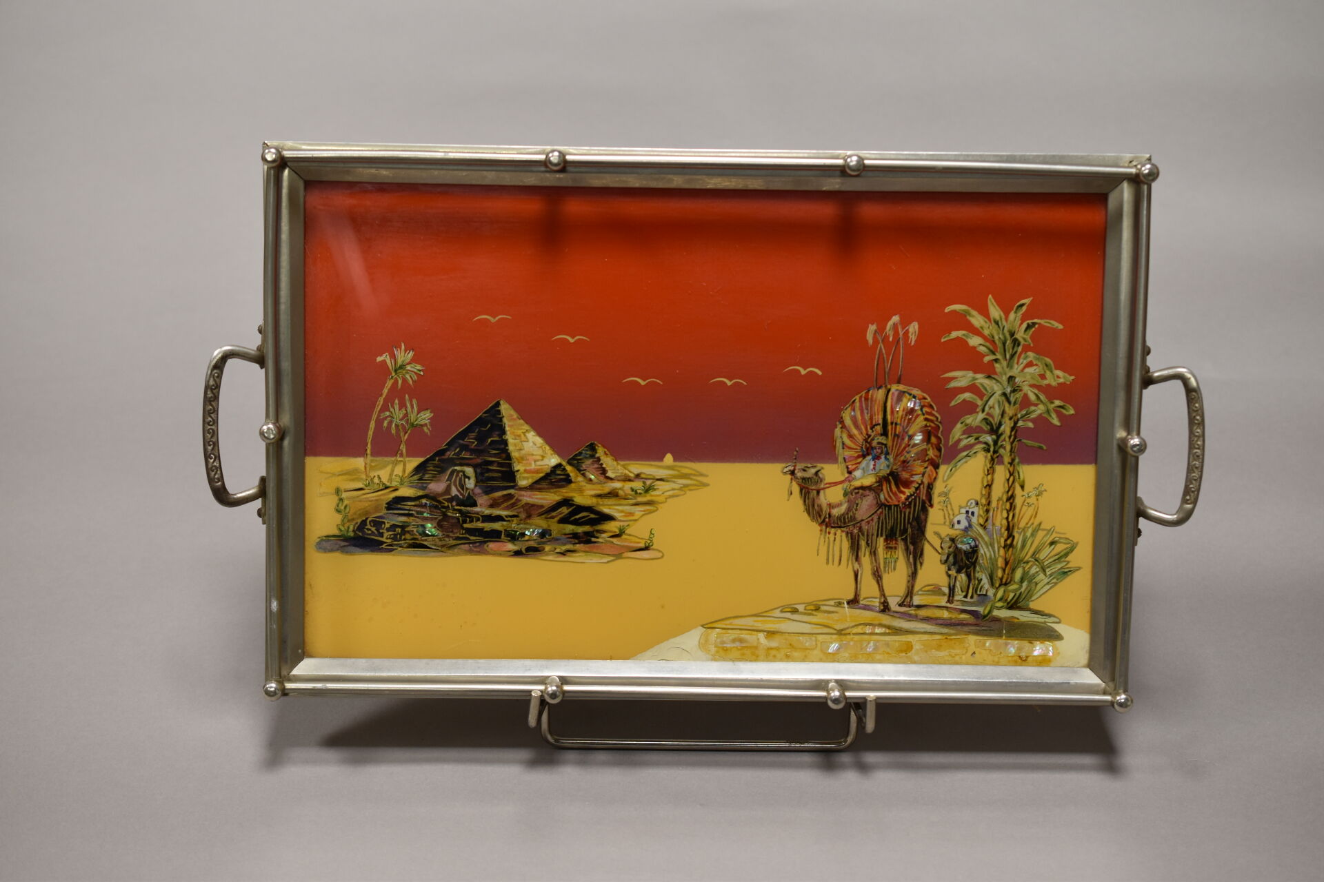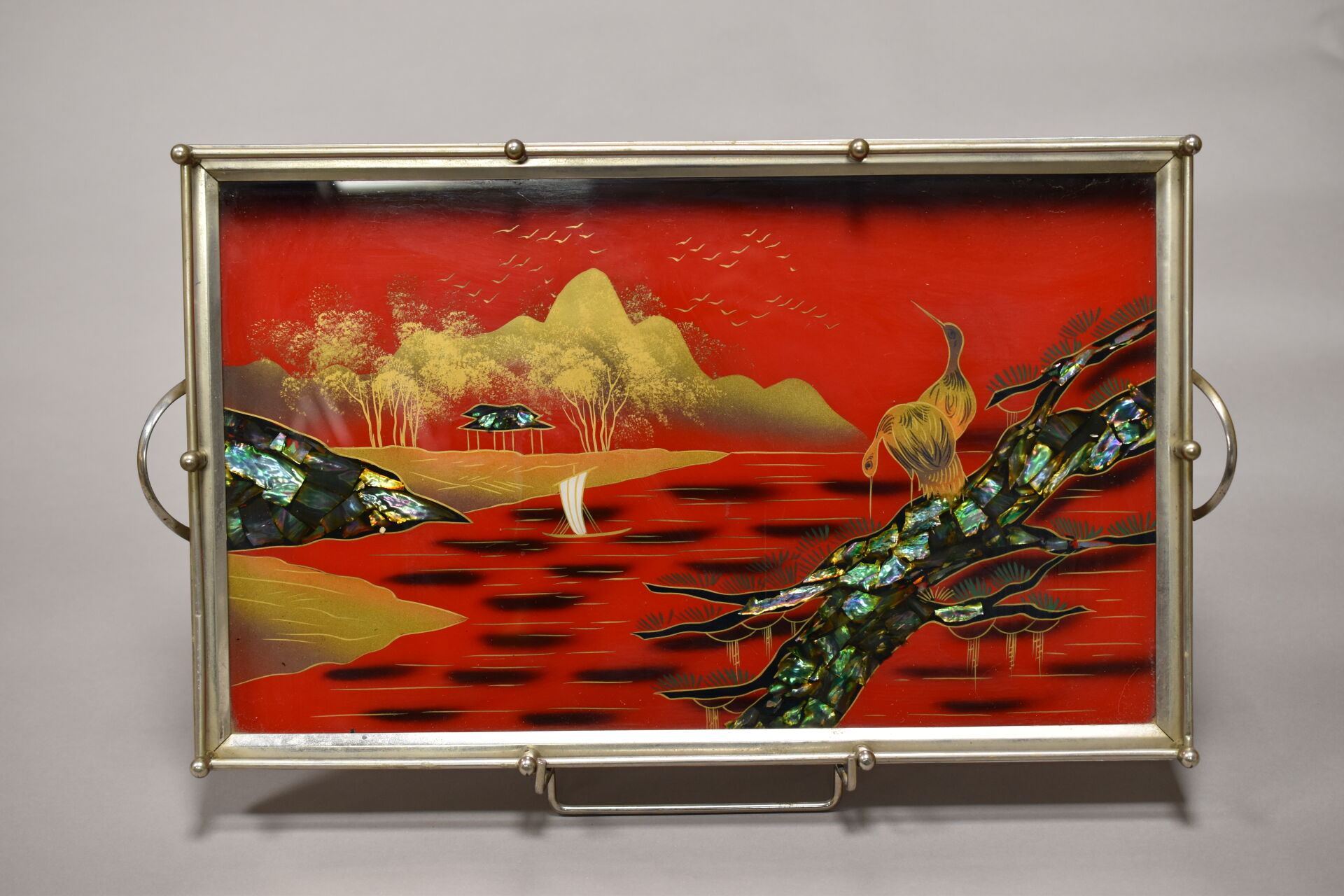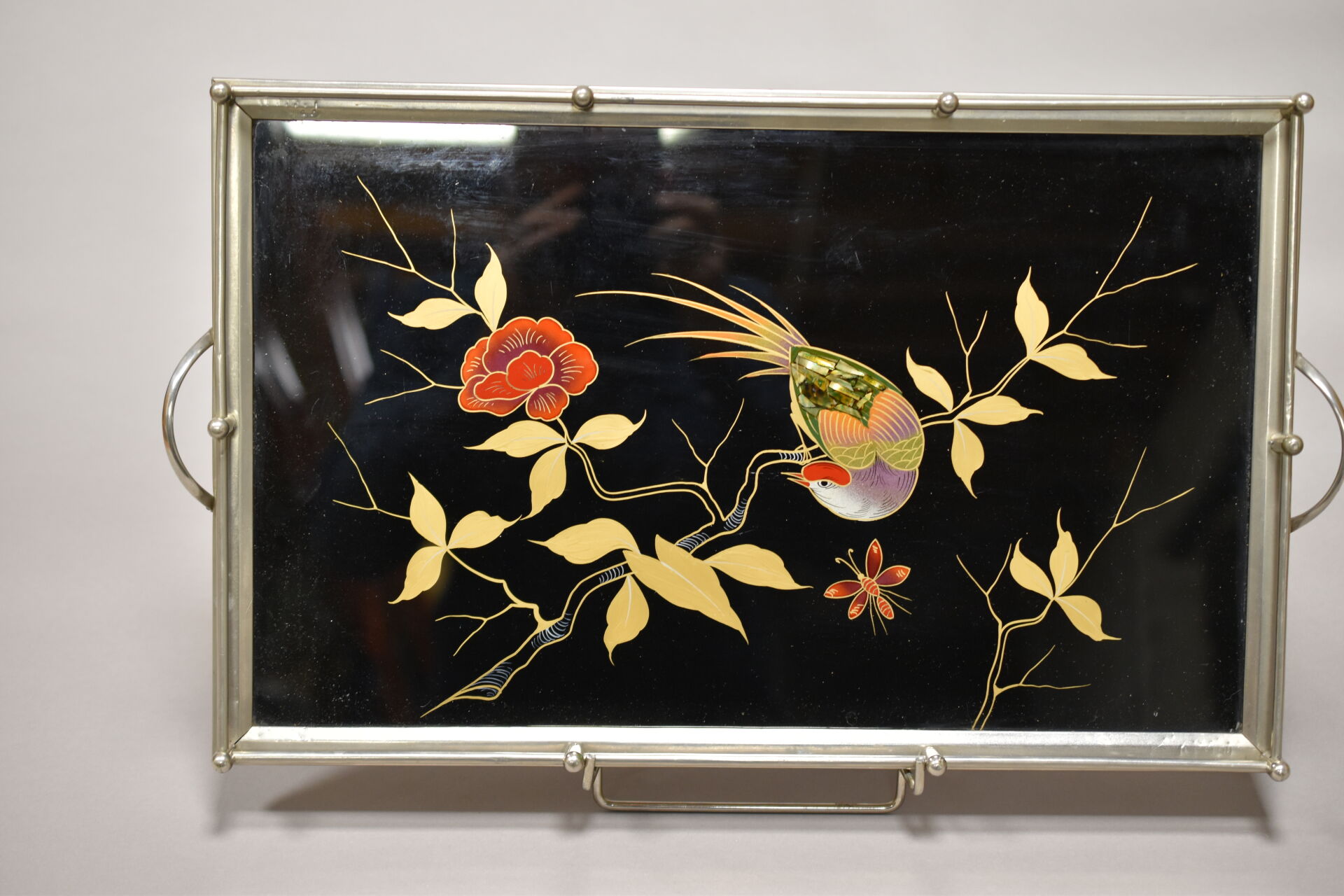 Ensemble de 6 plateaux en métal argenté, les plats laqués, incrustés de nacre et de résine ou églomisés. XXe siècle. 56 x 33 cm pour le plus grand et 46,5 x 28 cm pour le plus petit.