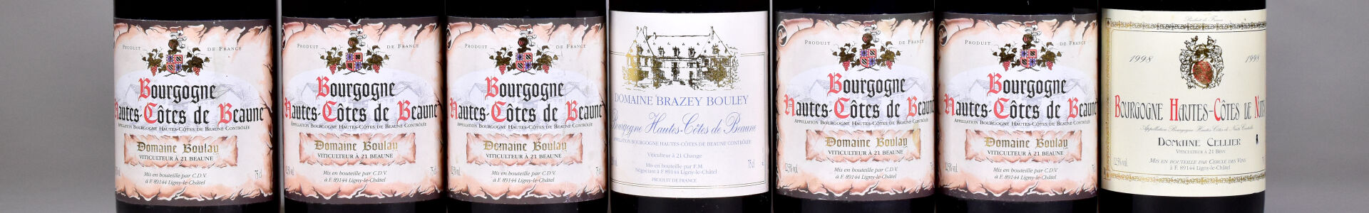 Ensemble de 7 bouteilles composé de : – 5 bouteilles, Bourgogne Hautes-Côtes de Beaune, Domaine Boulay, 1998. Capsules avec quelques plis. – 1 bouteille, Bourgogne Hautes-Côtes de Nuits, Domaine Cellier, 1998. Une marque sur l’étiquette. – 1 bouteille, Bourgogne Hautes-Côtes de Beaune, Domaine Brazey Bouley, 1997.