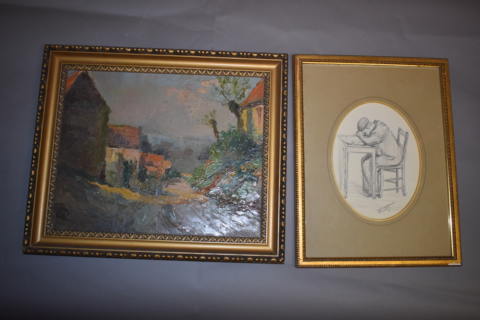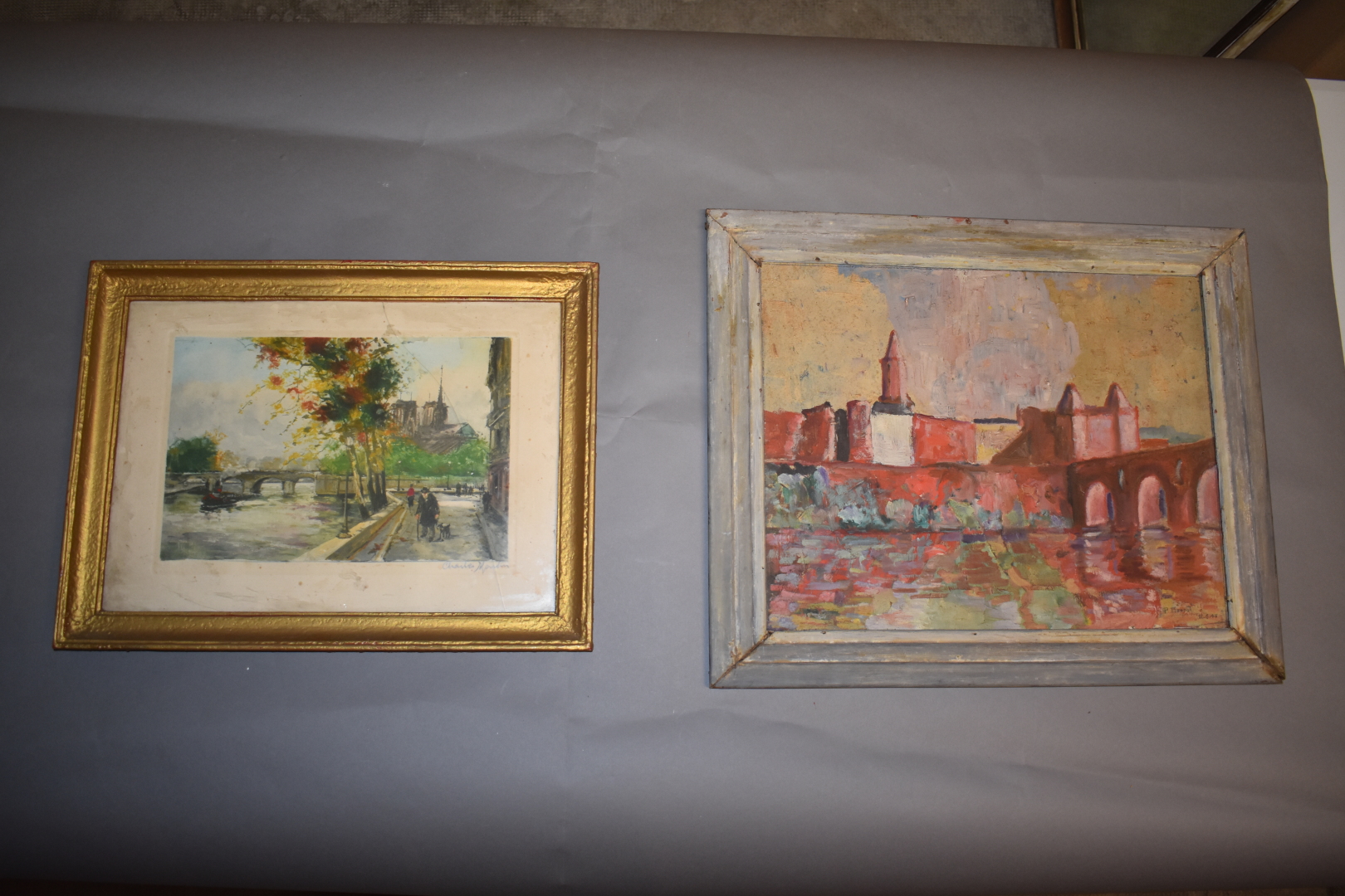 Ensemble de 7 pièces encadrées dont un dessin mère et son enfant, un dessin signé BONTET, une nature morte, le pont vieux à Montauban et Notre-Dame de Paris.