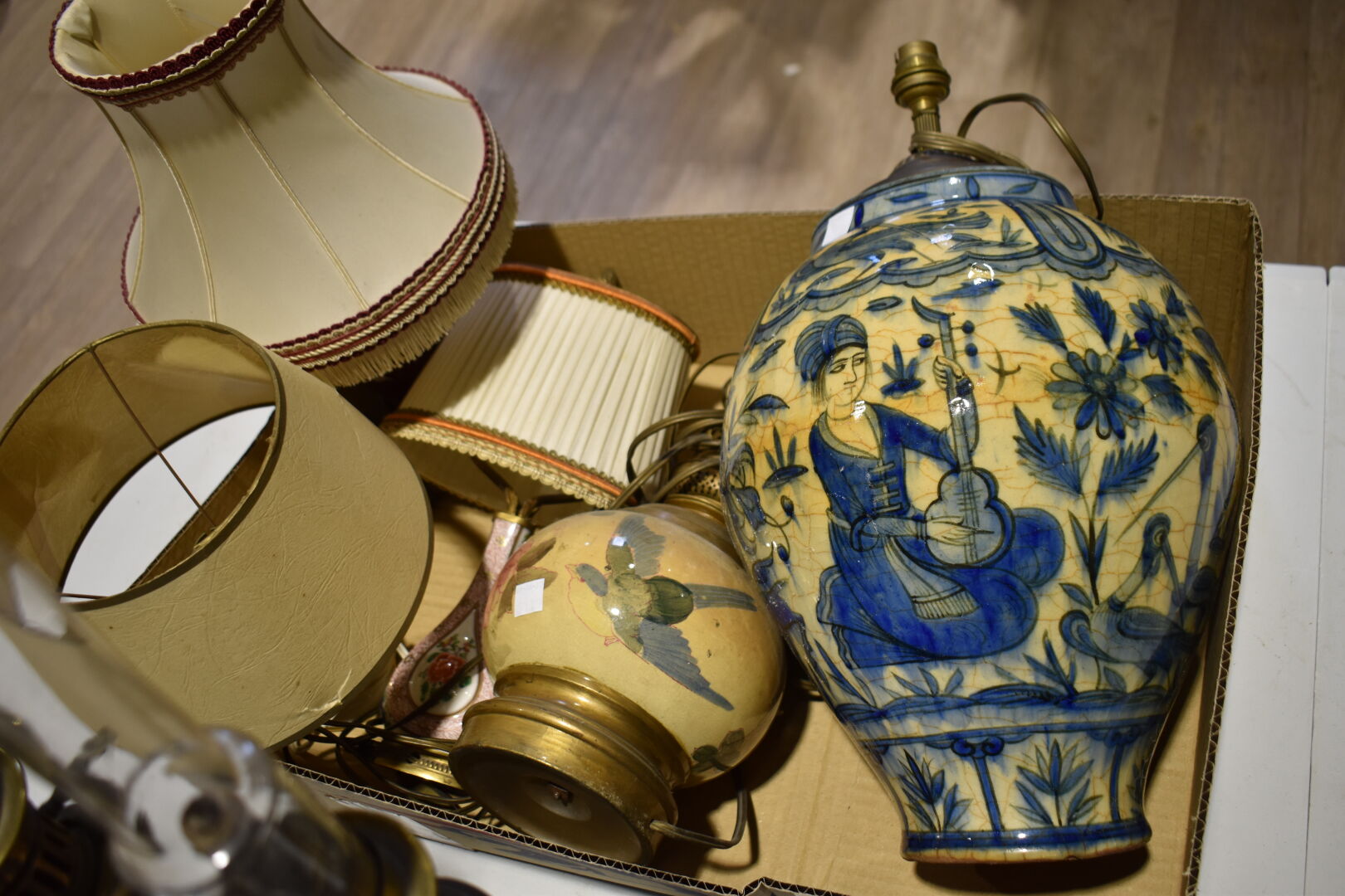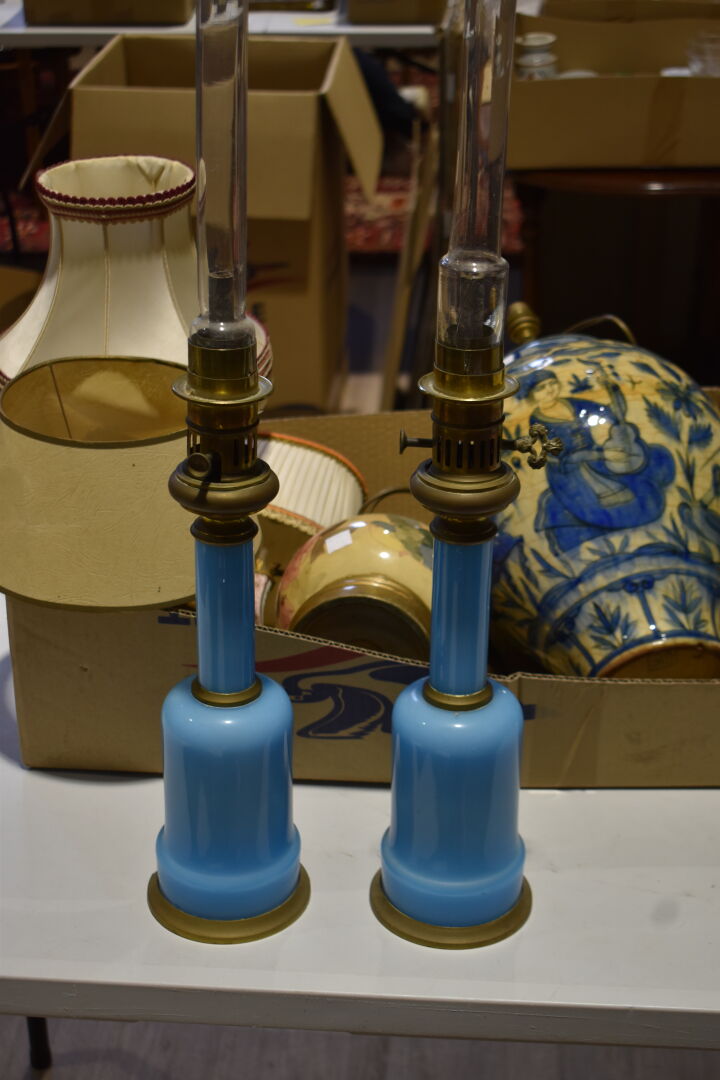 Ensemble de 7 pieds de lampe dont une paire de lampes à huile en opaline bleue, lampe en faïence dans le goût d’Iznik.