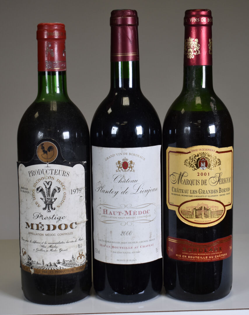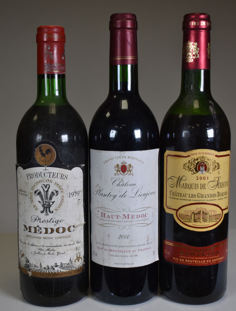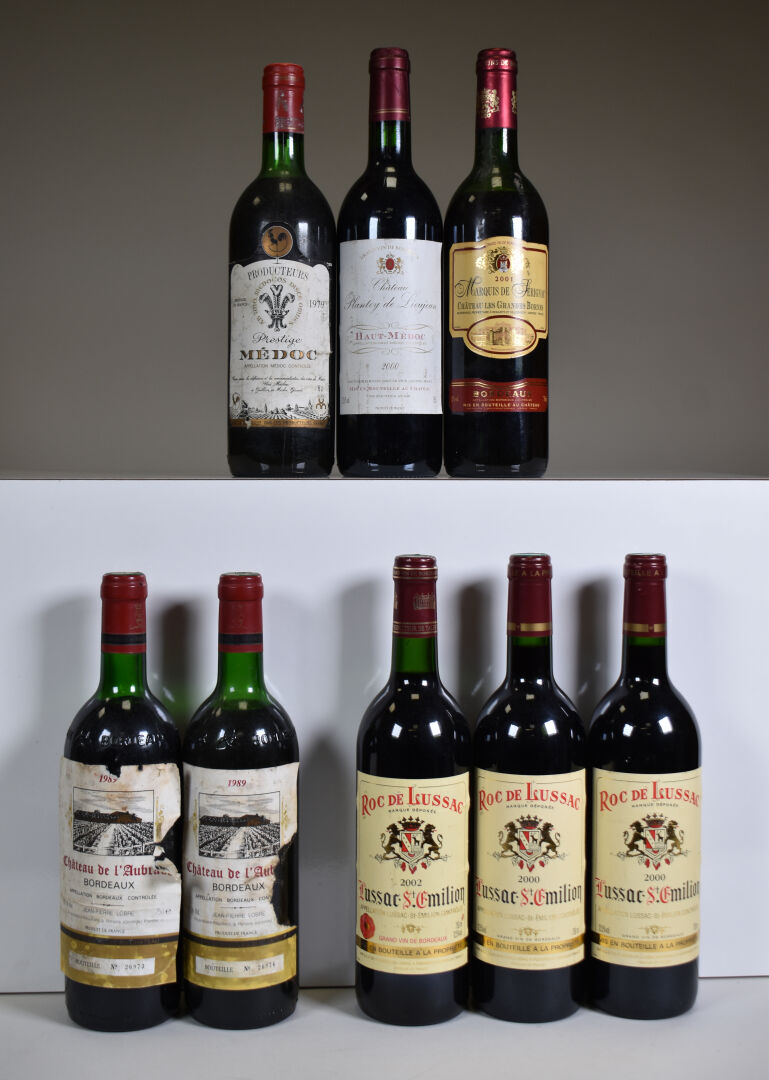 Ensemble de 8 bouteilles composé de : – 3 bouteilles, Lussac Saint-Emilion, Roc de Lussac, 2000 (2) et 2002 (1). – 2 bouteilles, Bordeaux, Château de L’Aubrade, 1989. HE et HE-. Etiquettes tachées et partiellement dégradées. – 1 bouteille, Bordeaux, Château Les Grandes Bornes, 2001. ME. Trace de coulure ancienne. – 1 bouteille, Medoc, Producteurs Réunis, Prestige, 1979. HE+. Etiquette légèrement sale. – 1 bouteille, Haut-Médoc, Château Plantey de Lieujan, 2000. Etiquette avec quelques traces.