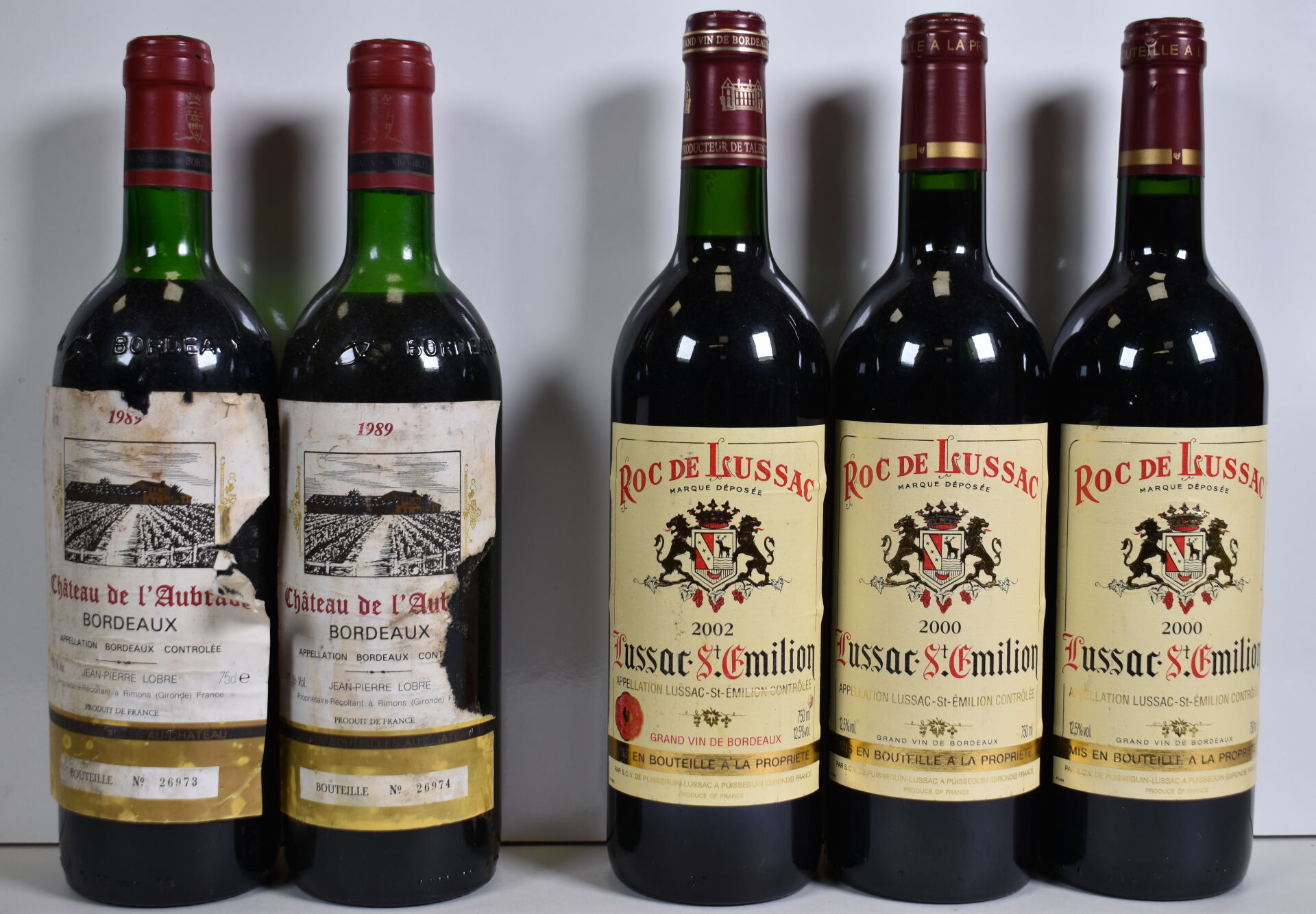 – 2 bouteilles, Bordeaux, Château de L’Aubrade, 1989. HE et HE-. Etiquettes tachées et partiellement