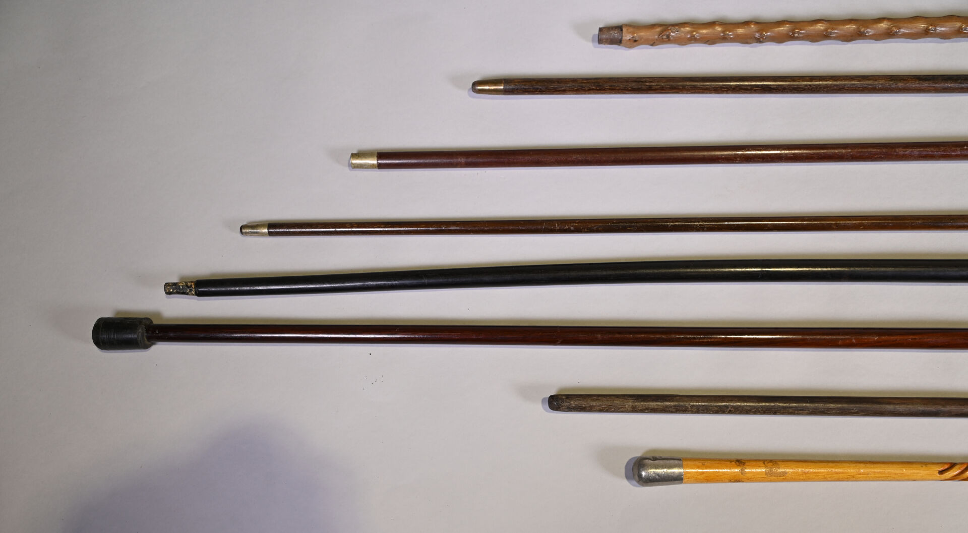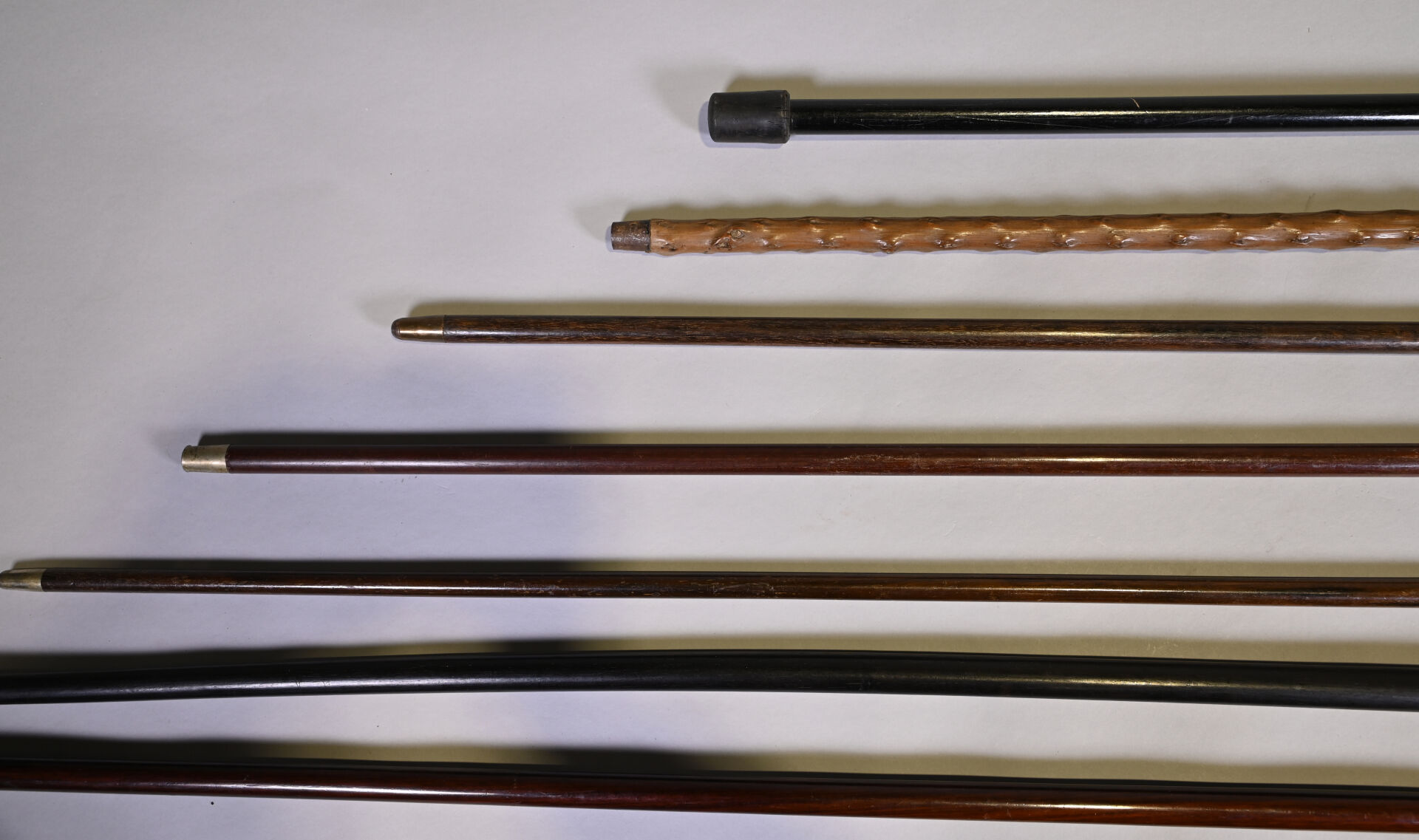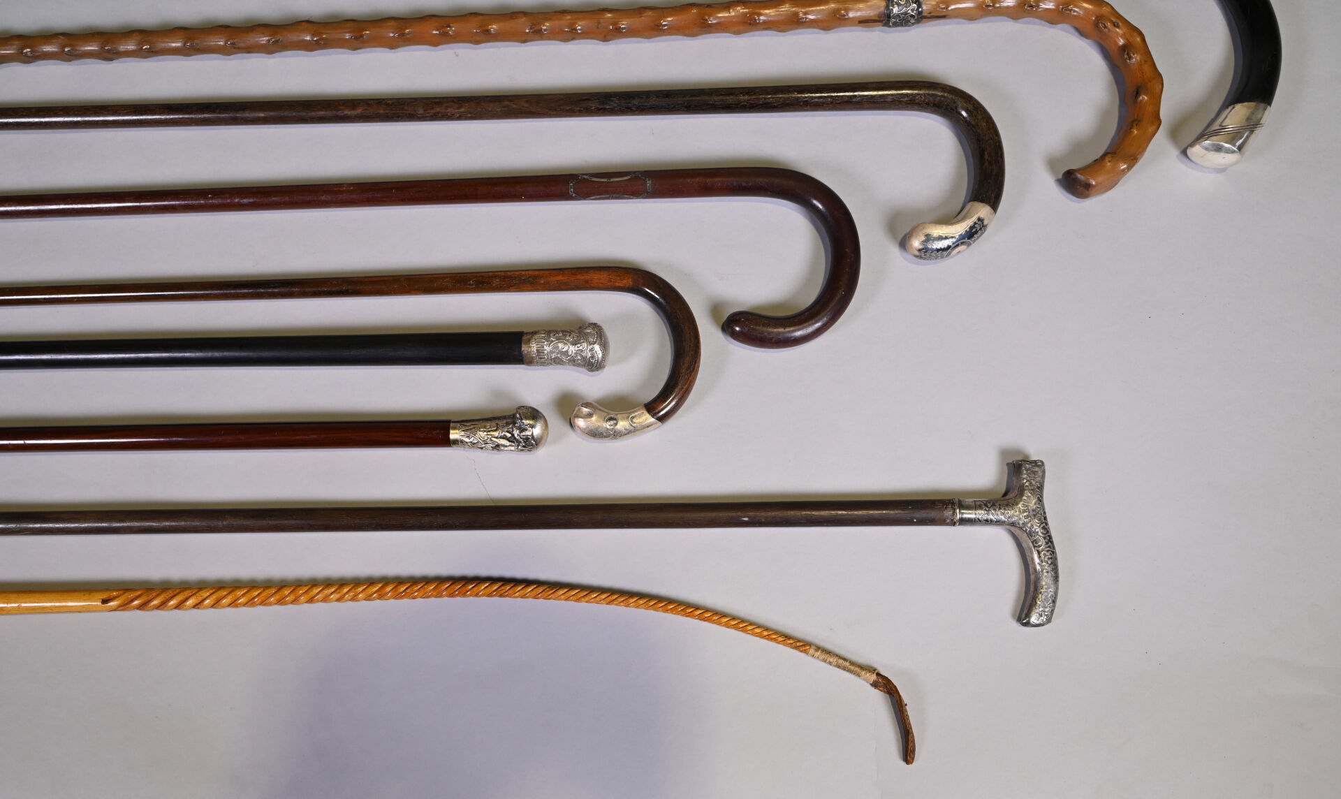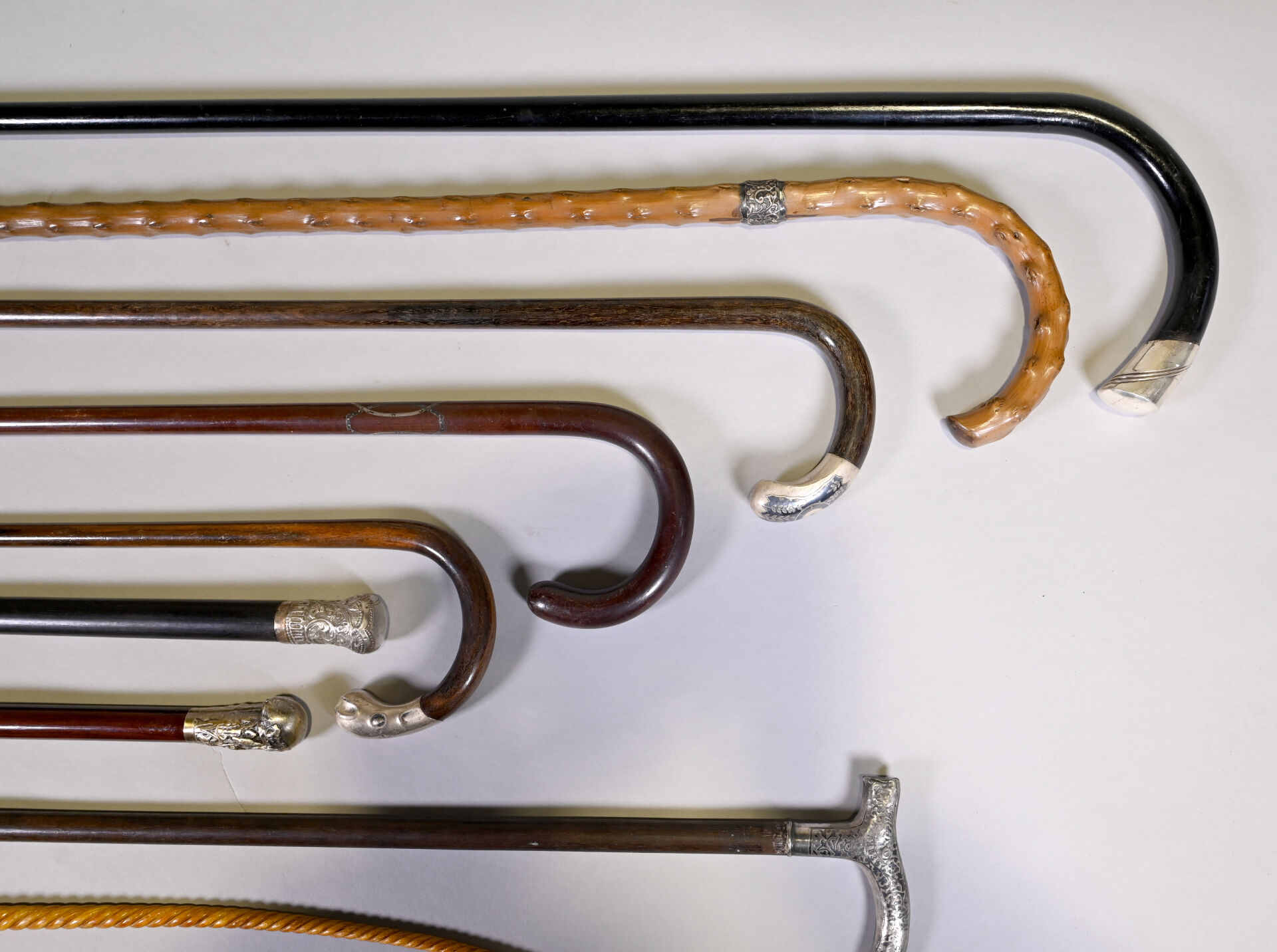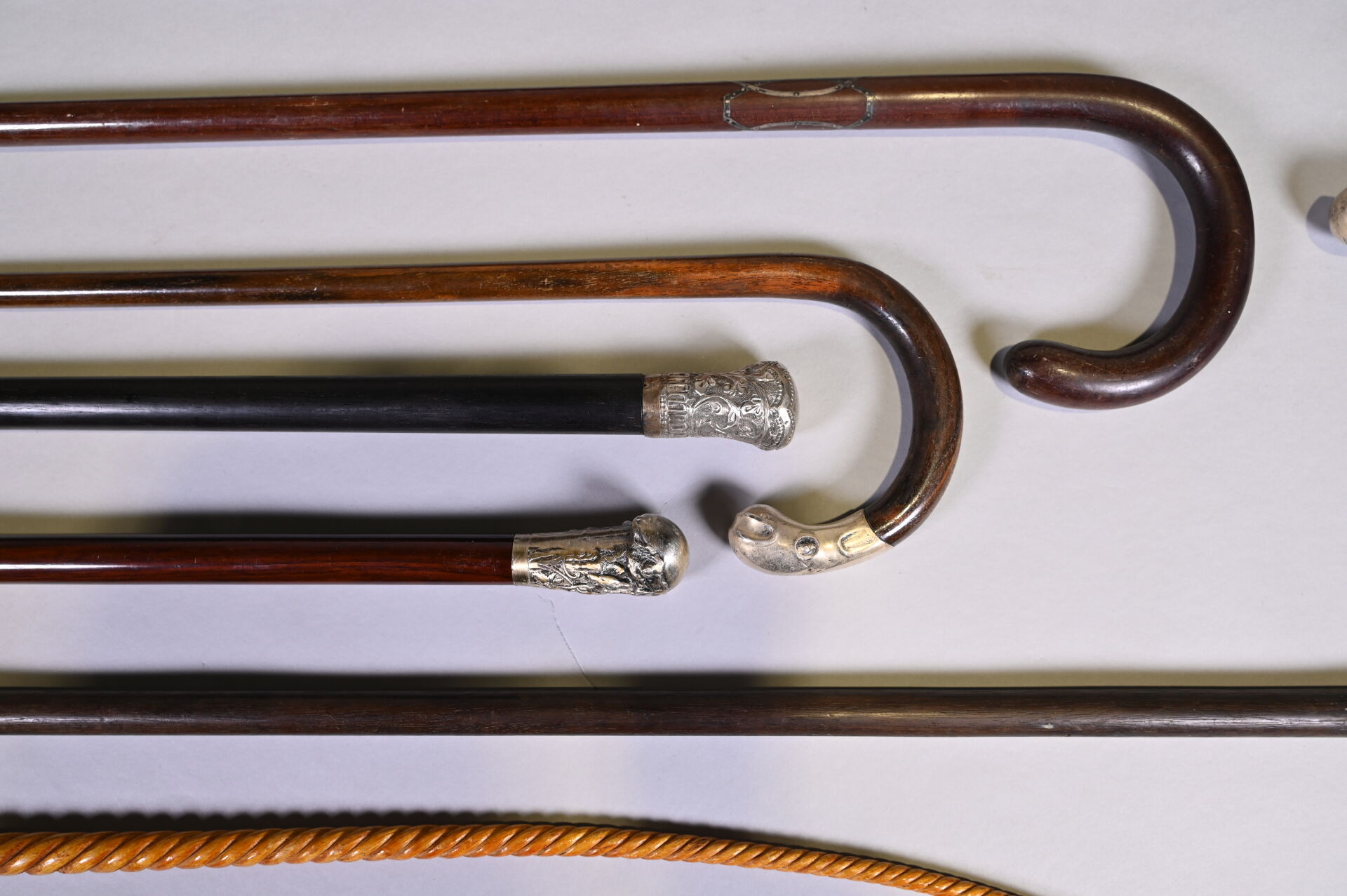 Ensemble de 8 cannes, à pommeaux ou incrustations d’argent 925/1000e et 800/1000e pour 6 d’entre elles. On joint une cravache.