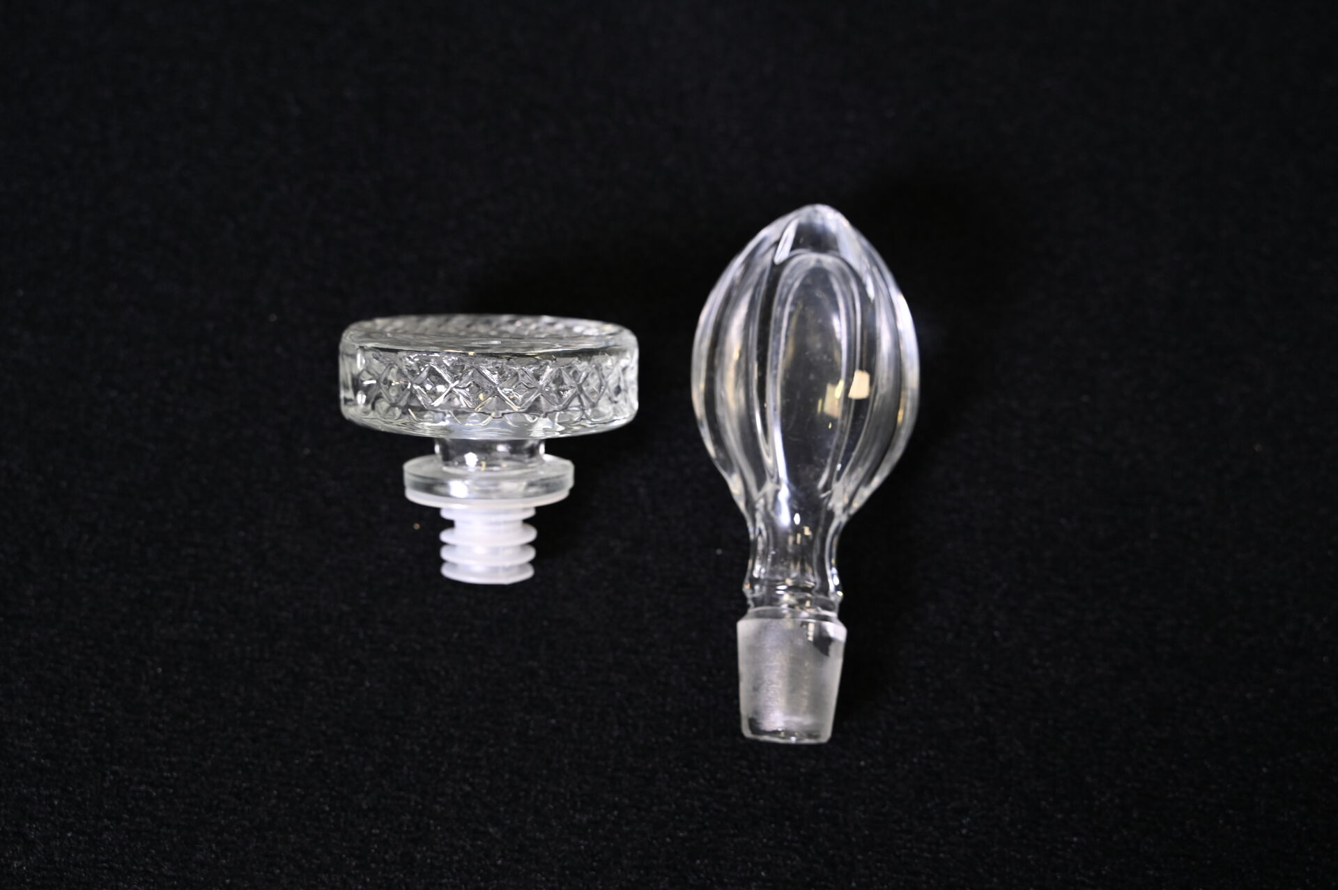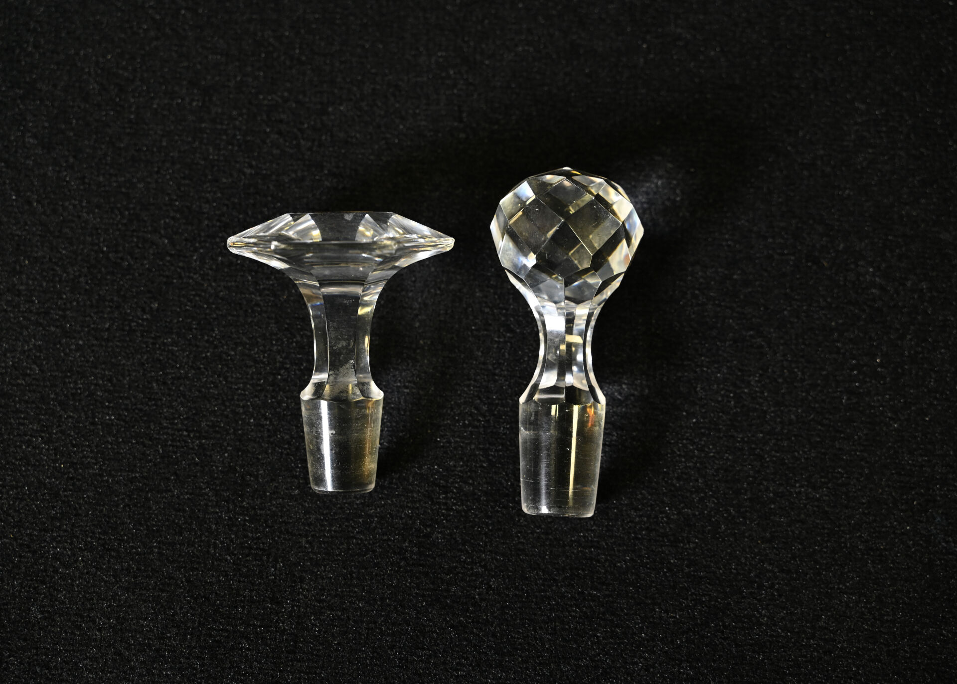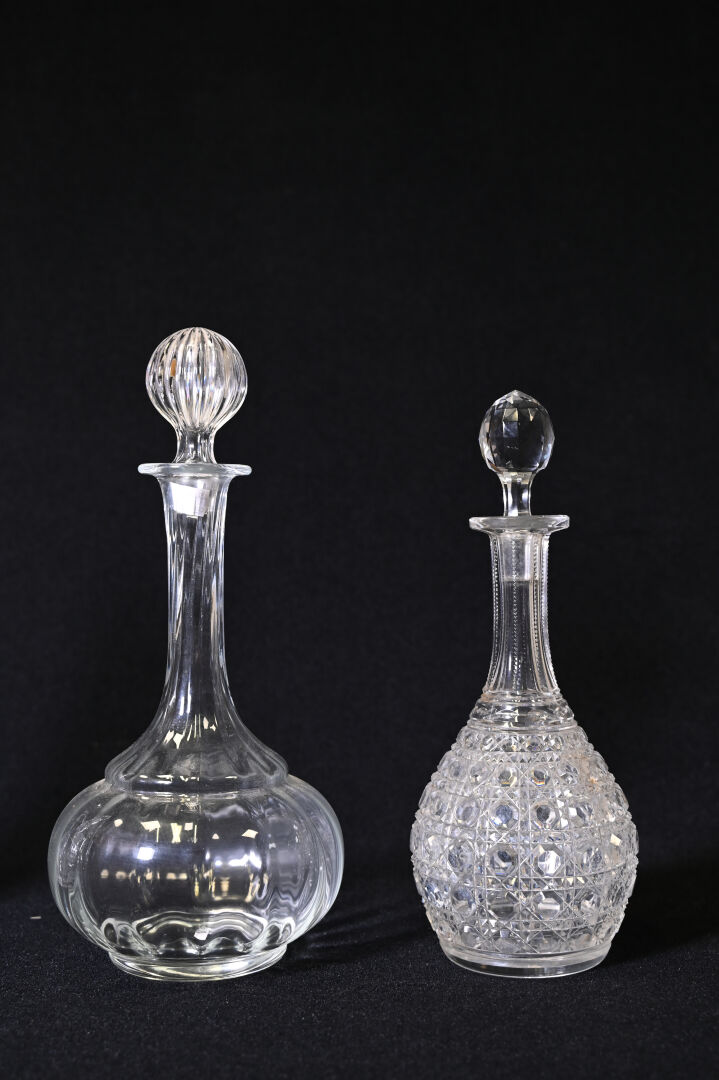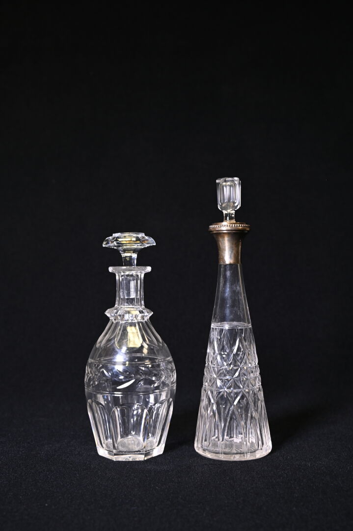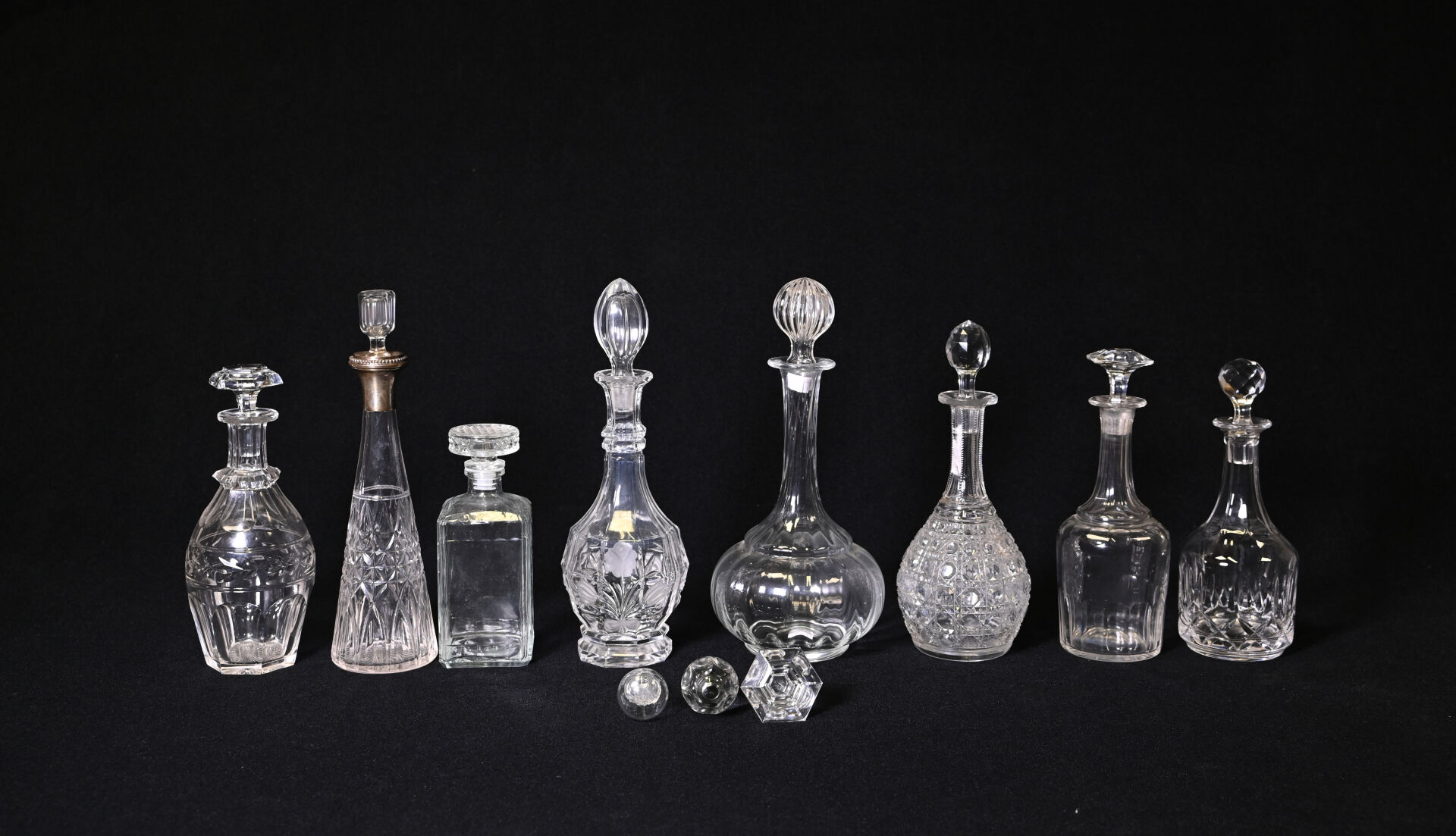 Ensemble de 8 carafes et bouchons, en cristal taillé ou moulé et verre (quelques égrenures).