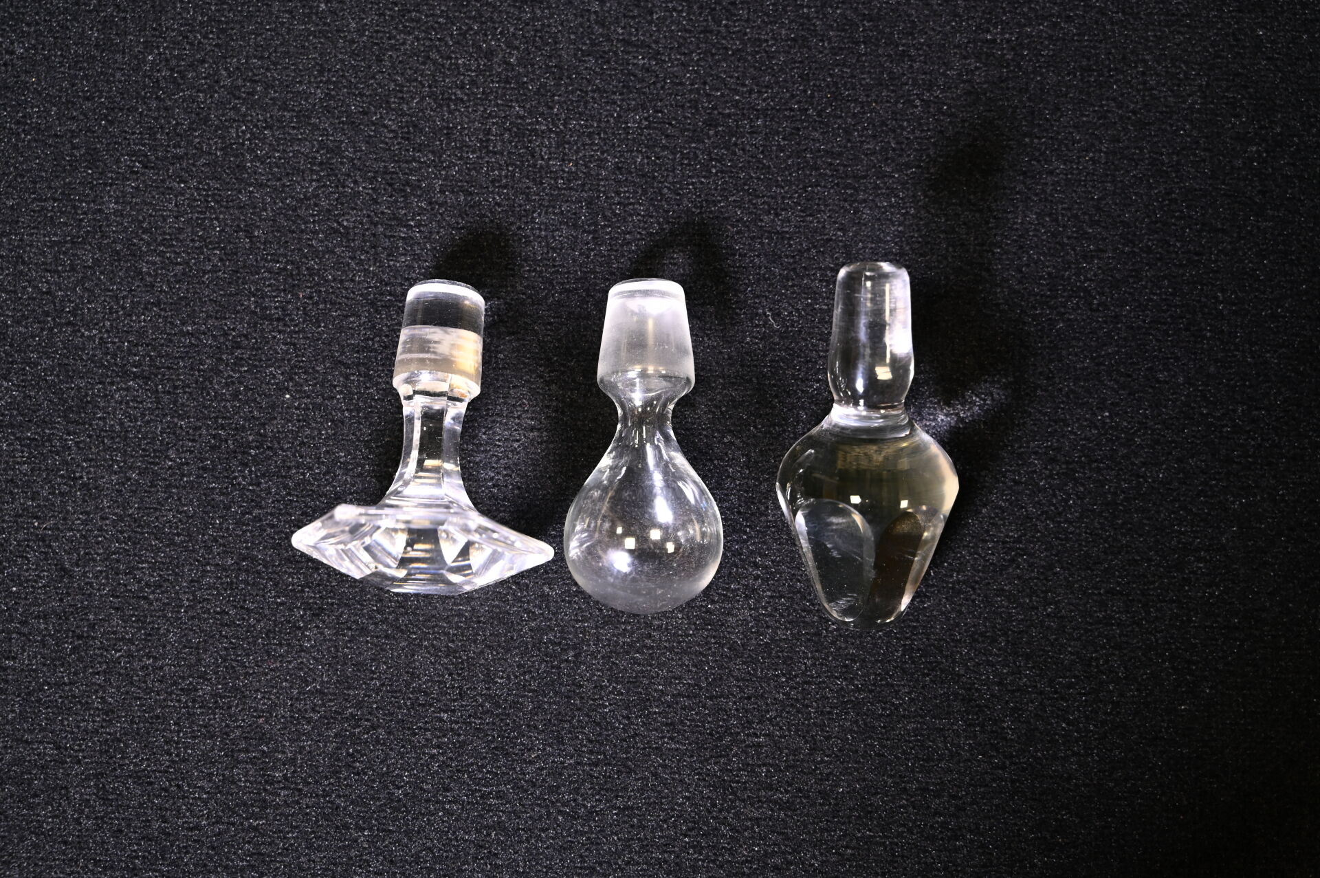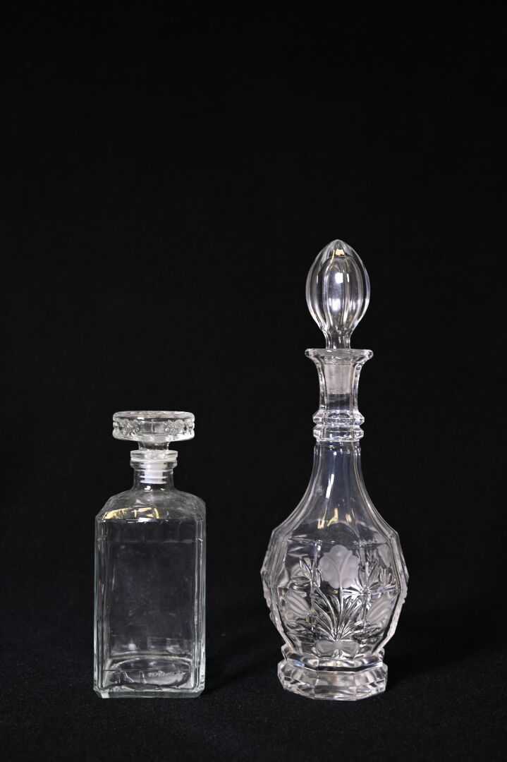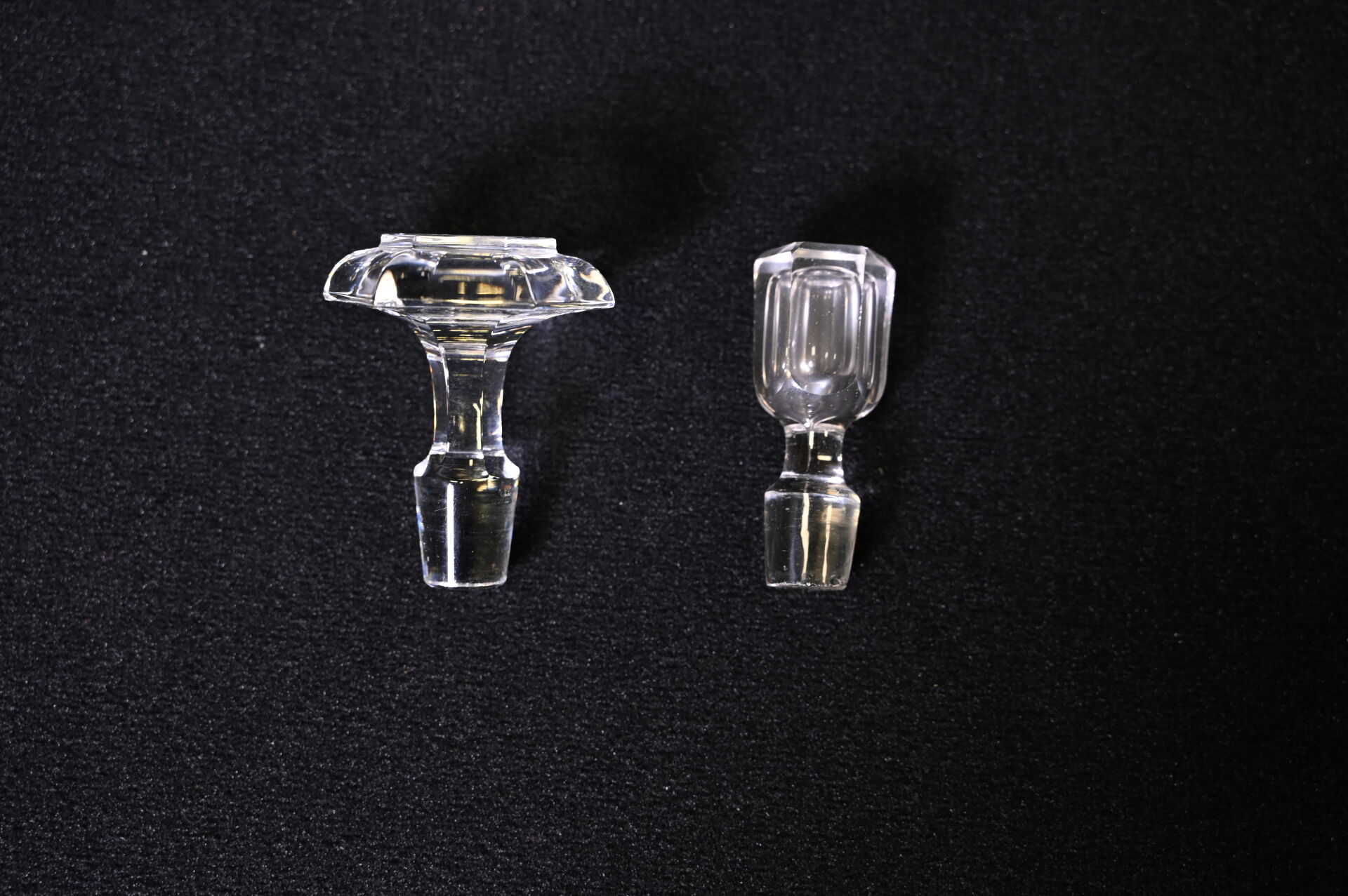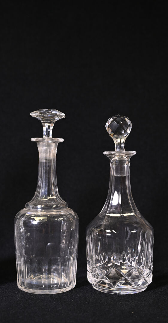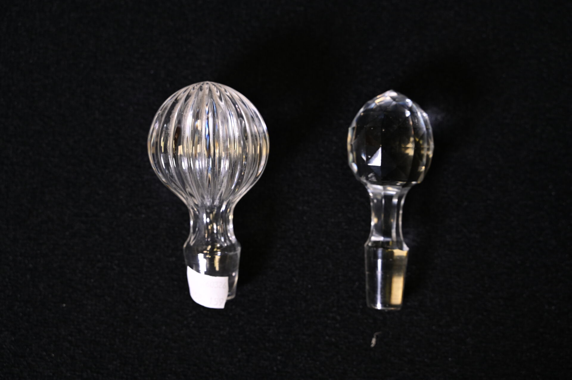 Ensemble de 8 carafes et bouchons, en cristal taillé ou moulé et verre (quelques égrenures).