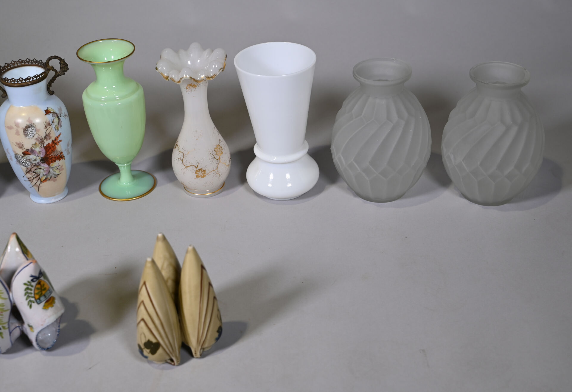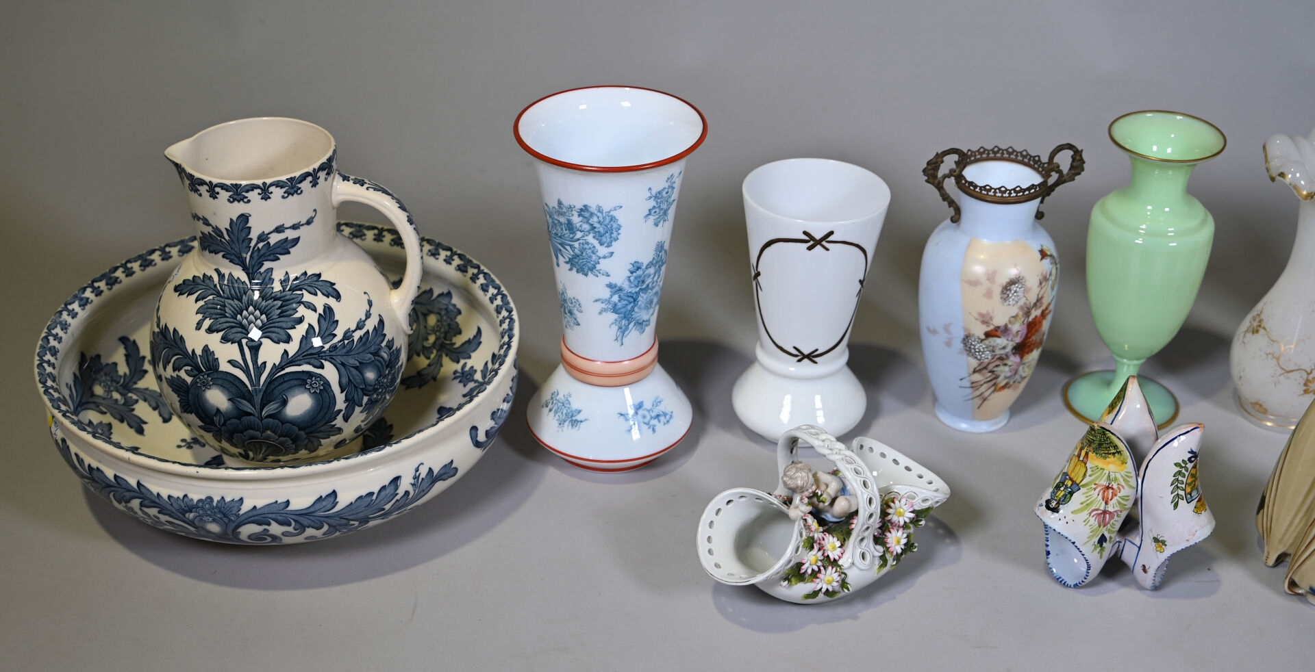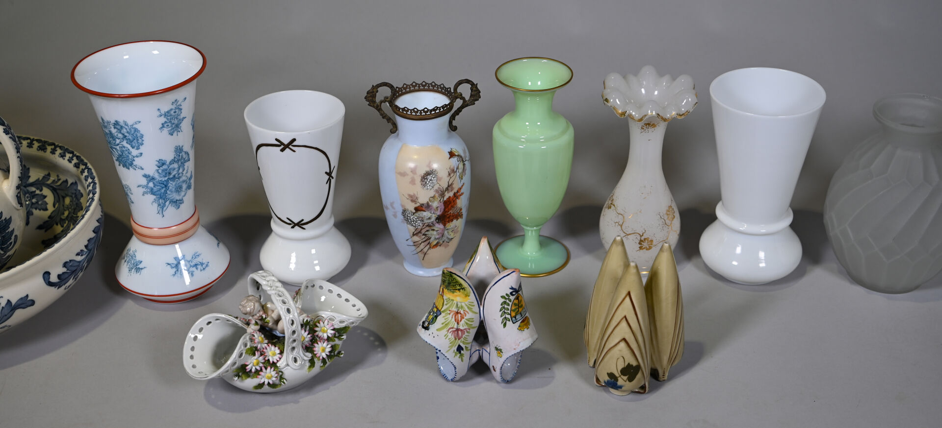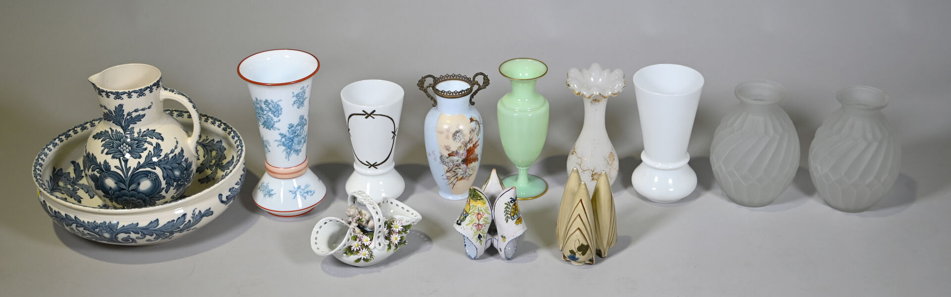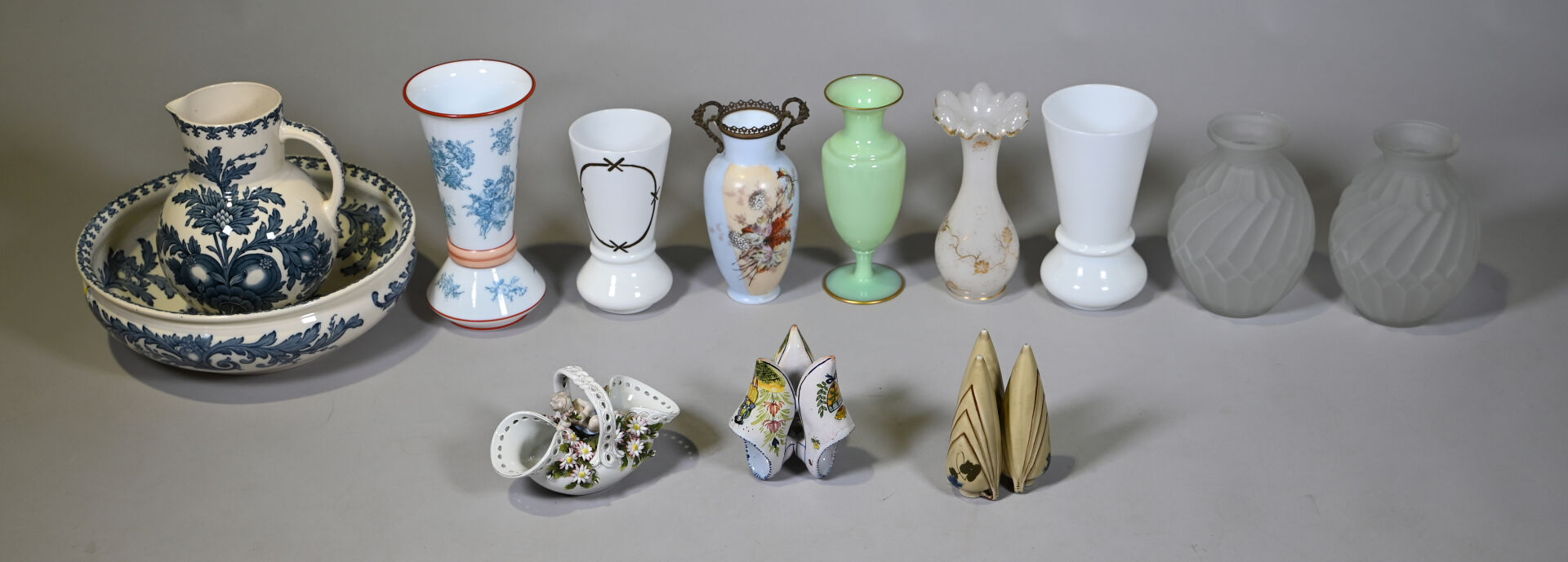 Ensemble de 8 vases en opaline et verre dont une paire de vases en verre clair, un vert, un bleuté, un à haut col à corole à décor de fleurs. On joint : SARREGUEMINES, Broc et son bassin et son bassin à décor en bleu sur fond crème. (fêles). Haut. du broc : 27,5 cm. Haut. du bassin : 13 cm. Diam. du bassin : 38,5 cm. Ainsi qu’un panier et deux petits vases en porcelaine et faiënce. (usures et égrenures). Haut. du plus grand. : 29,5 cm.