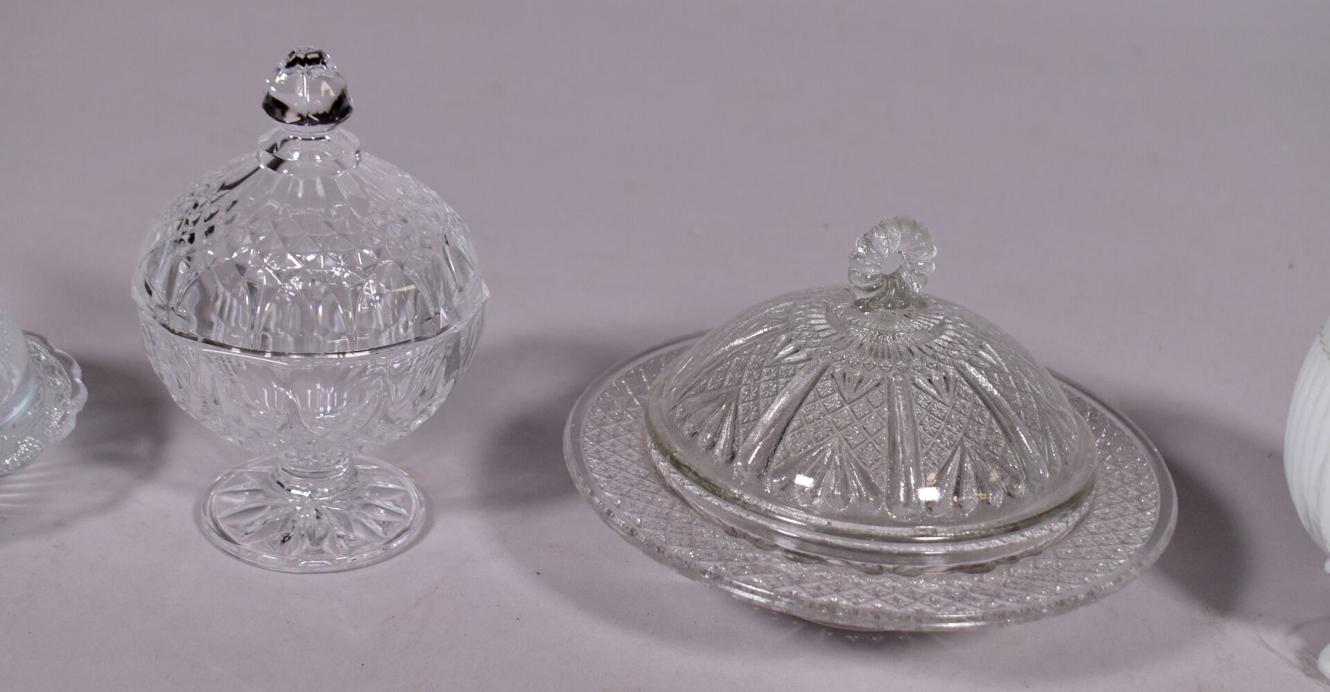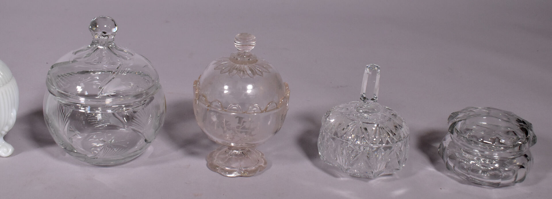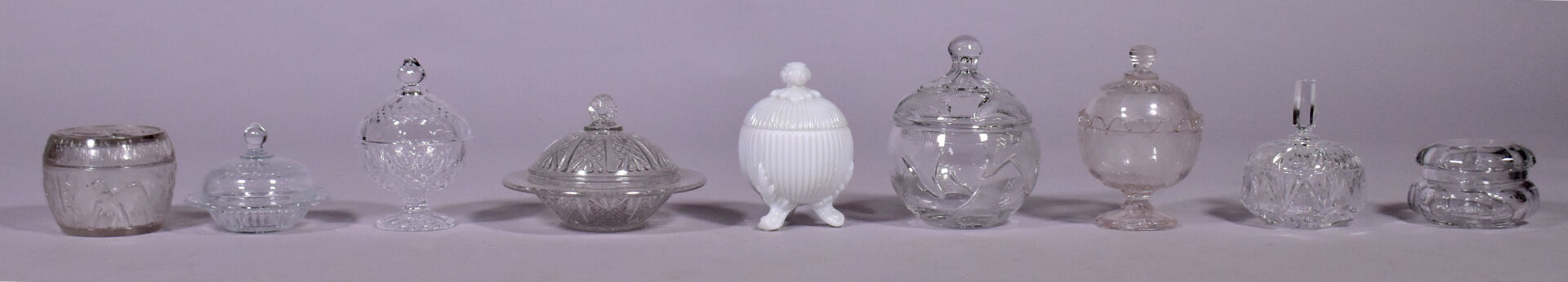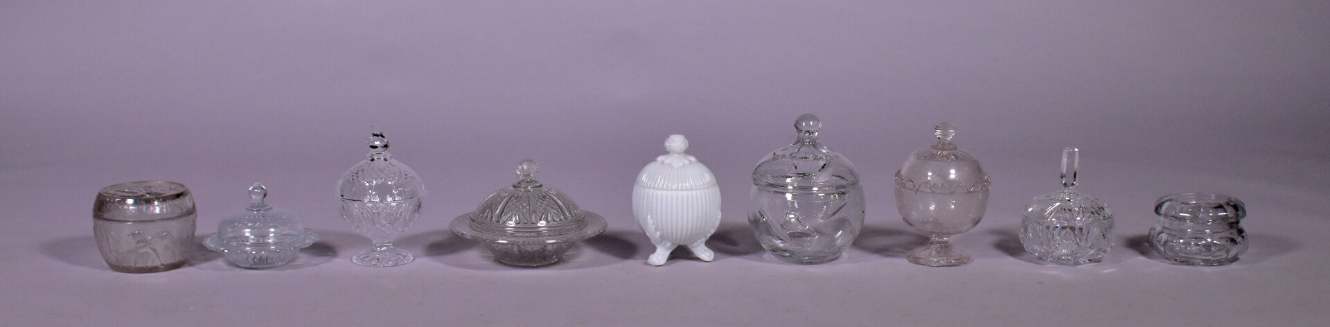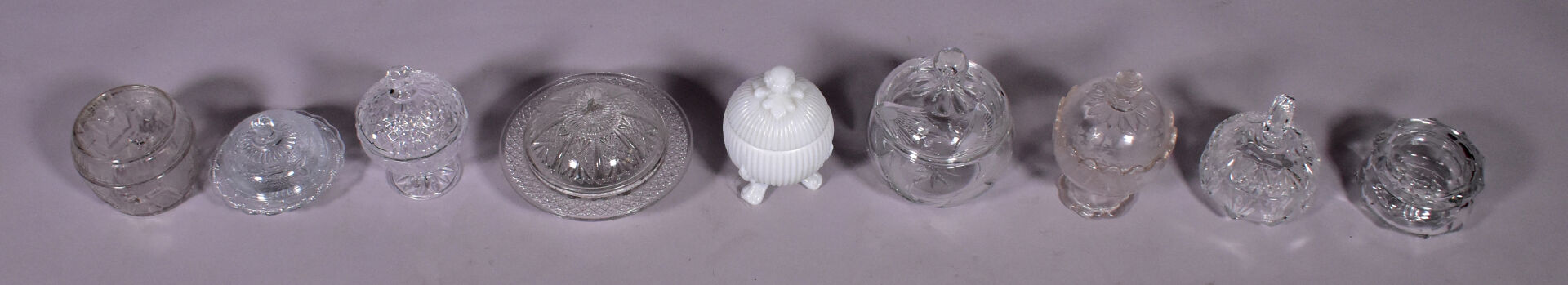 Ensemble de 9 bonbonnières en verre, opaline ou cristal taillé (usures et égrenures). .
