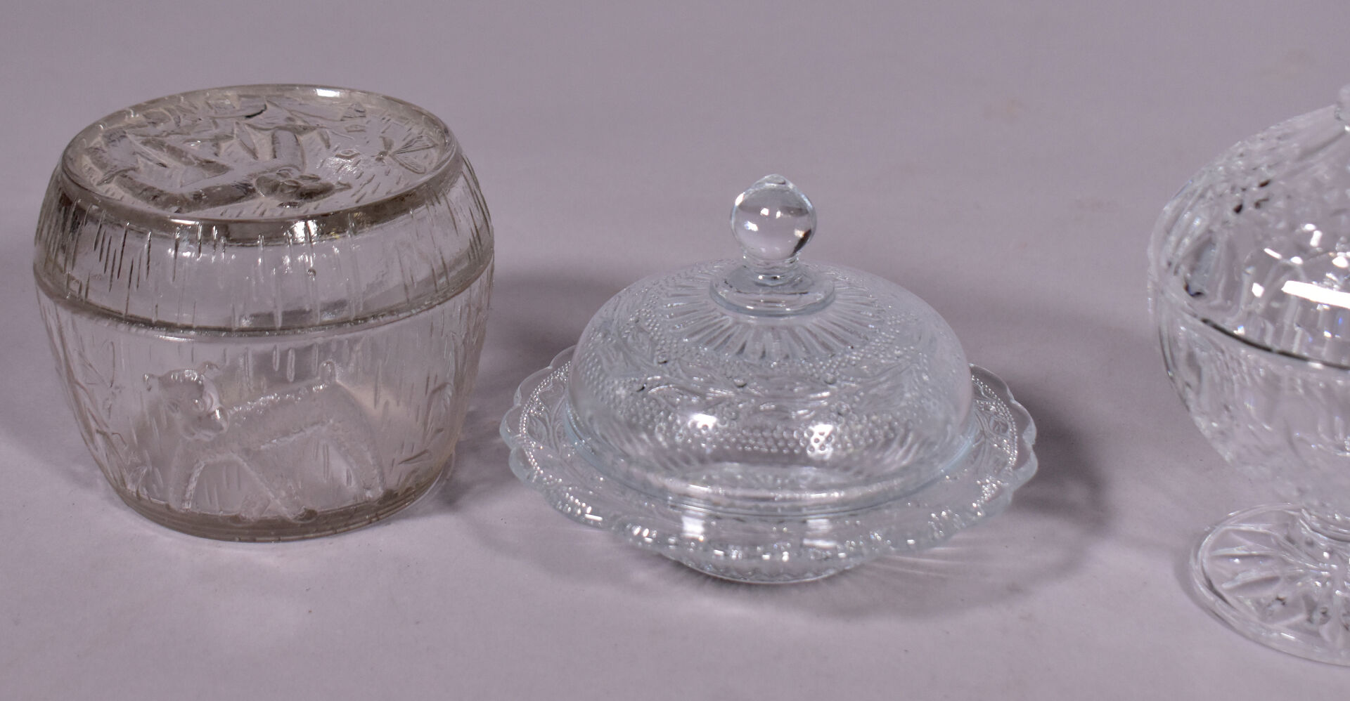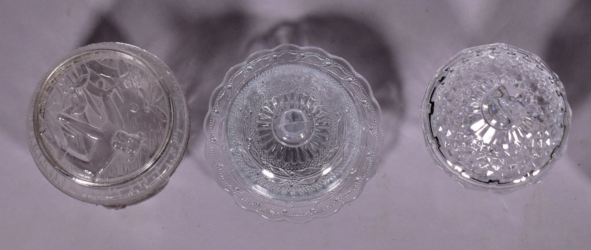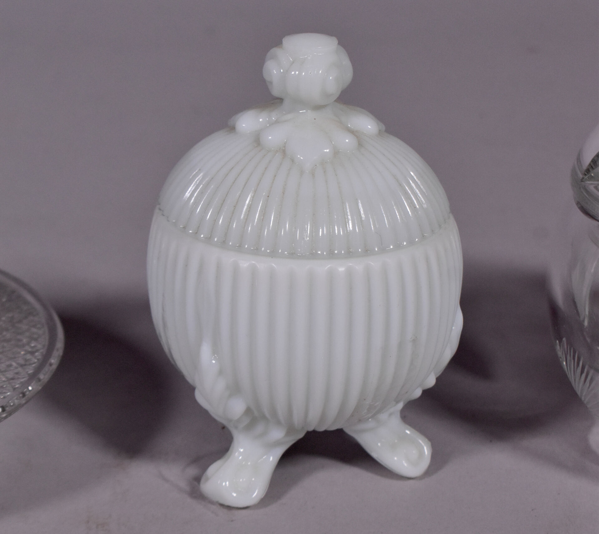 Ensemble de 9 bonbonnières en verre, opaline ou cristal taillé (usures et égrenures). .