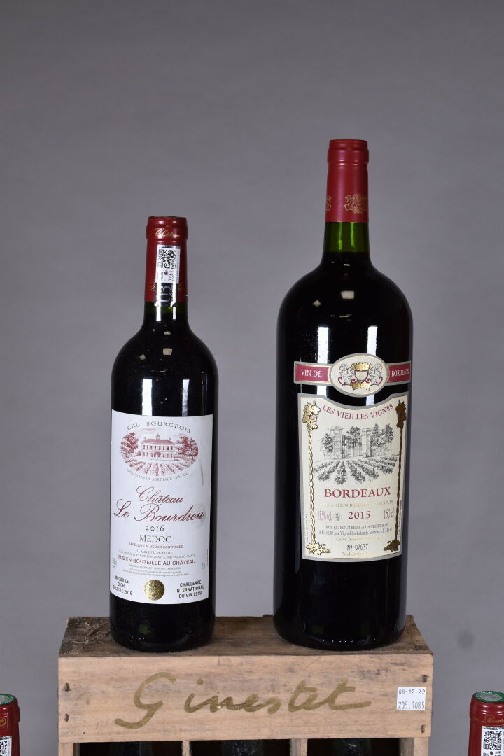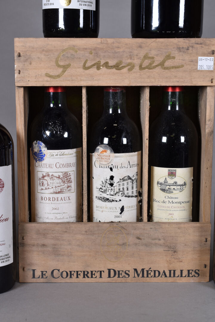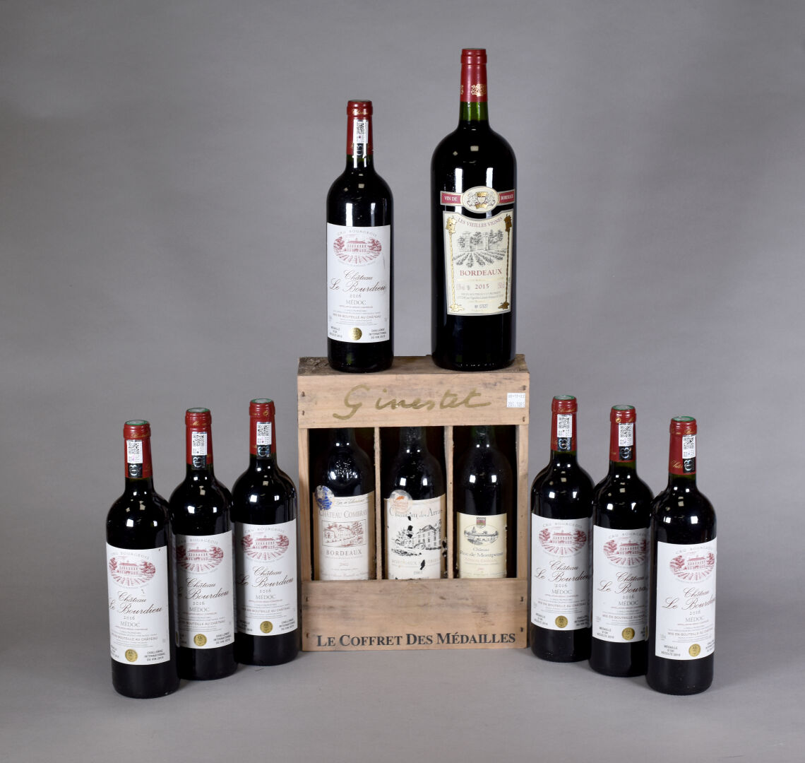 Ensemble de 9 bouteilles et 1 Magnum soit 6 CHATEAU LE BOURDIEU Médoc 2016, 1 coffret des médailles comprenant 1 bouteille de CHATEAU COMBRAY Bordeaux 2002, 1 bouteille CHATEAU DES ARRAS, Bordeaux suppérieur 2001 et &CHATEAU ROQUES DE MONTPEZAT, Côtes de Castillon 2003. Magnum LES VIEILLES VIGNES Bordeaux 2015.