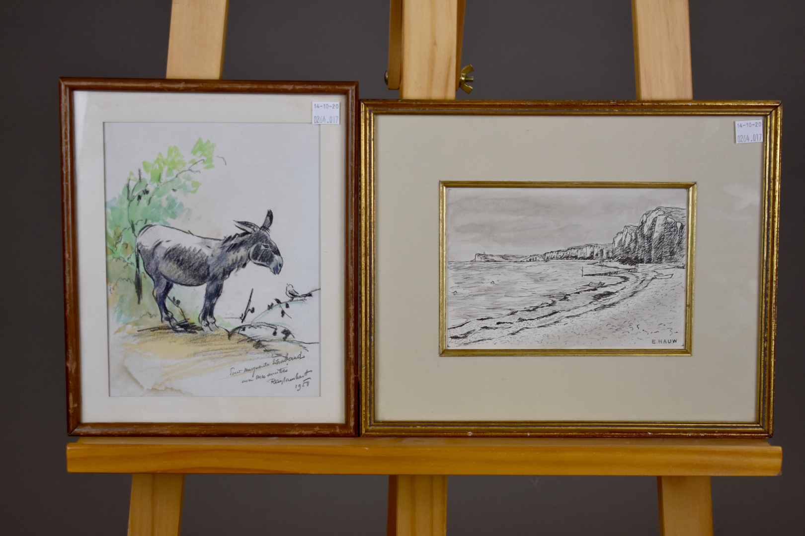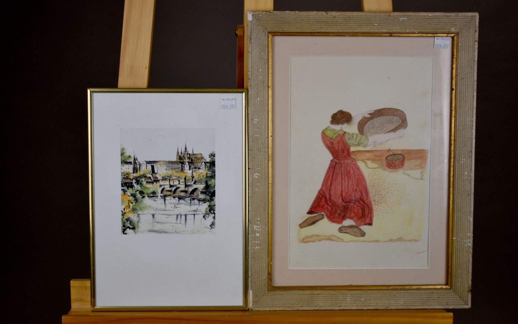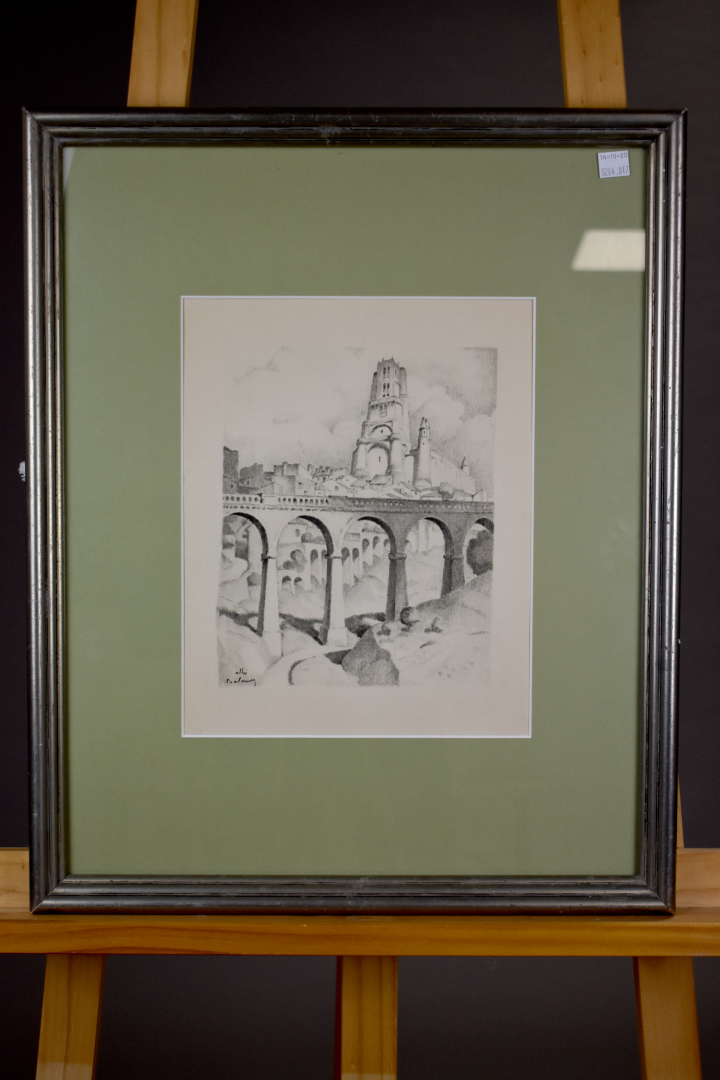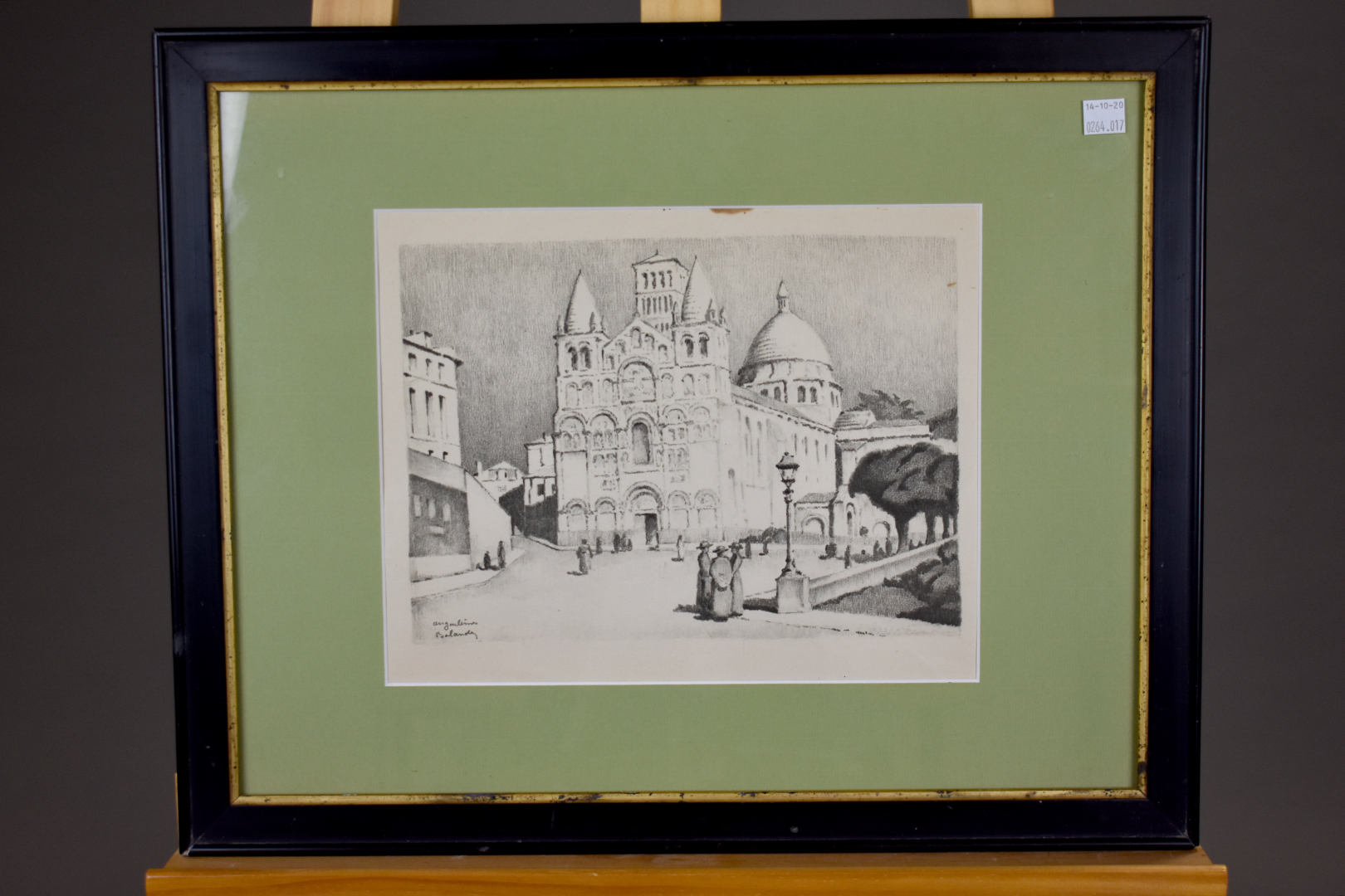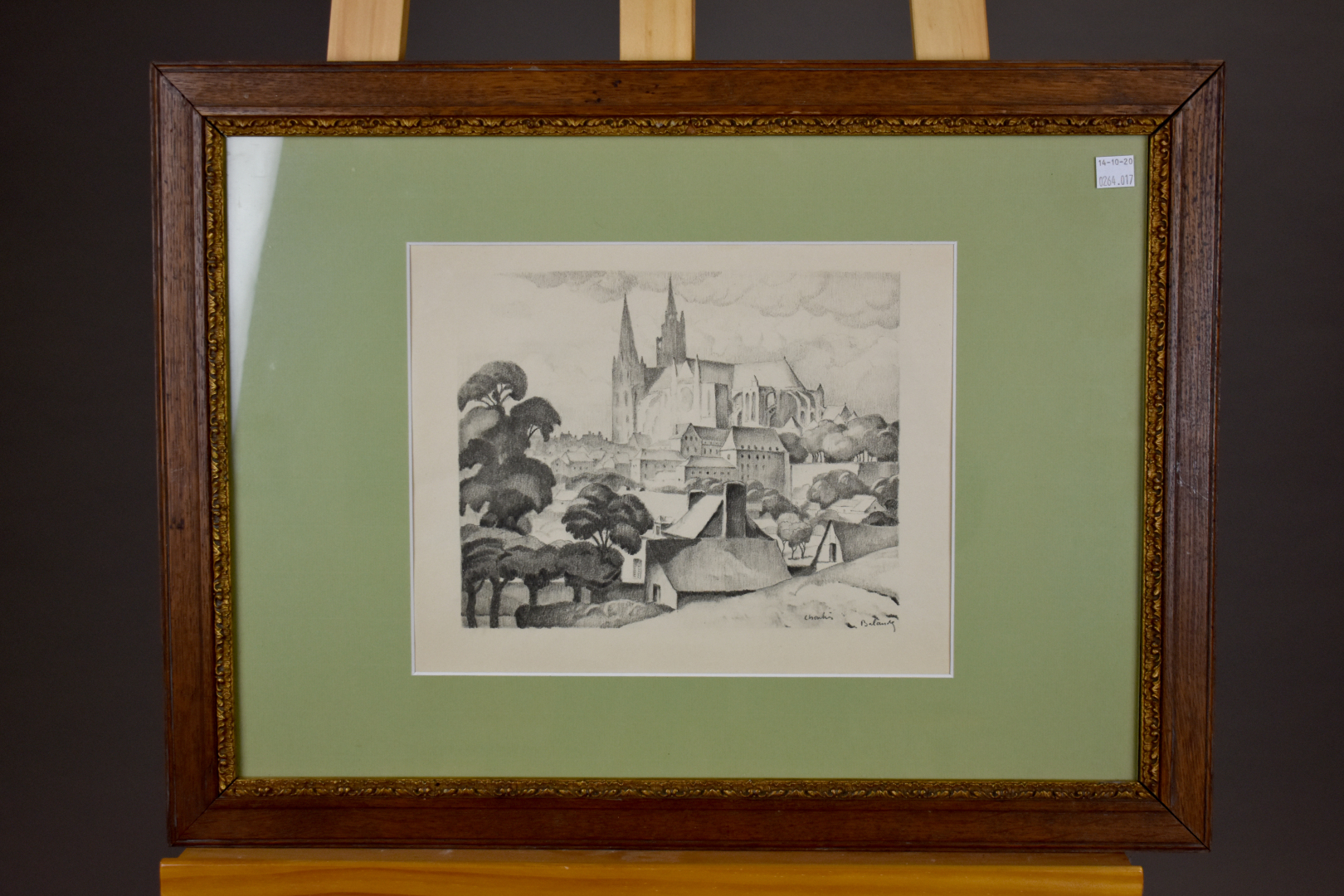 Ensemble de 9 pièces encadrées principalement des dessins et des gravures dont un dessin de Ray LAMBERT (1889 – 1969), trois lithographies de Gaston BALANDE (1880-1971) (Albi, Chartres, Angoulême) (quelques accidents aux cadres).