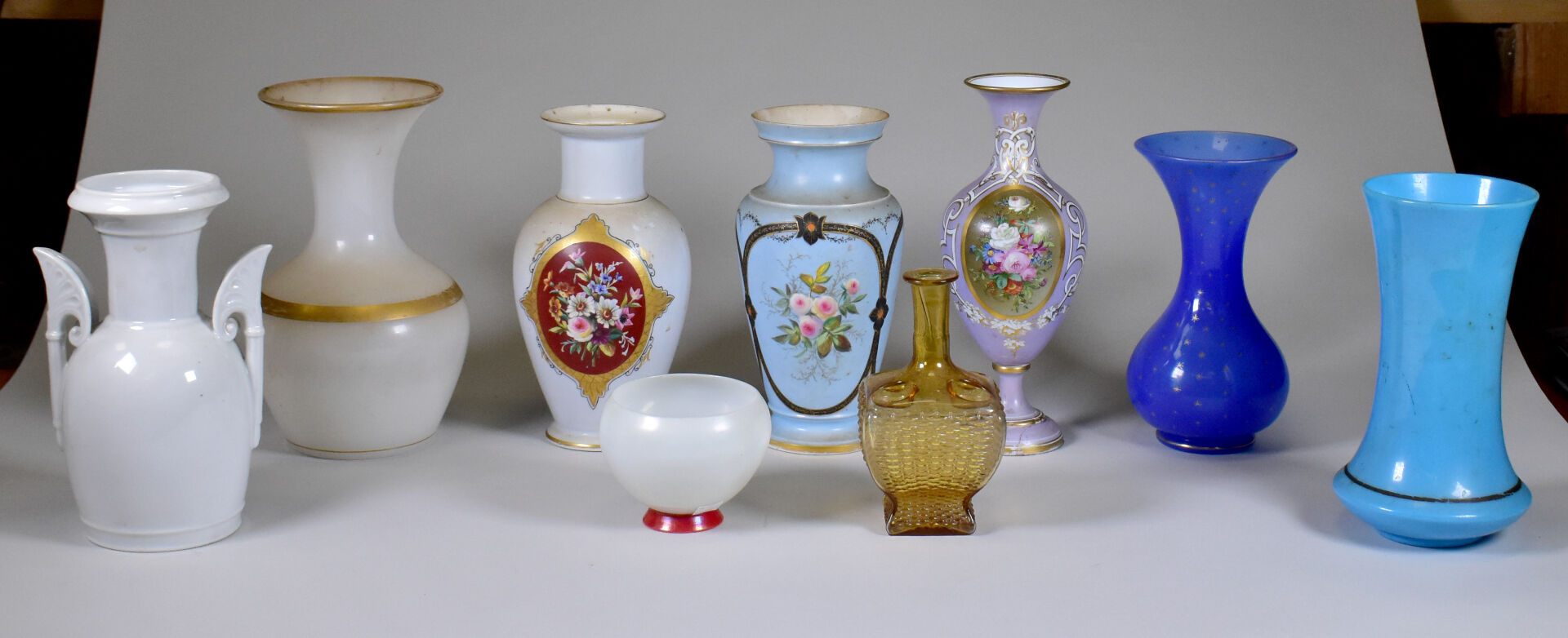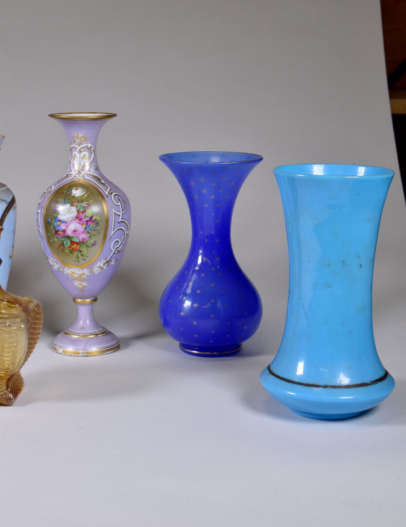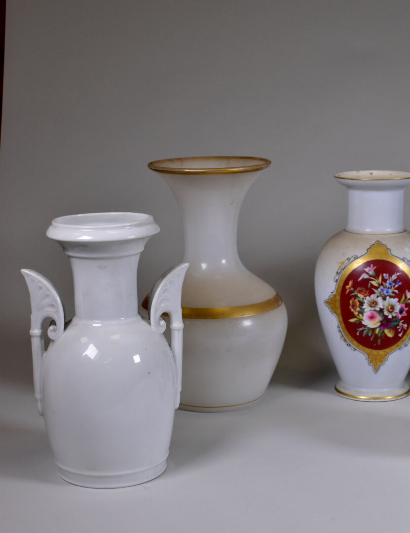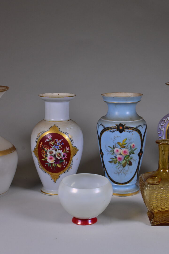 Ensemble de 9 vases en porcelaine et opaline (accidents, restaurations, éclats). Fin du XIXe et début du XXe siècle. Haut du plus grand : 30 cm.