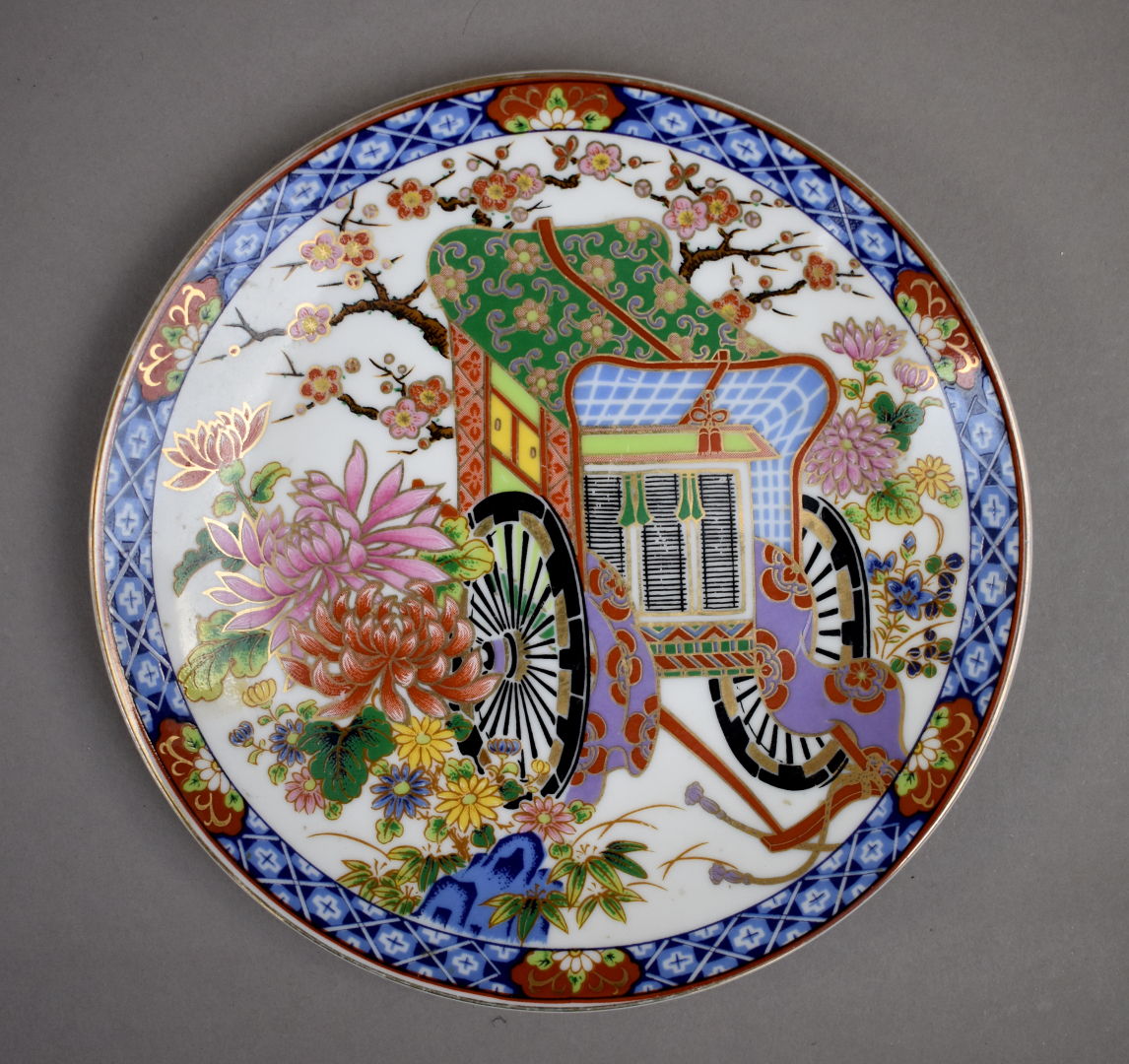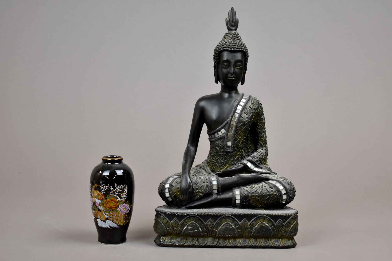 Ensemble de bibelots divers asiatiques dont partie de service à thé, Boudha, vase, assiettes. On join un réveil ALOUETTE JAPY (accident).