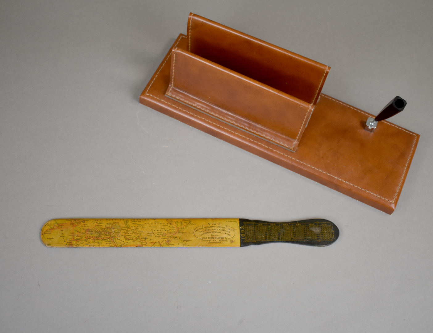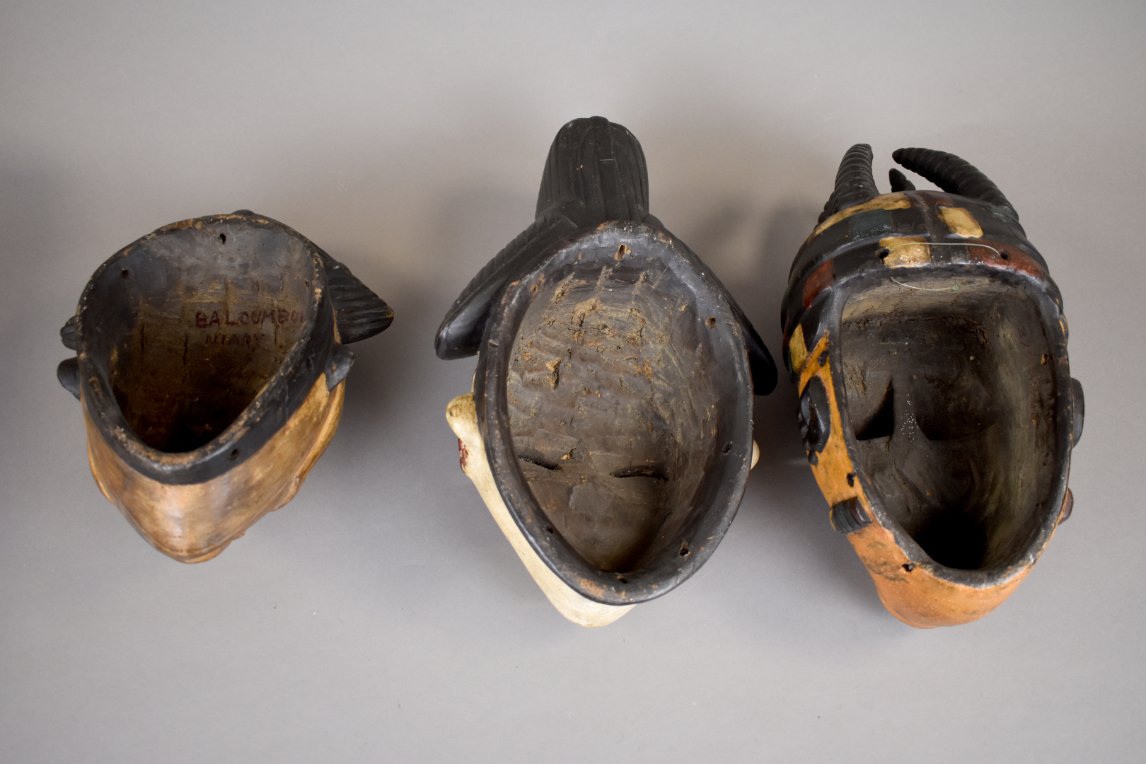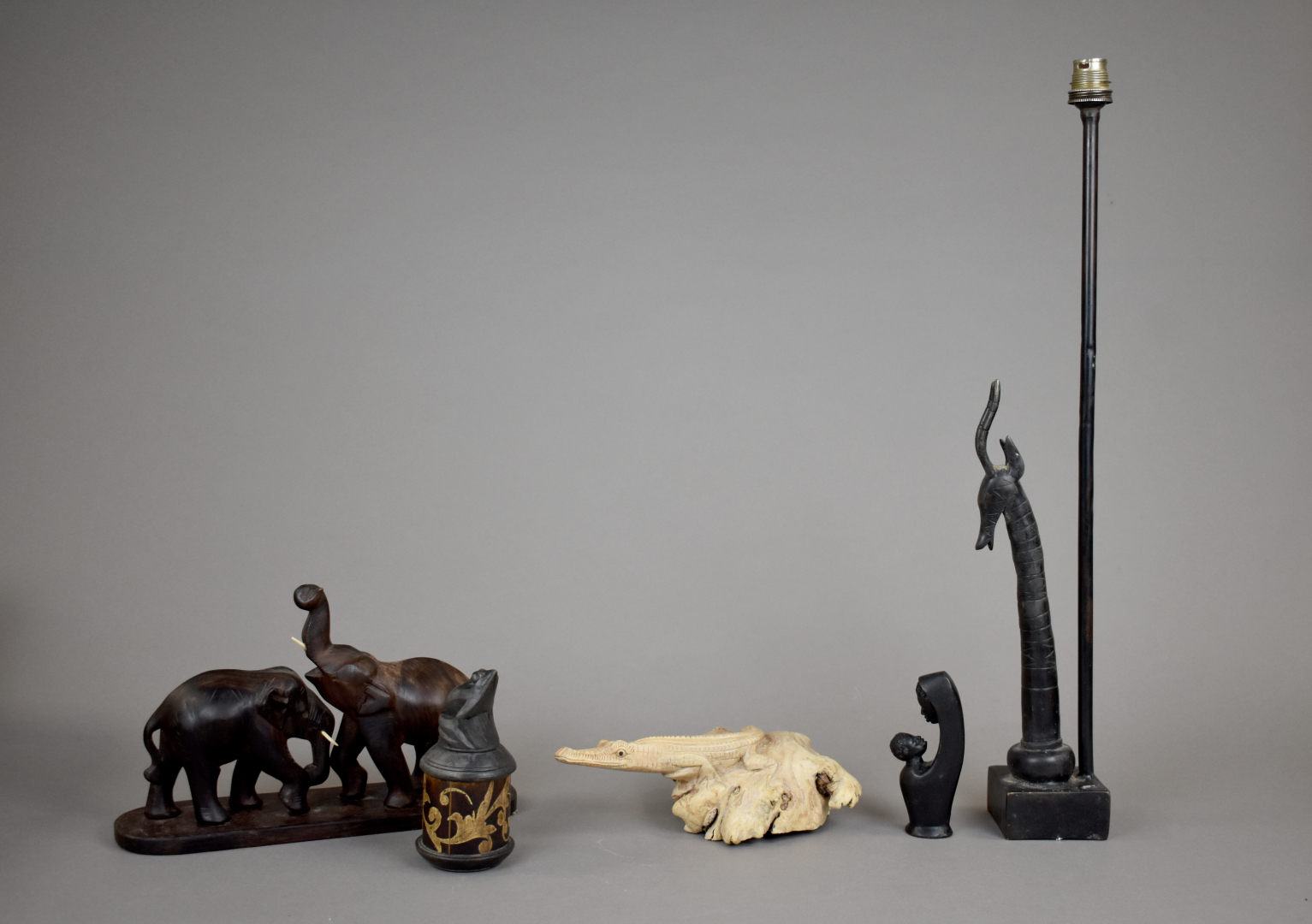 Ensemble de bibelots divers Asie et Afrique dont masques, éléphant en bois sculpté, coupe papier, necessaire de bureau gainé de cuir fauve, plateau laqué et divers. Deux cartons.