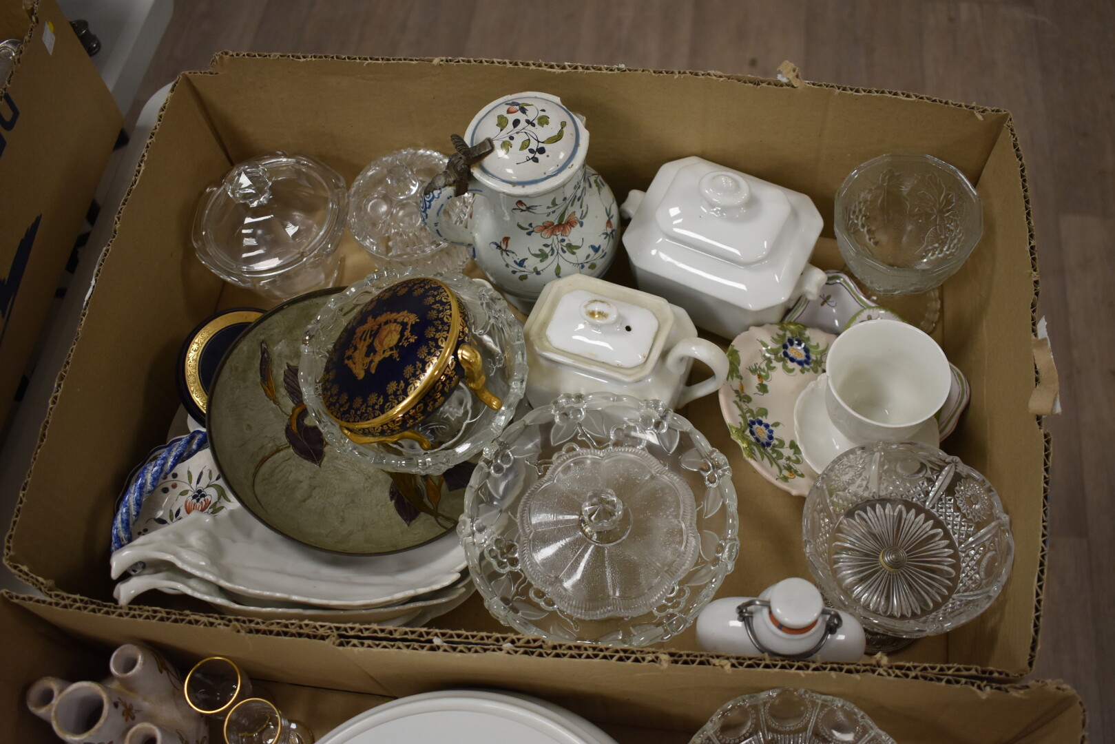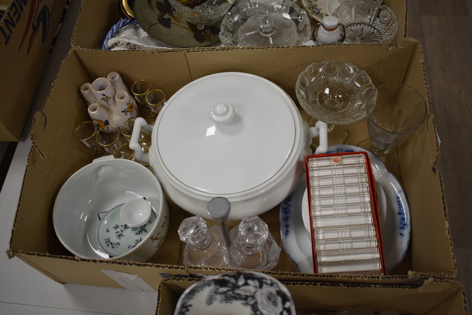 Ensemble de bibelots divers dont faïence martre tolosane (?) repose couteaux en verre, soupière en porcelaine, broc en faïence à décor fleuri en noir et divers. 3 cartons.