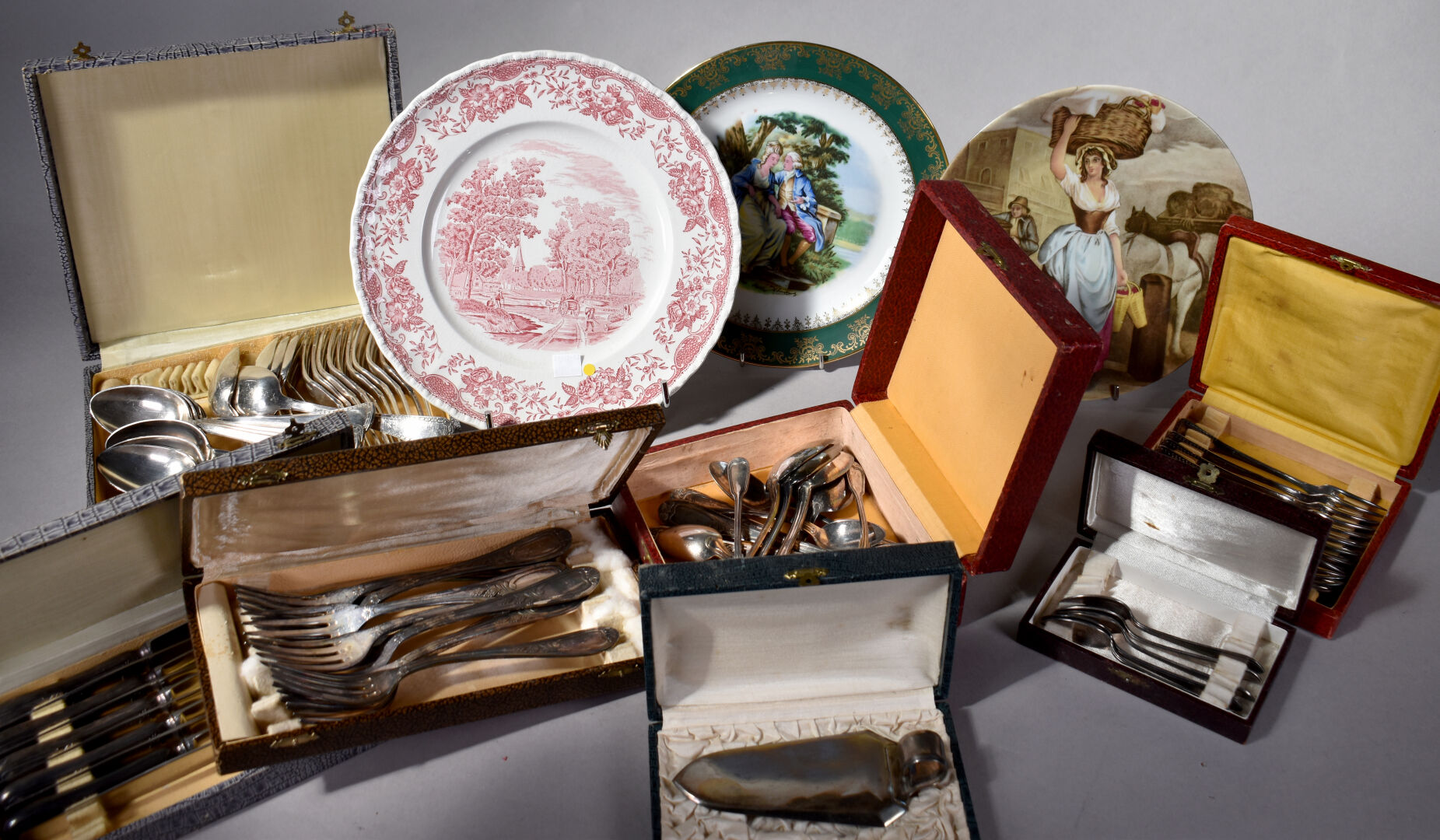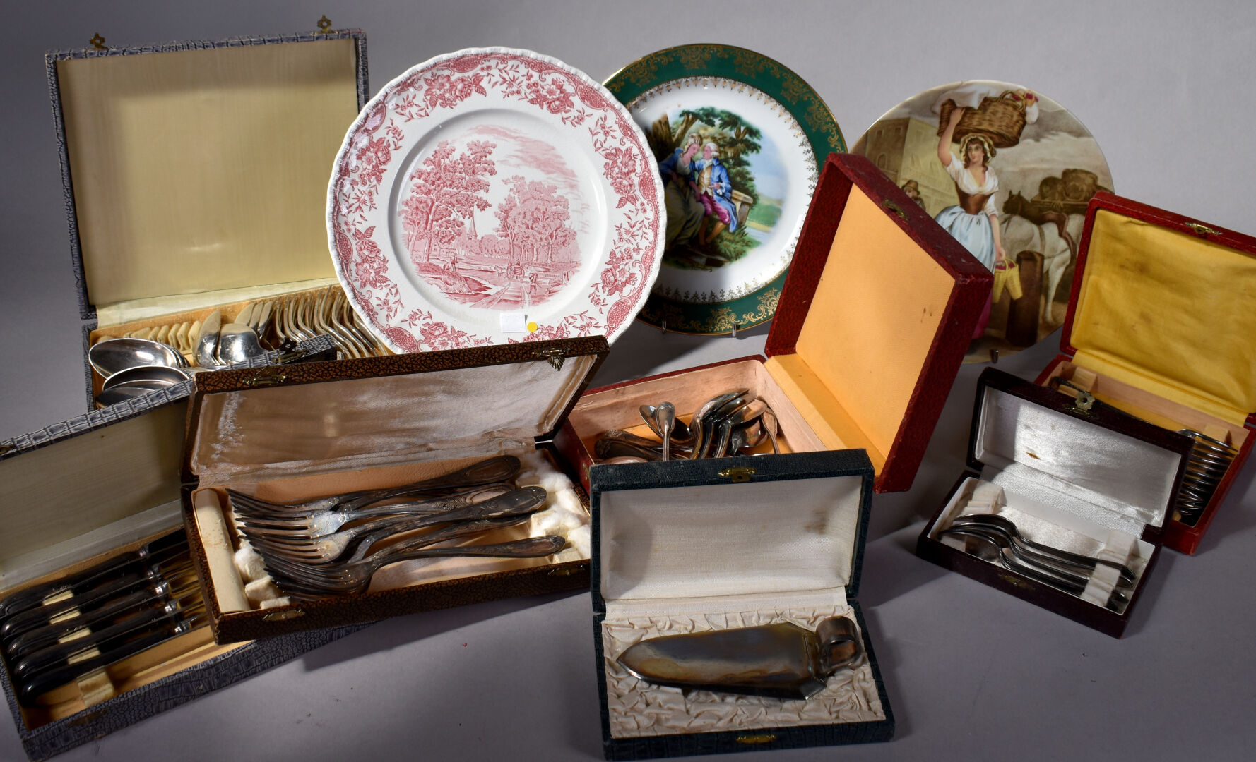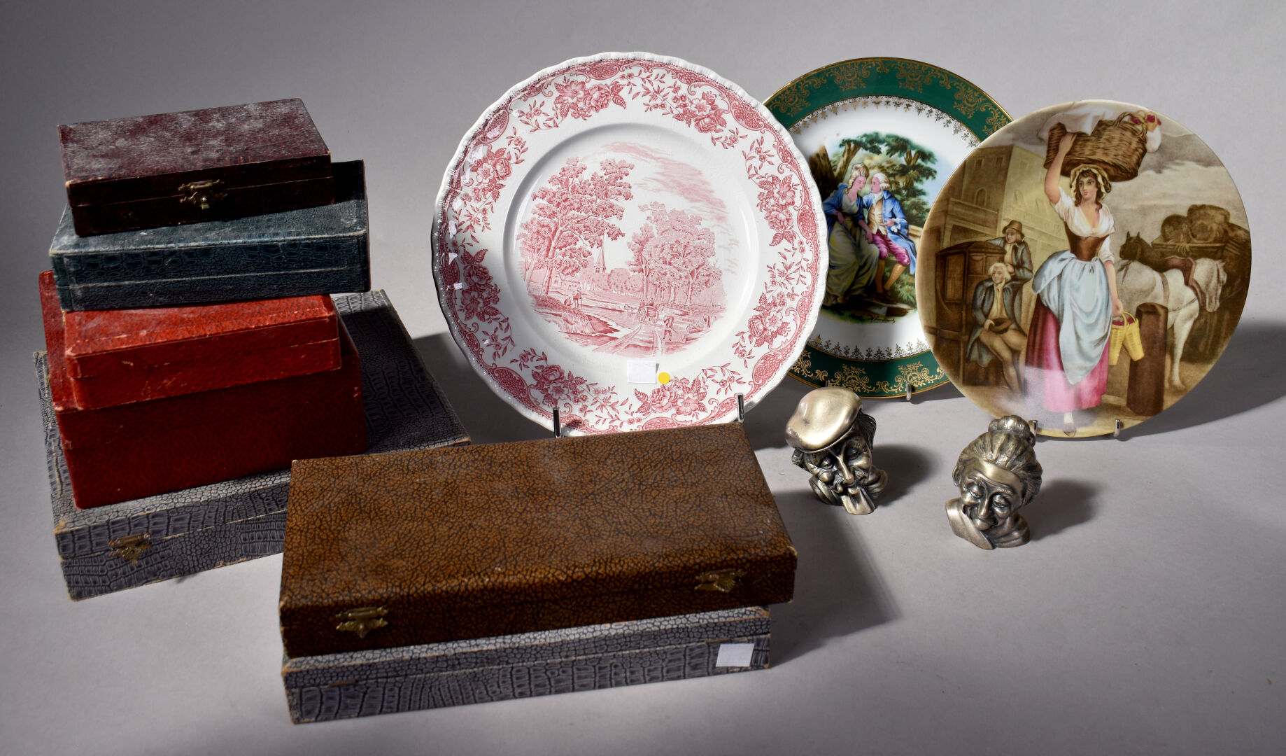 Ensemble de bibelots soit un lot de métal argenté dans des écrins, 3 assiettes en porcelaine de Limoges, et anglaise et deux petites figurines PELTRO en métal représentant des vieillards.