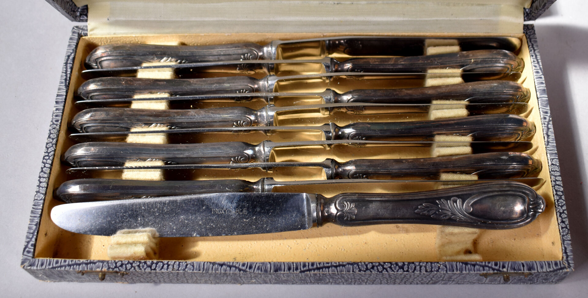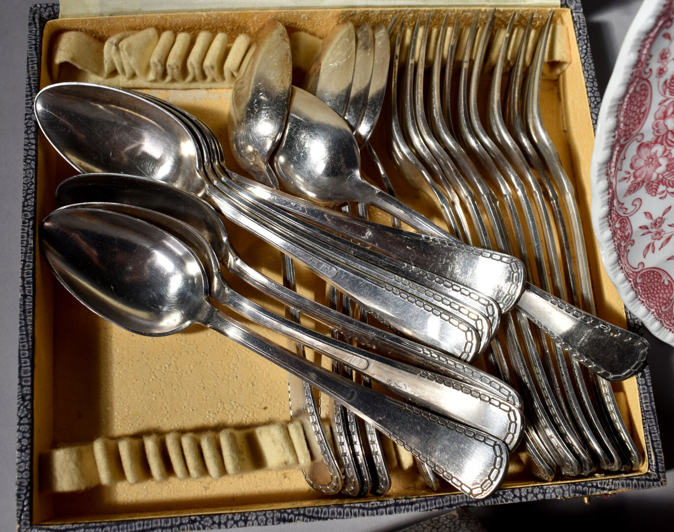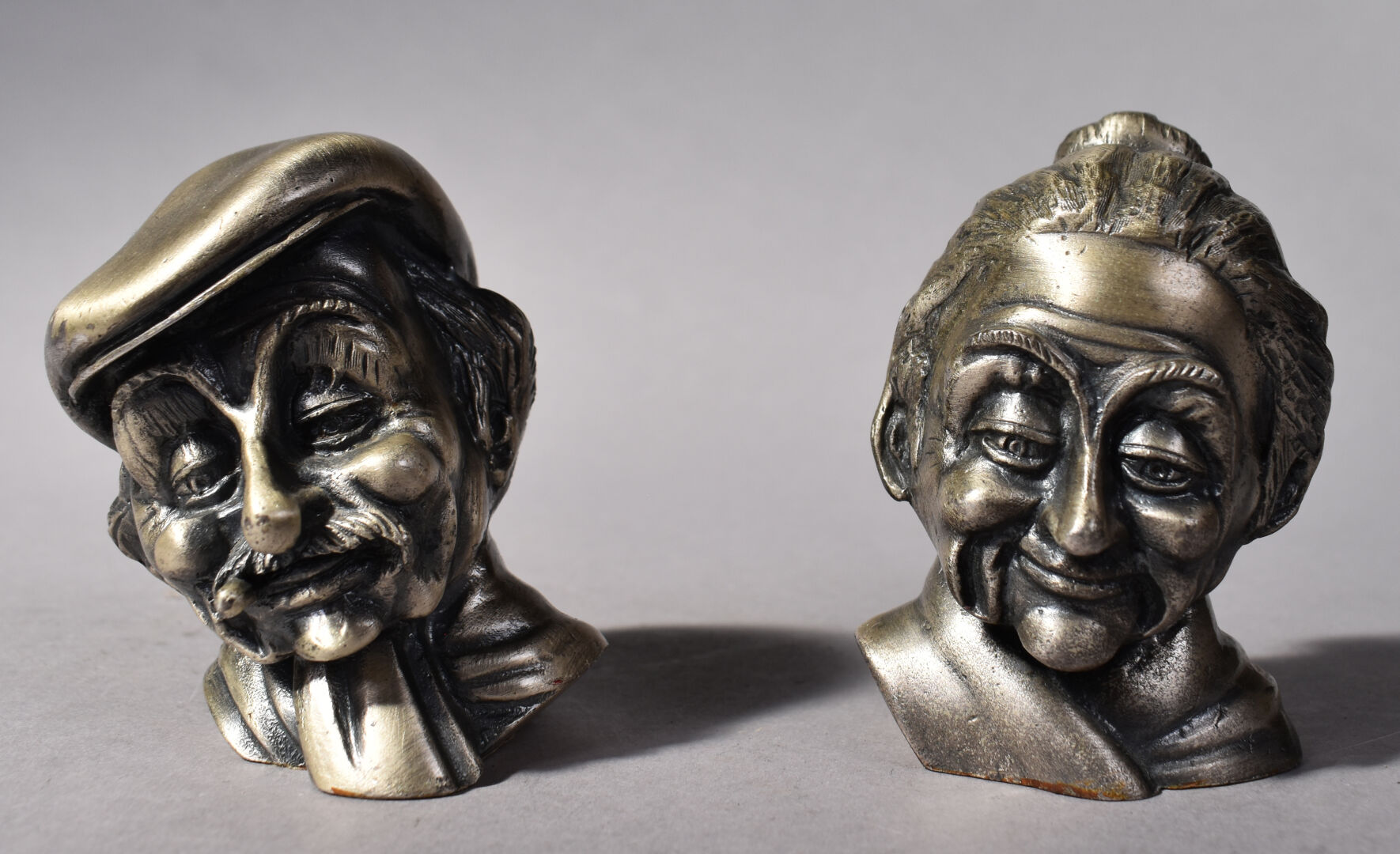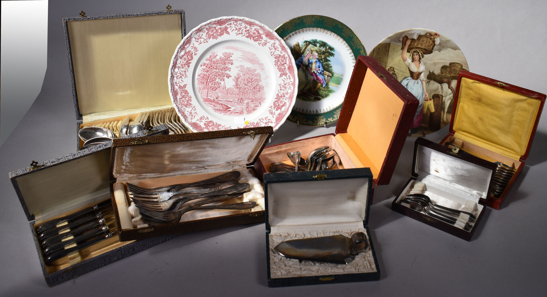 Ensemble de bibelots soit un lot de métal argenté dans des écrins, 3 assiettes en porcelaine de Limoges, et anglaise et deux petites figurines PELTRO en métal représentant des vieillards.