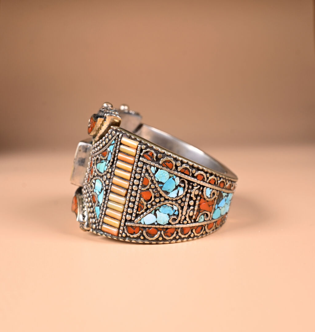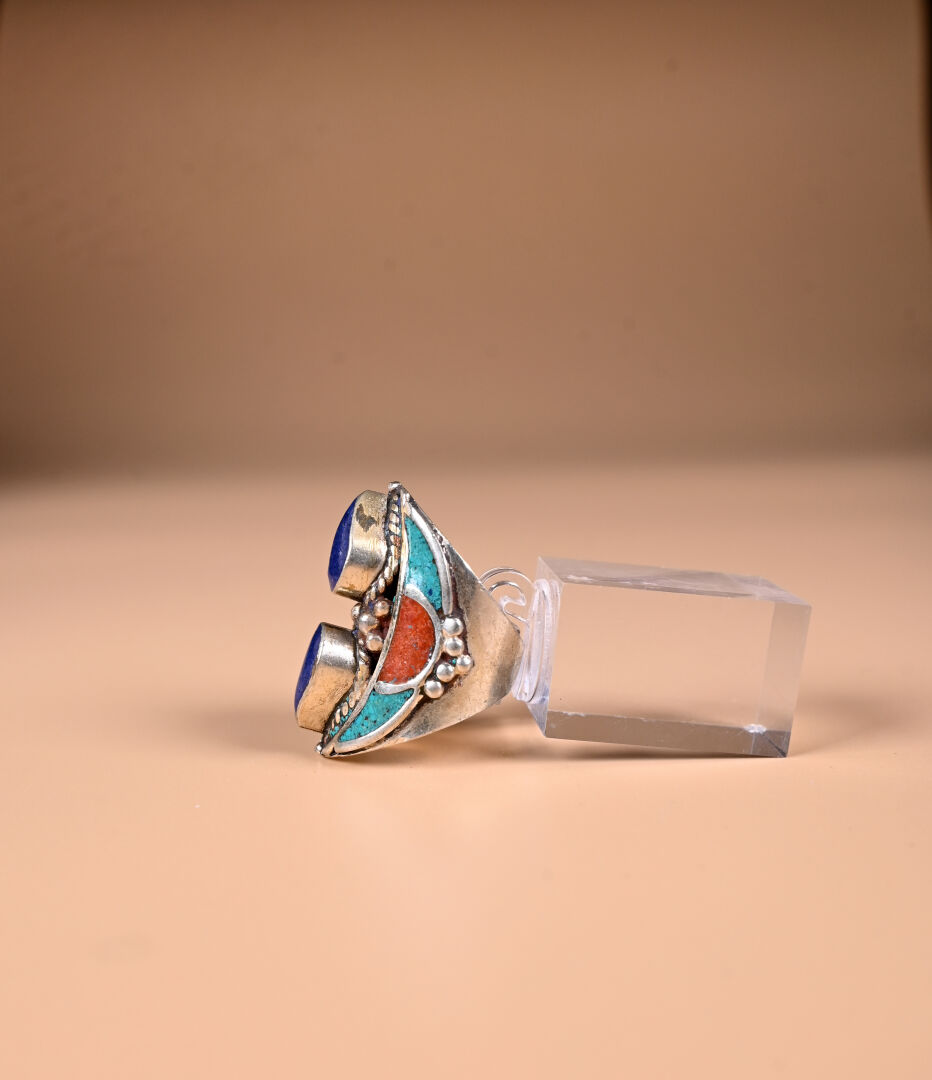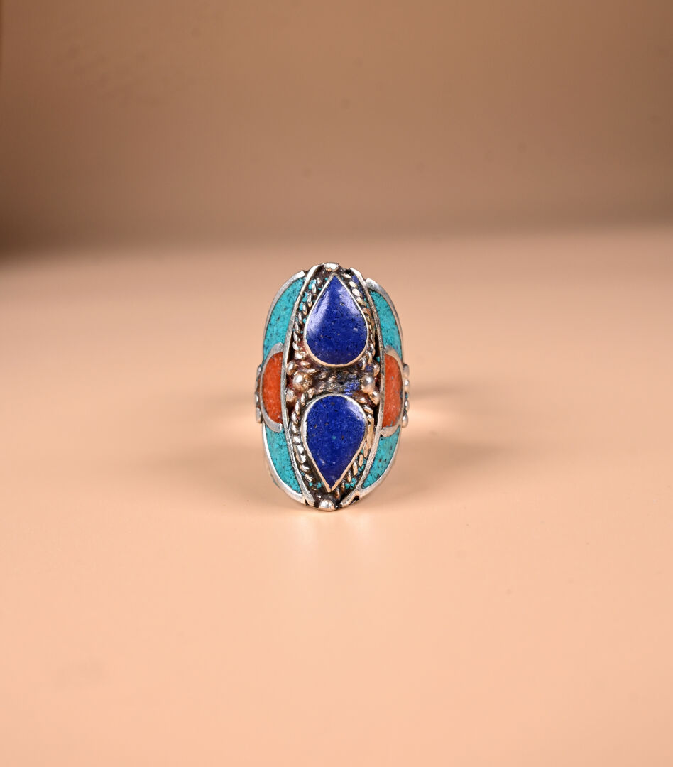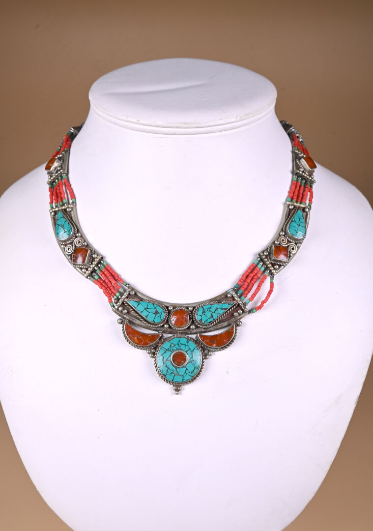 Ensemble de bijoux berbères en métal argenté et mosaïque de turquoise et de cornaline comprenant un large bracelet manchette (faiblesse au fermoir), un collier plastron et une bague avec deux poires de pais lazuli. TDD. : 57.