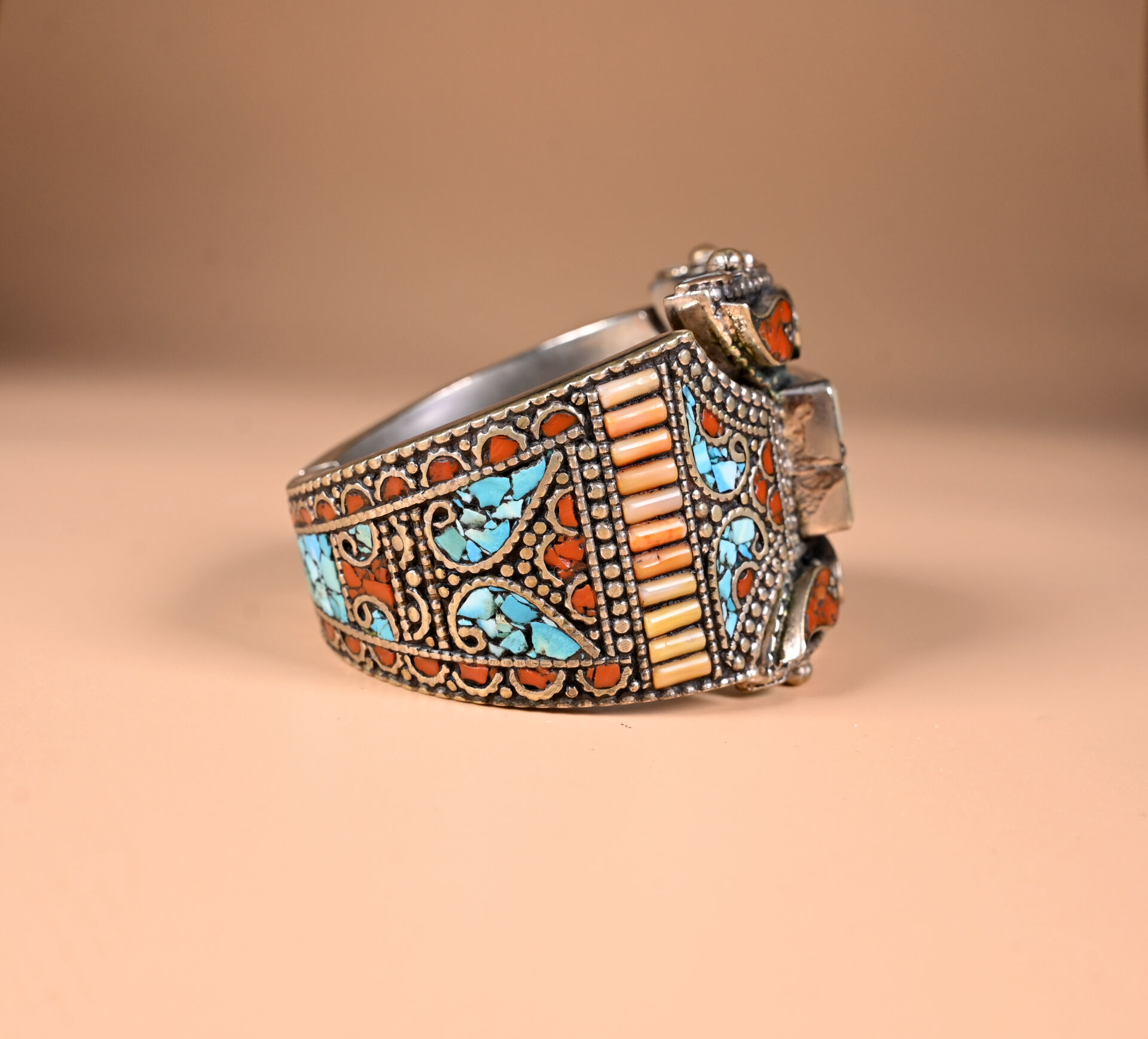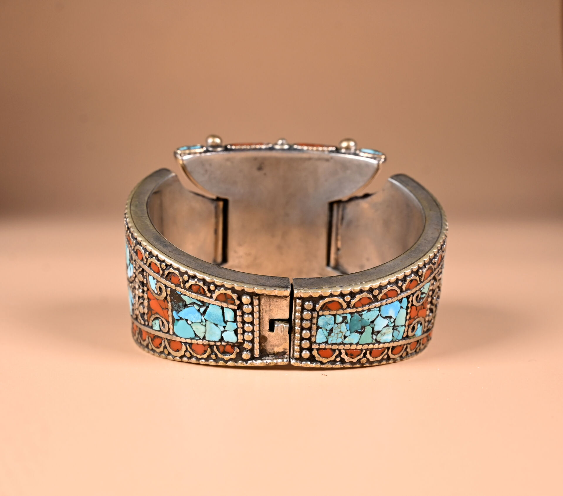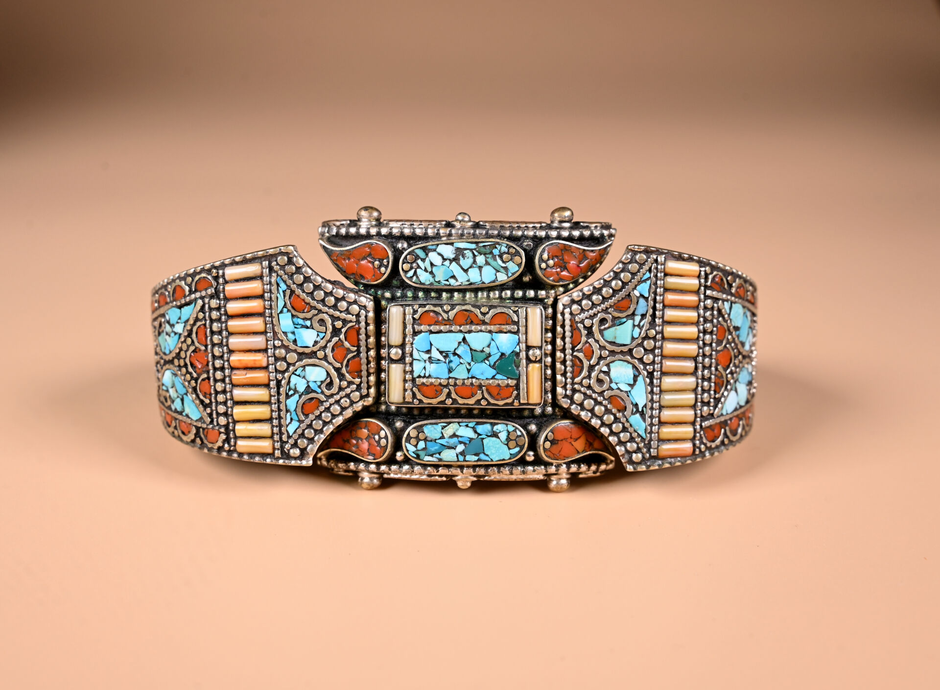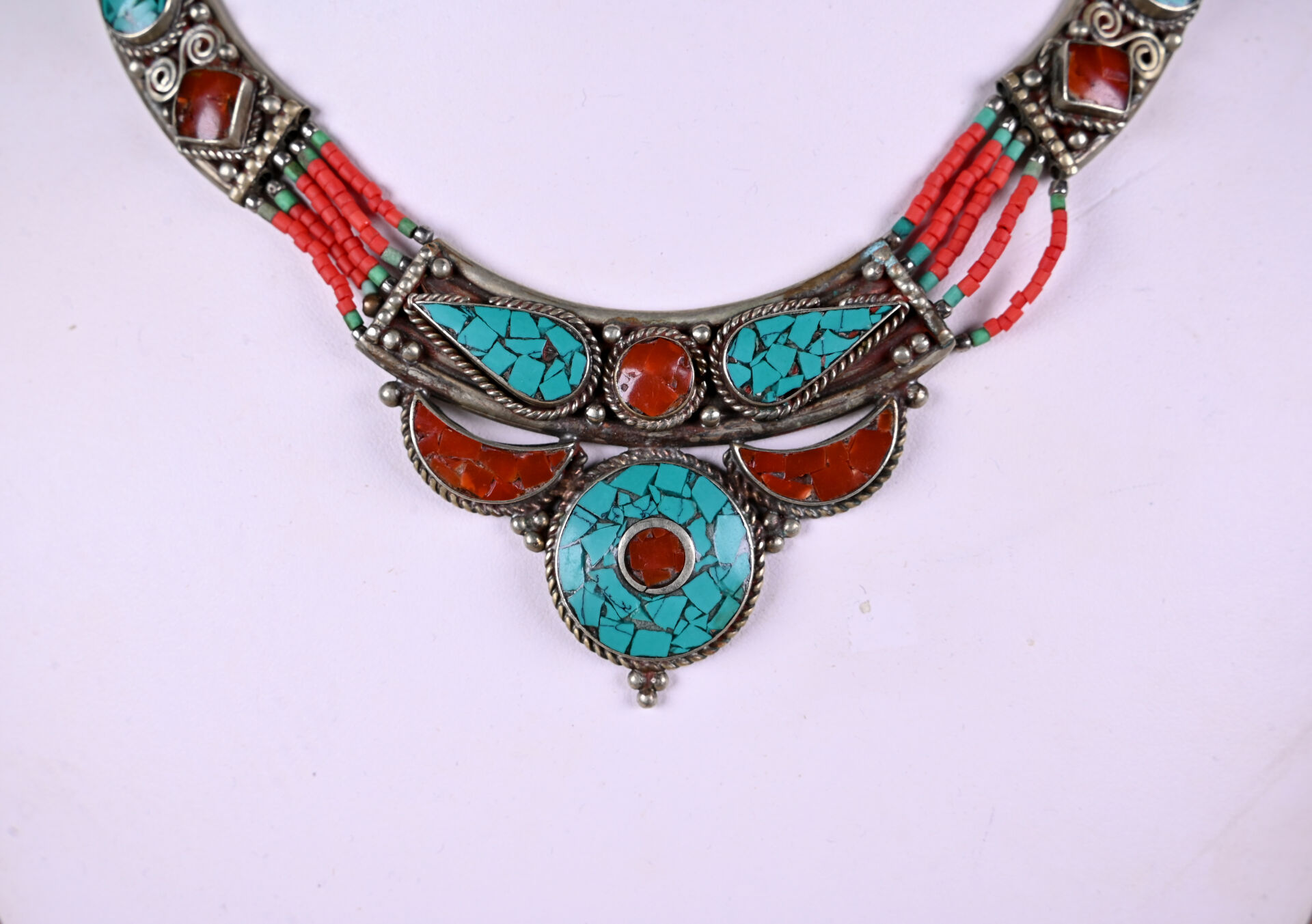 Ensemble de bijoux berbères en métal argenté et mosaïque de turquoise et de cornaline comprenant un large bracelet manchette (faiblesse au fermoir), un collier plastron et une bague avec deux poires de pais lazuli. TDD. : 57.