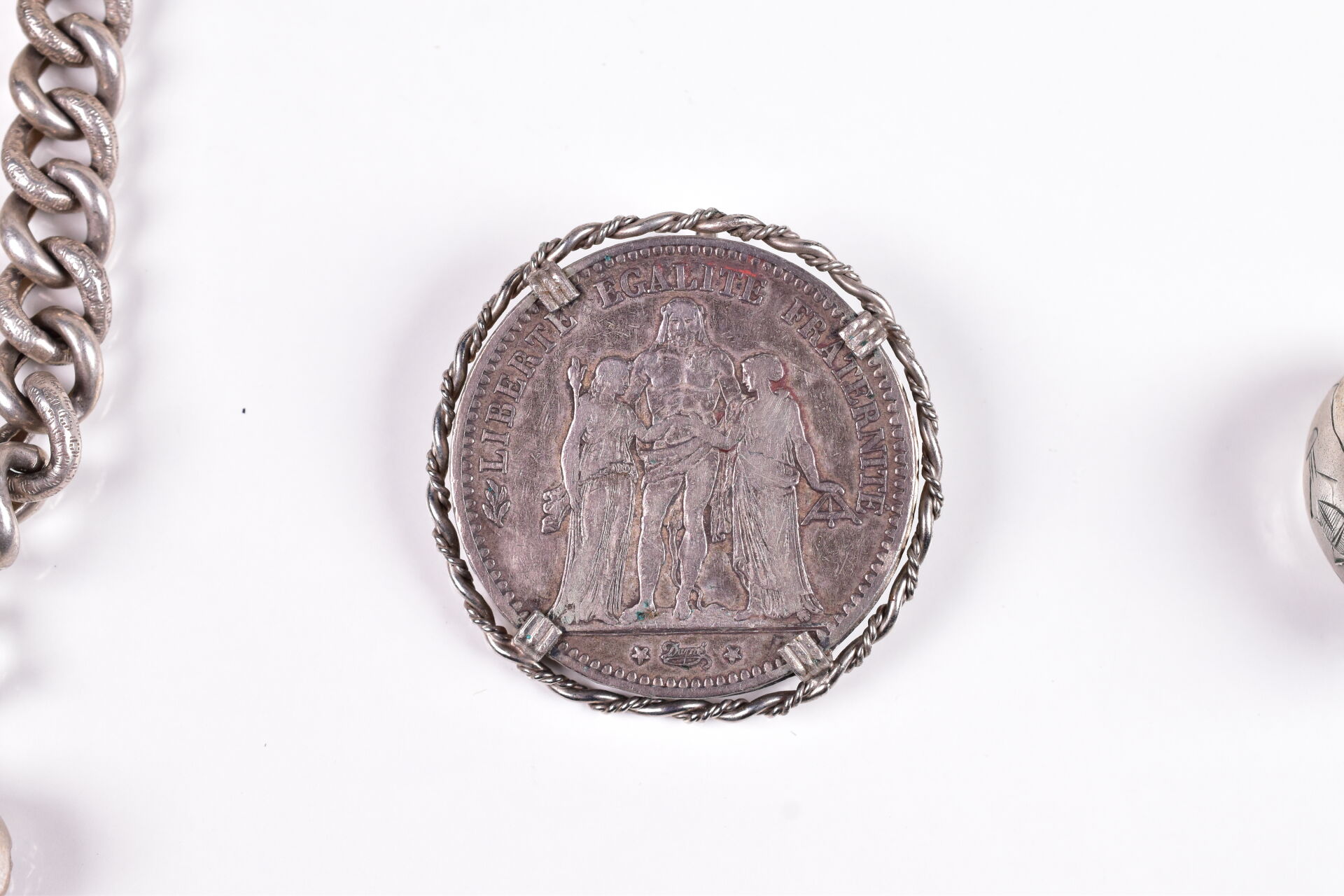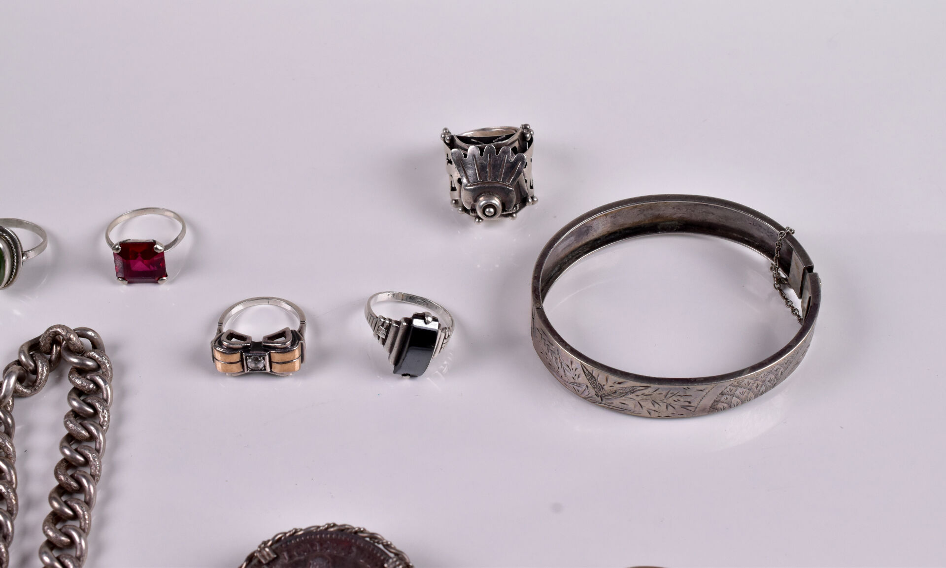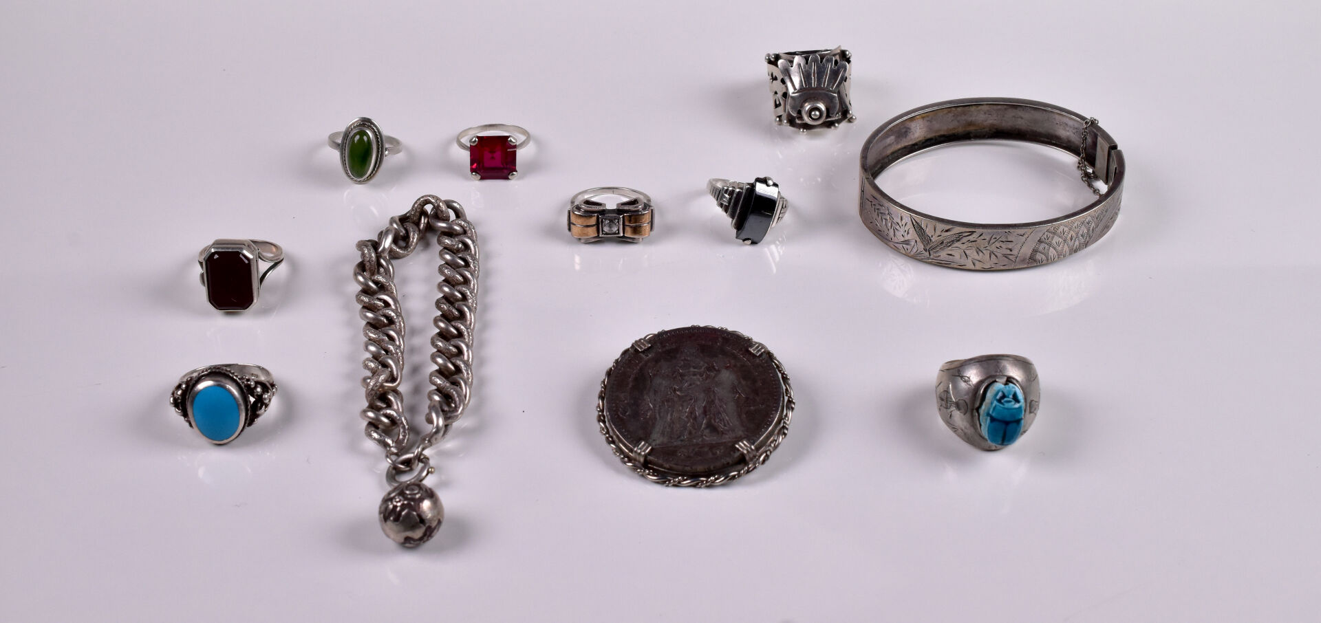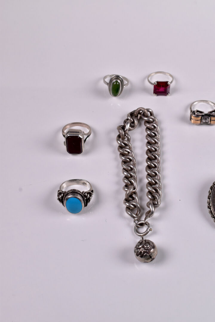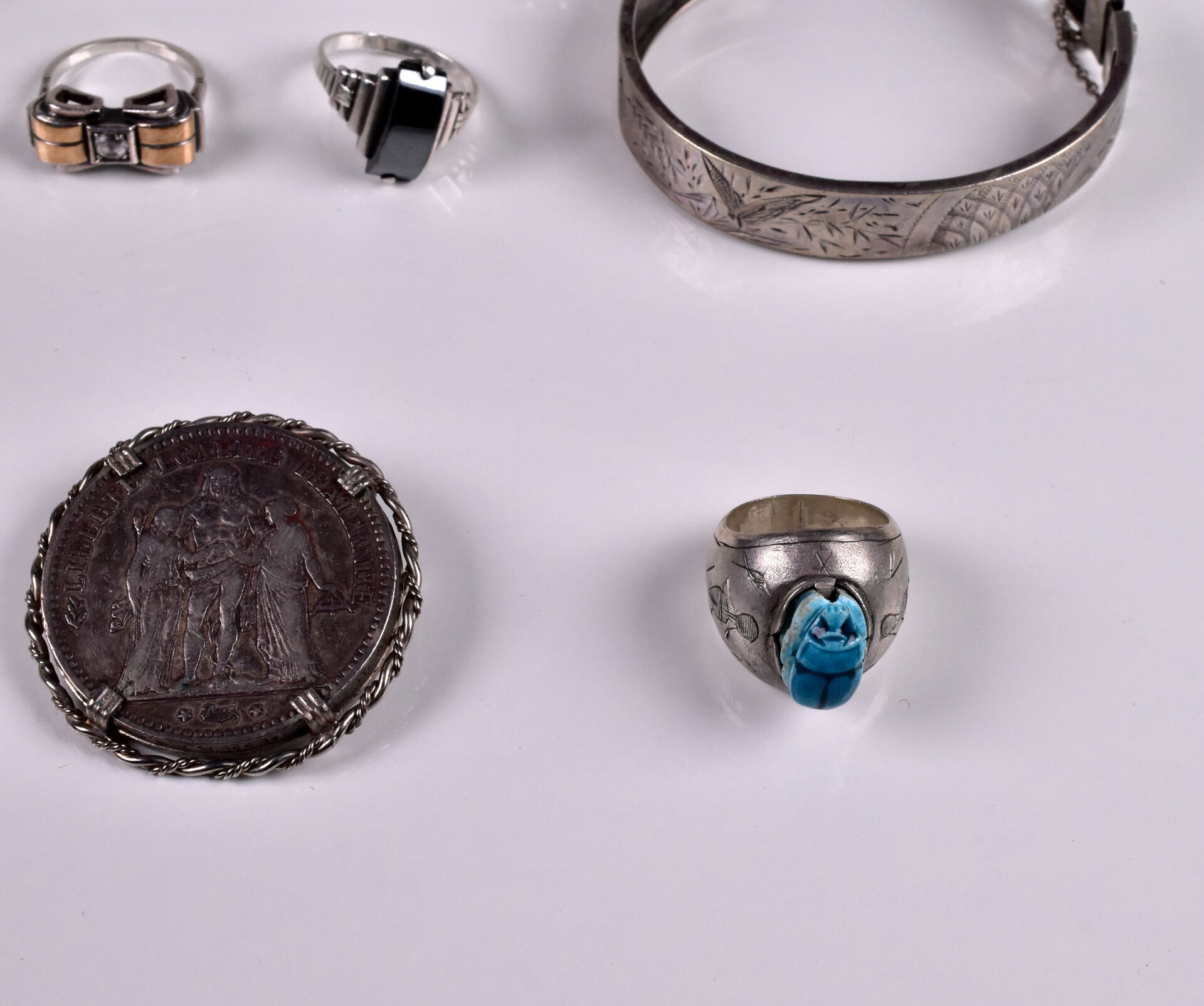 Ensemble de bijoux en argent 925/1000e comprenant deux bracelets, une broche avec un 5 francs Hercules, 8 bagues, certaines avec pierres. Poids brut total. : 107,9 g.