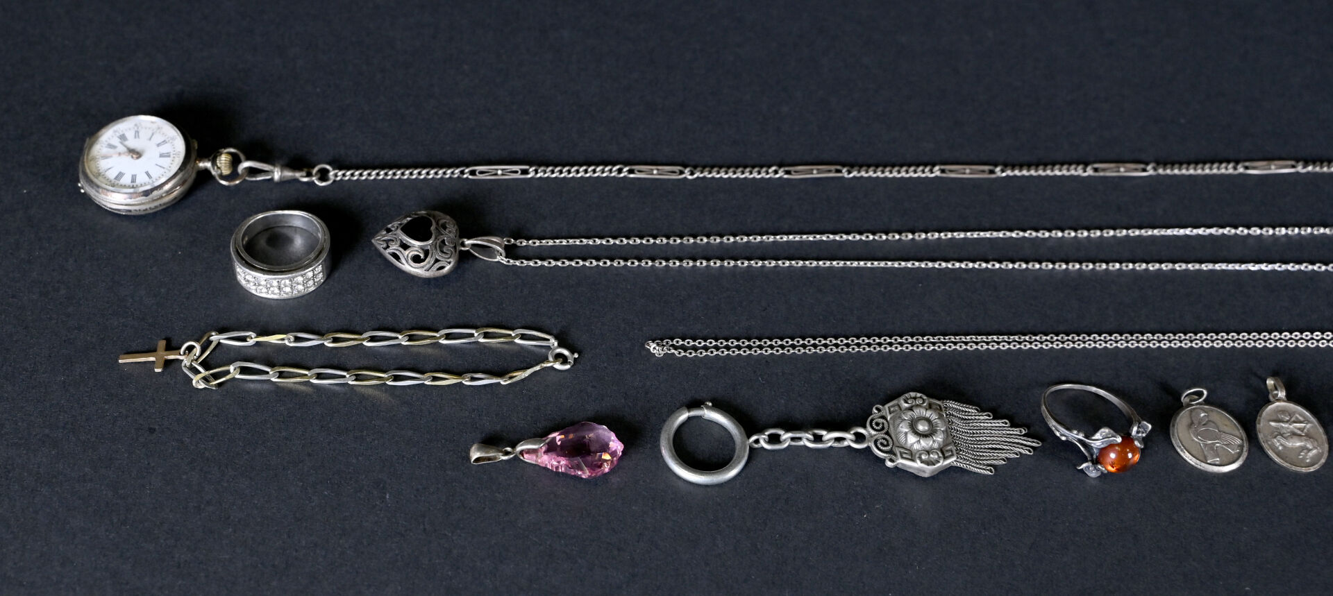 Ensemble de bijoux en argent comprenant : 5 pendentifs, 2 chaines, 1 porte clef, 1 chaine et sa montre de col, 1 paire de pendants d’oreilles avec pierres rouges, 2 bagues avec pierres. Poids brut : 79 g