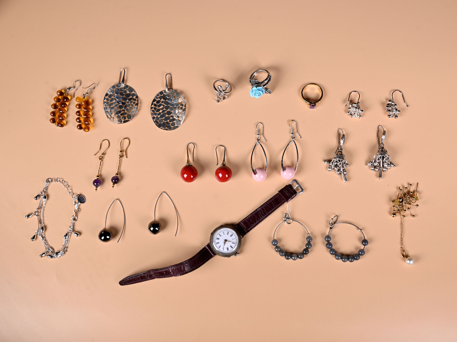 Ensemble de bijoux fantaisies comprenant : une bague argent avec fleur turquoise et marcassites (TDD 52). Poids brut : 11,6 g. Une bague fantaisie avec pierre violette (TDD 58), une bague serpent en argent (TDD 50). Poids : 3,6 g. Trois paires de pendants d’oreilles en argent. Poids : 27 g. Un bracelet avec pampille en argent. Poids : 6,5 g, Sept paires de pendants d’oreilles fantaisies dont une nouée avec un collier. On joint une montre de col en métal montée sur un bracelet cuir (usé).
