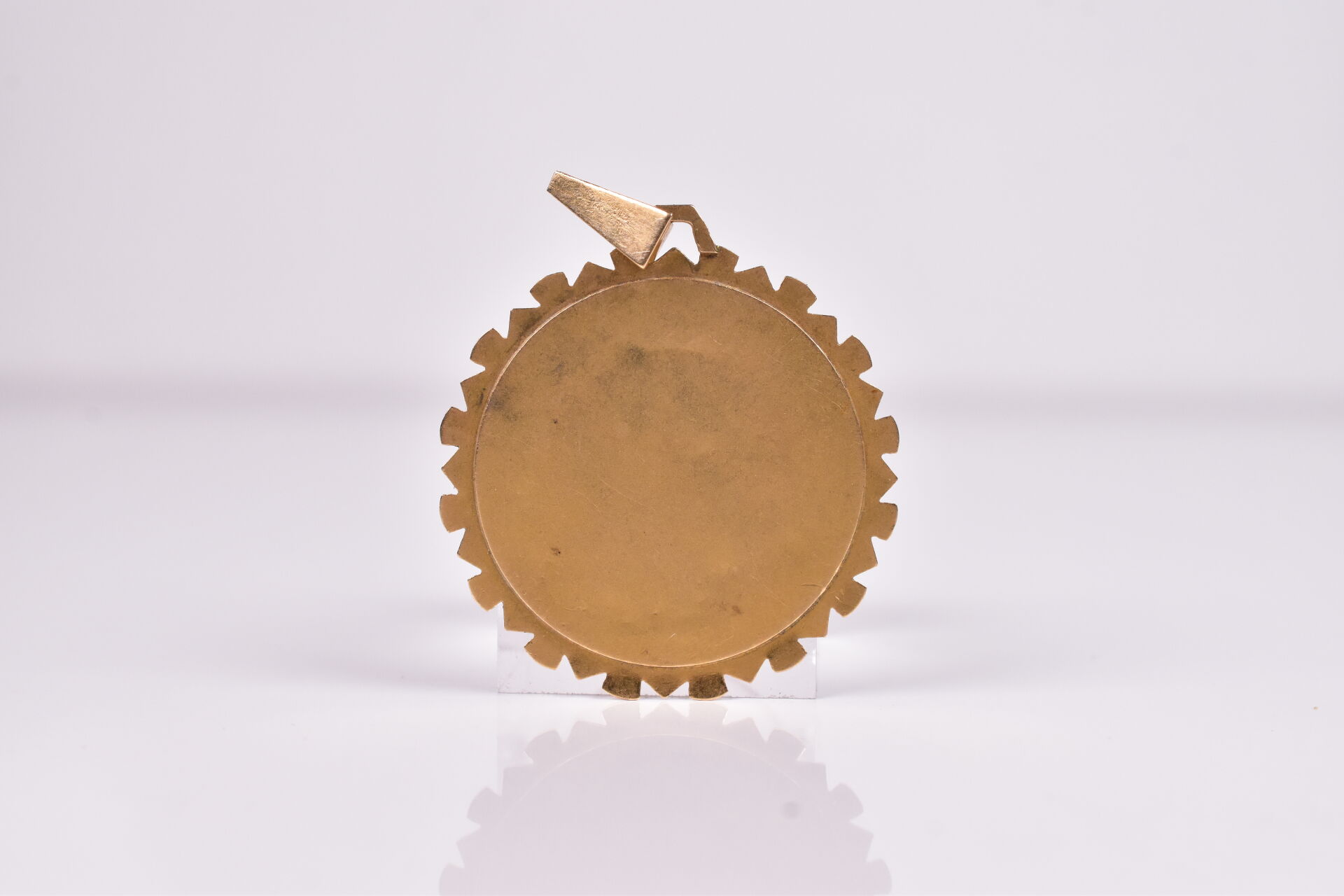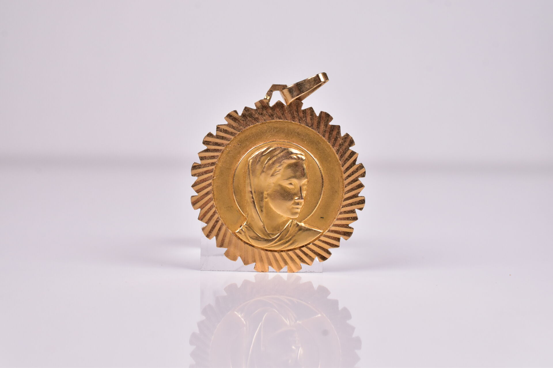 Ensemble de bijoux religieux en or jaune 18K 750/1000e comprenant une croix et trois médailles (deux gravées). Poids de l’ensemble : 10,6 g.