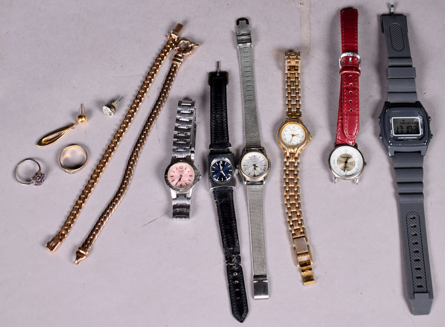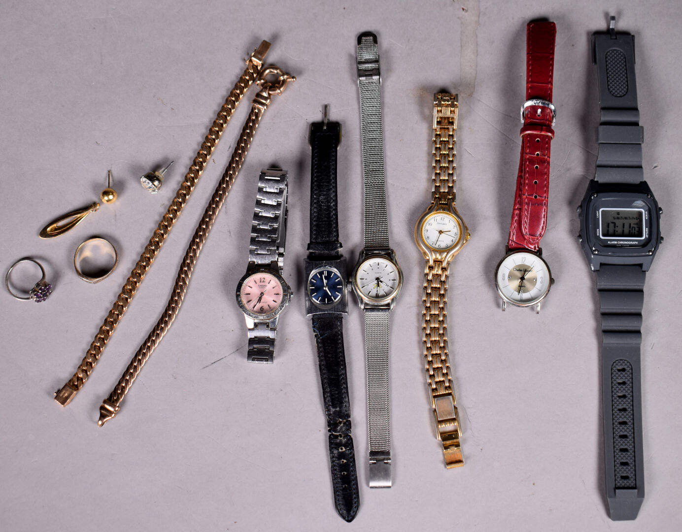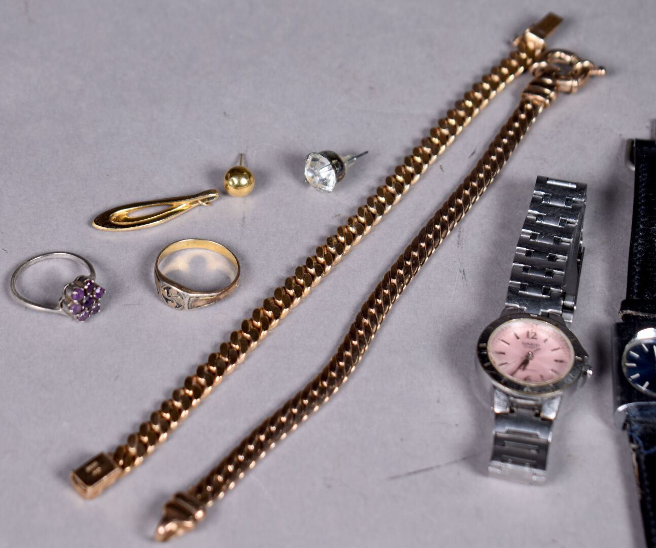 Ensemble de bijoux soit un bracelet gourmette en or jaune 9K 385/1000e (poids 32,25 g), un bracelet souple en or jaune 14K 585/1000e (poids 1,30 g), deux anneaux en or gris 18K 750/1000e (poids 4,75 g) (un sectionné, l’autre sertie de pierre). On joint un ensemble de bijoux fantaisie et de montres fantaisie (état d’usure).