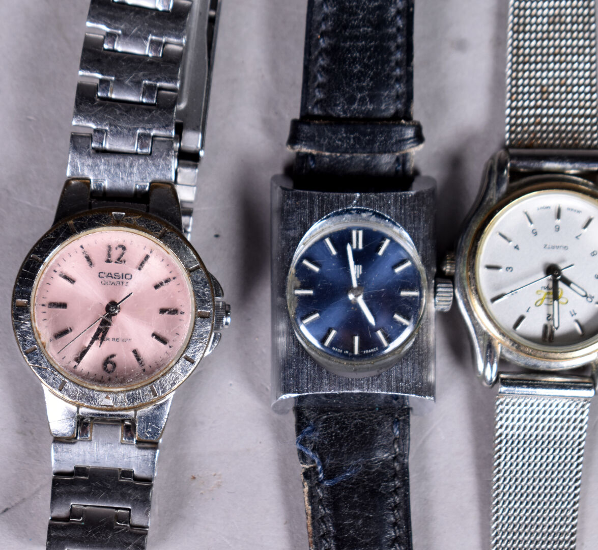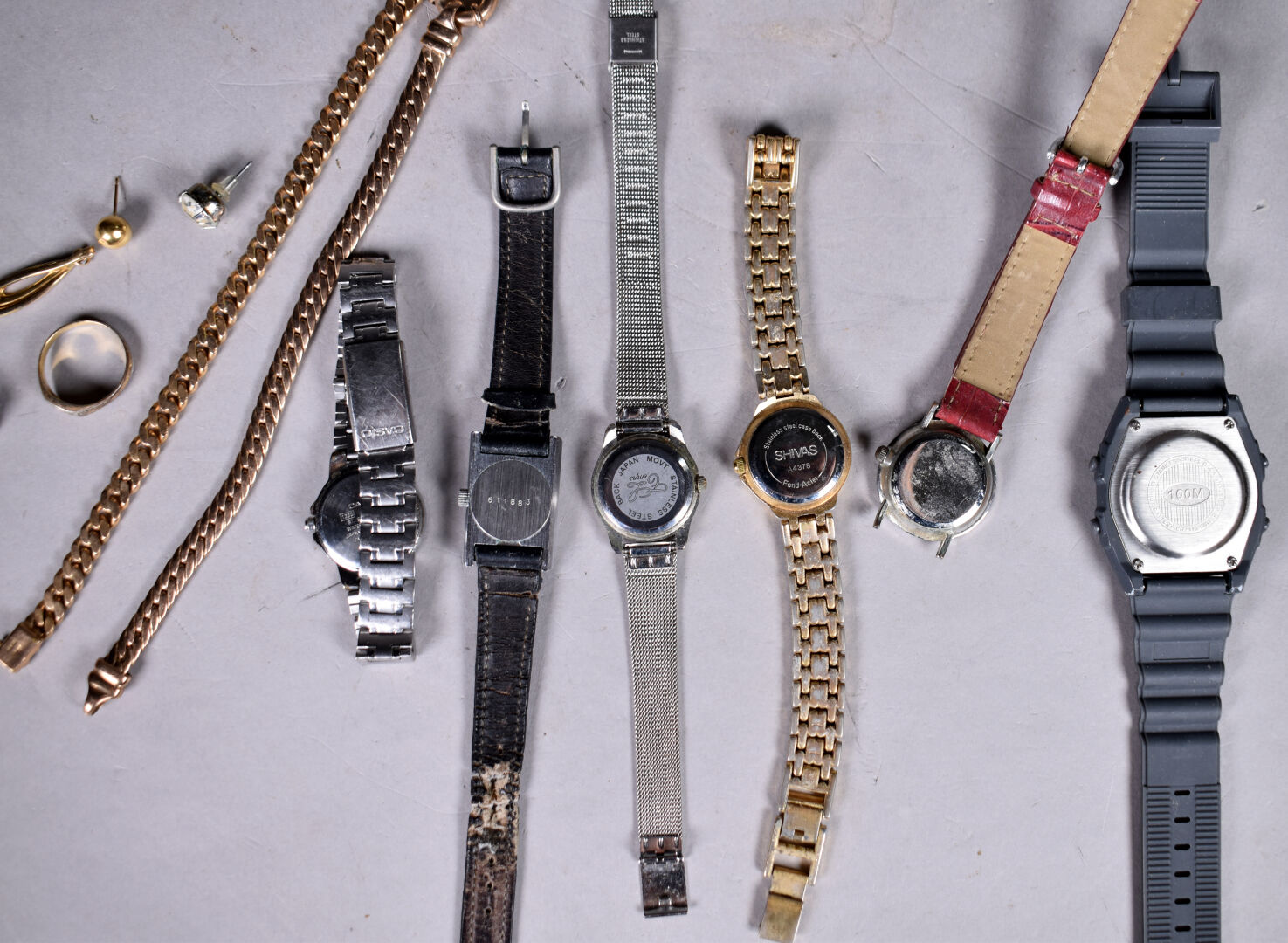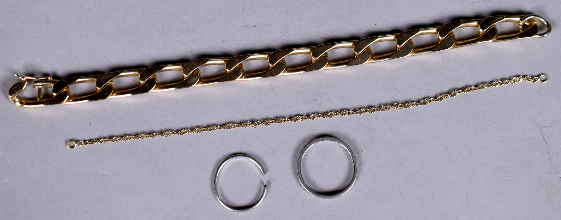 Ensemble de bijoux soit un bracelet gourmette en or jaune 9K 385/1000e (poids 32,25 g), un bracelet souple en or jaune 14K 585/1000e (poids 1,30 g), deux anneaux en or gris 18K 750/1000e (poids 4,75 g) (un sectionné, l’autre sertie de pierre). On joint un ensemble de bijoux fantaisie et de montres fantaisie (état d’usure).