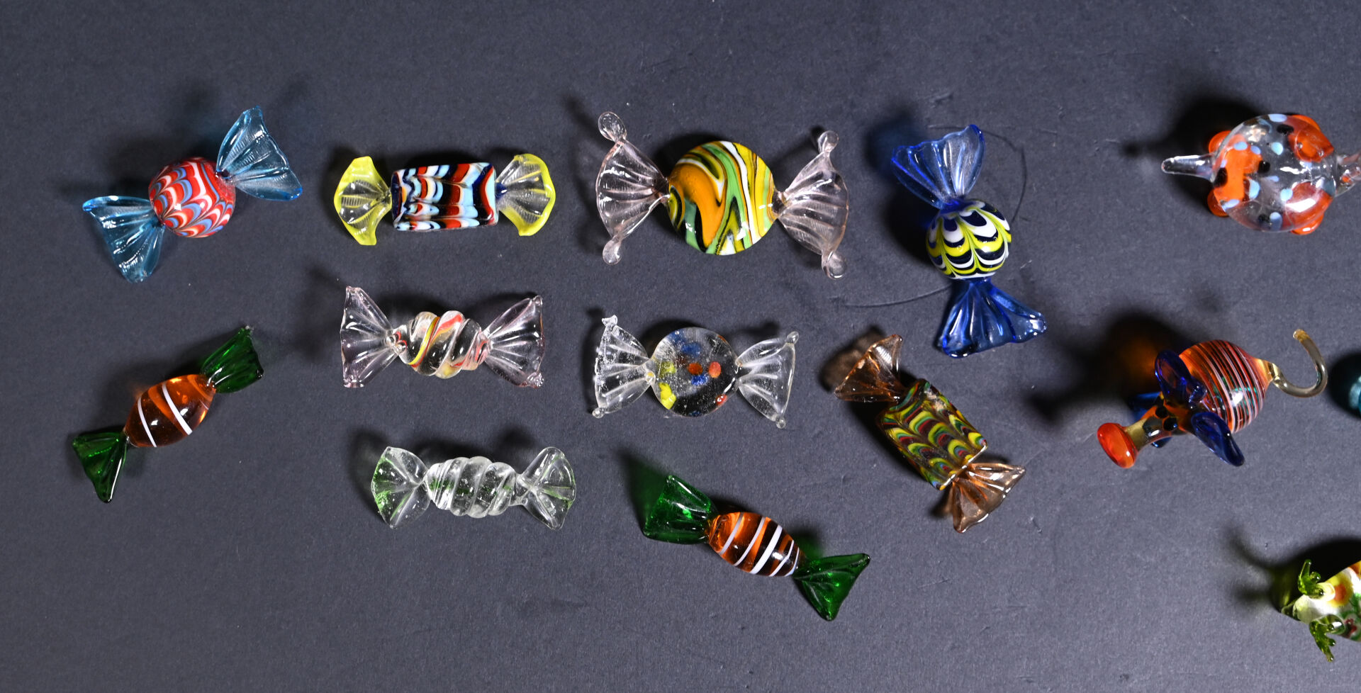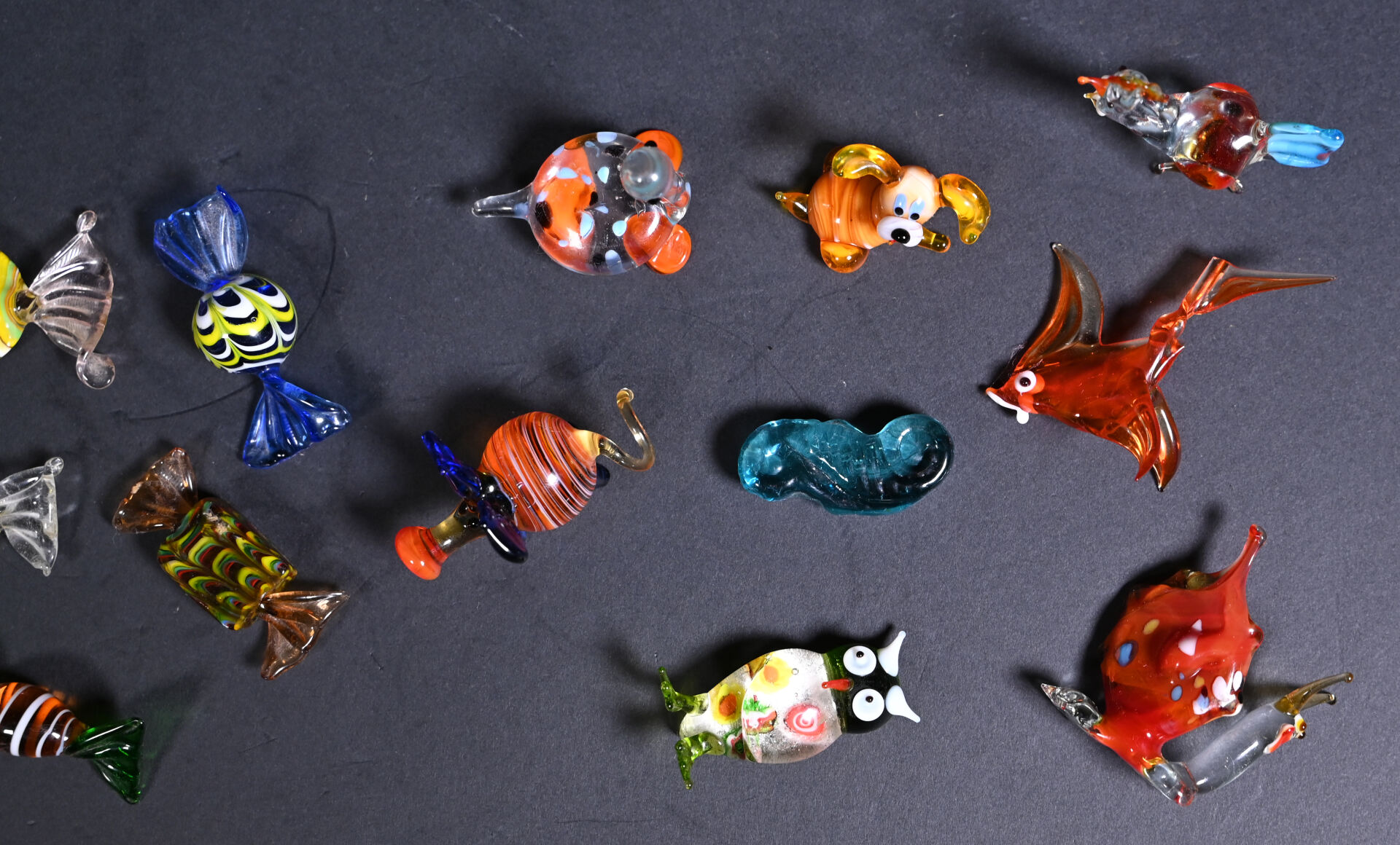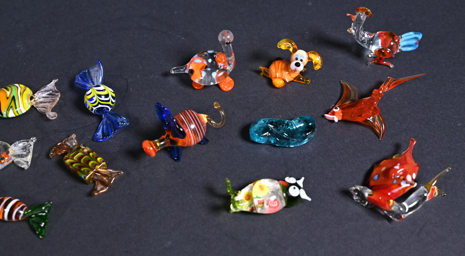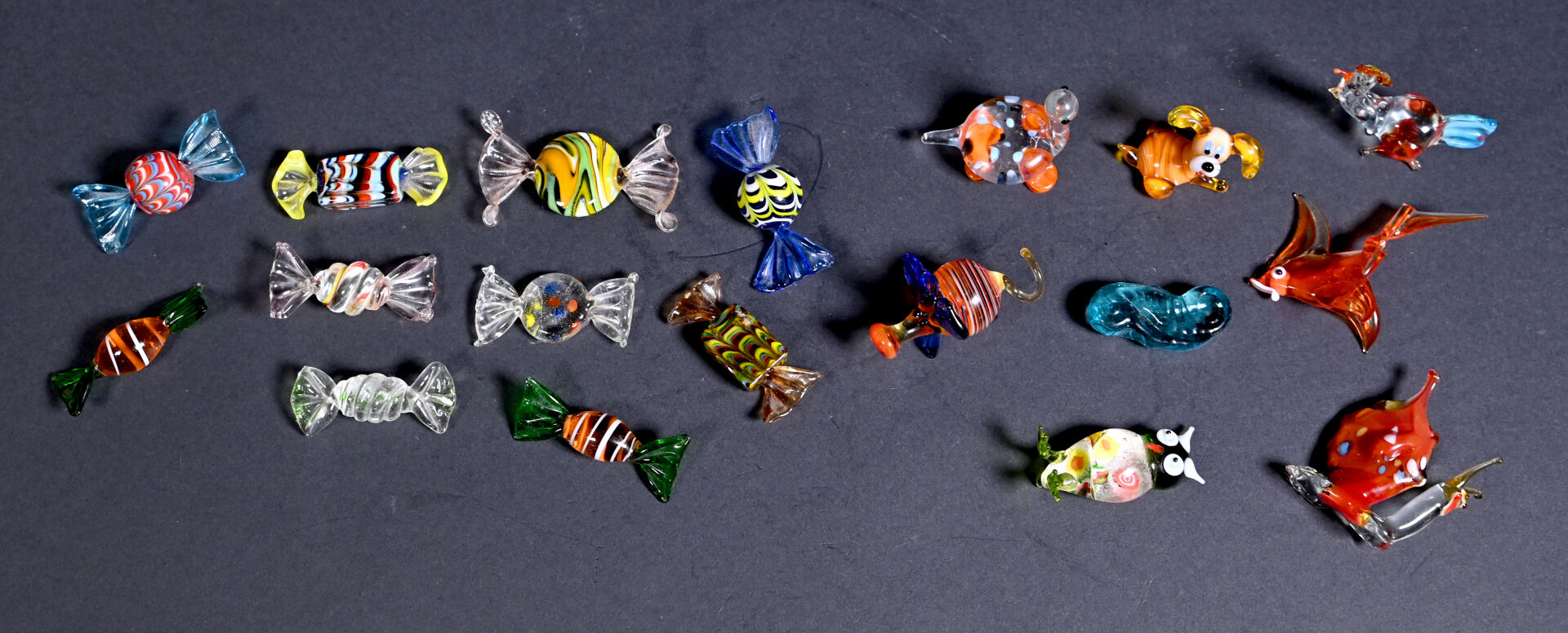 Ensemble de bonbons et animaux miniature en verre de Murano. XXe siècle.
