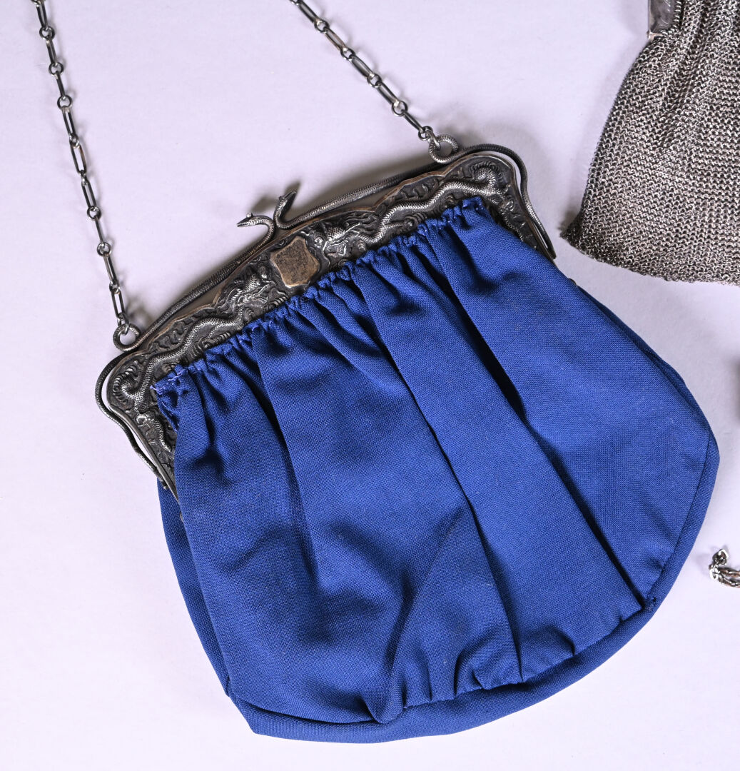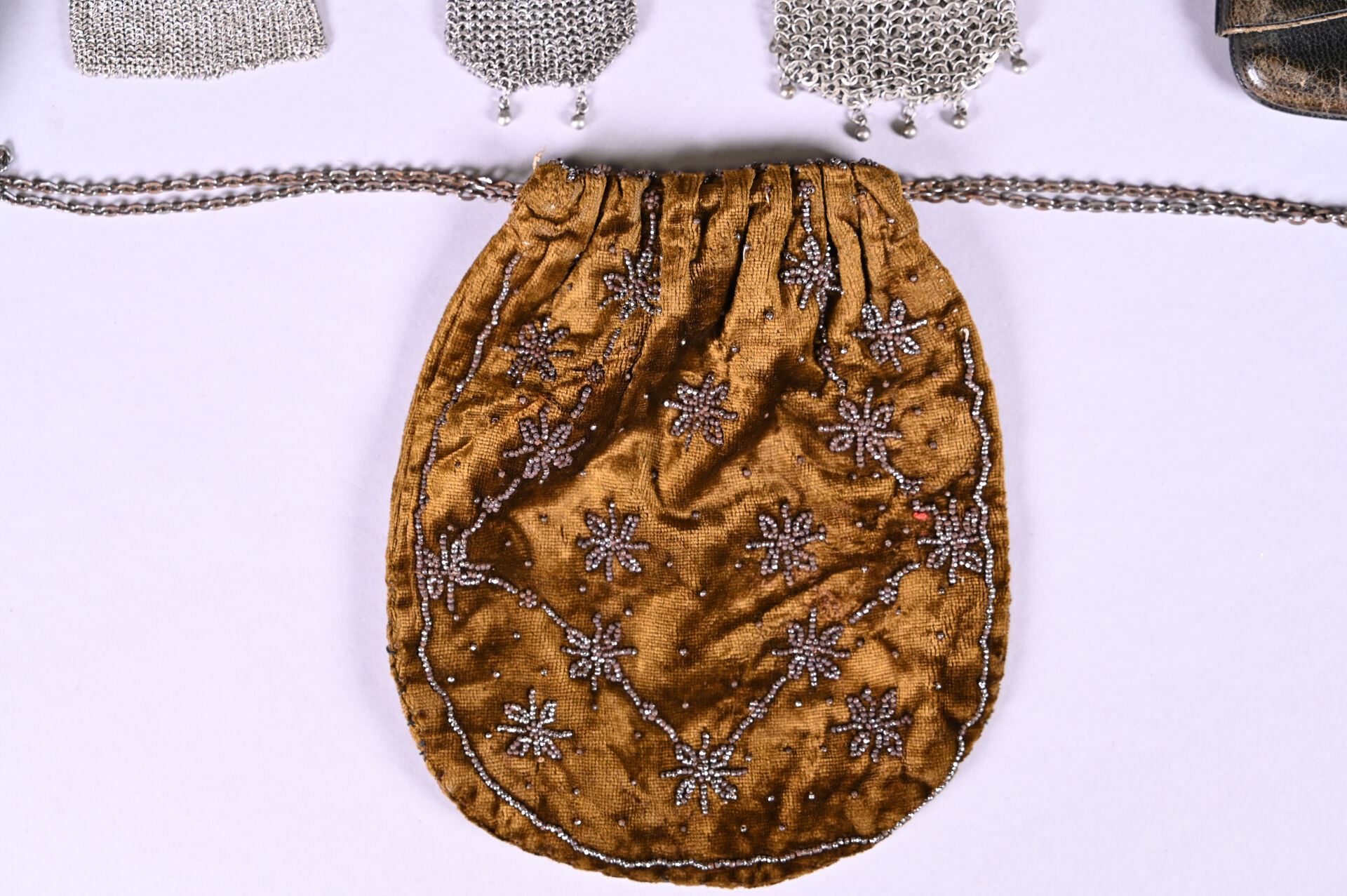 Ensemble de bourses cotte de maille en argent 800 et 925/1000e. Poids total brut : 741 g. On joint 3 autres bourses en tissu à montures en métal ou perles brodées. 5 à charge.