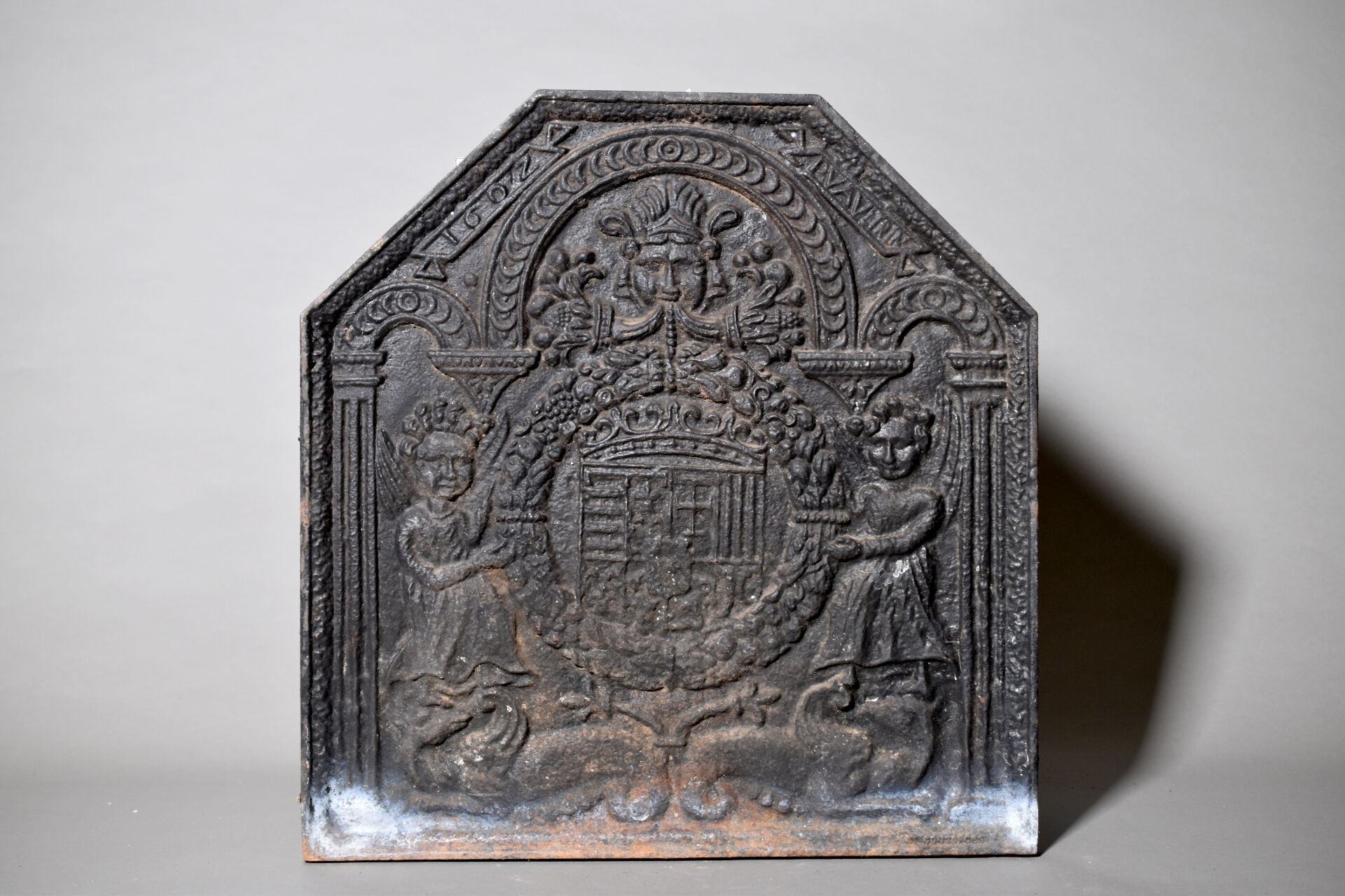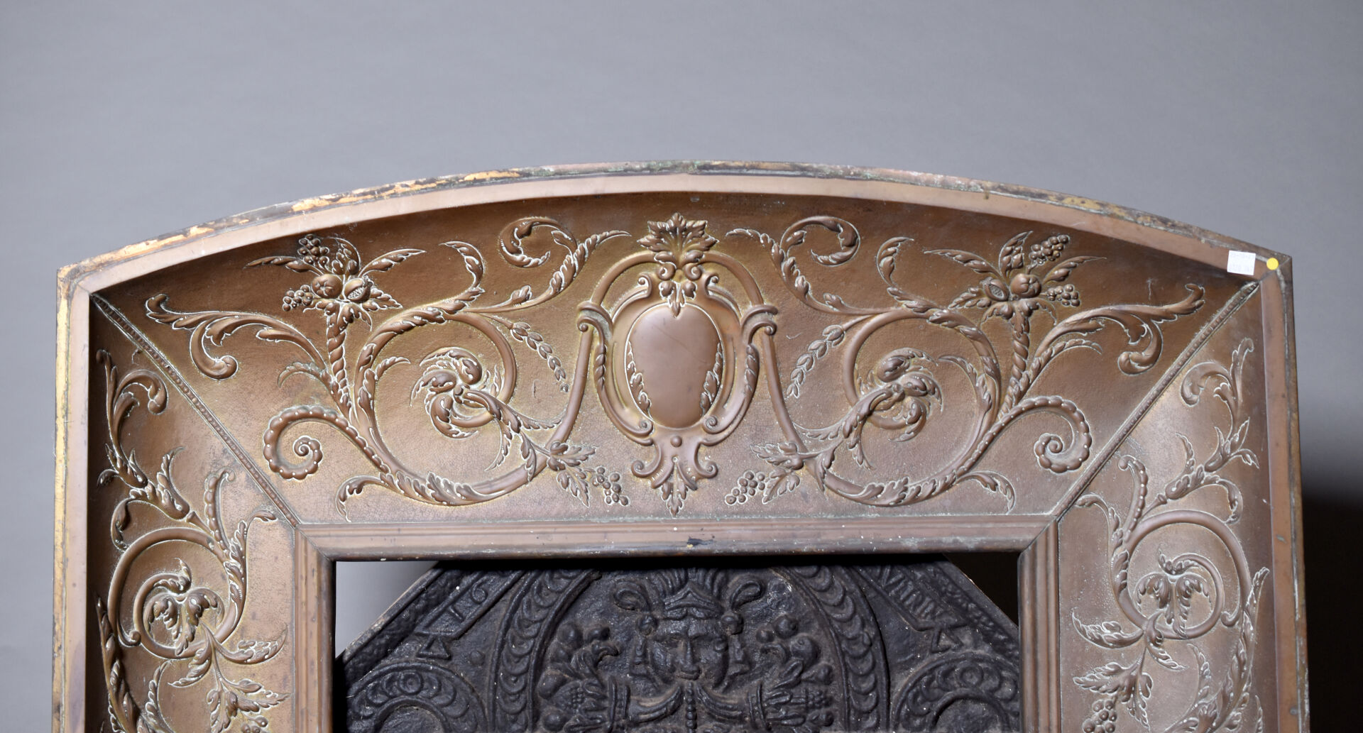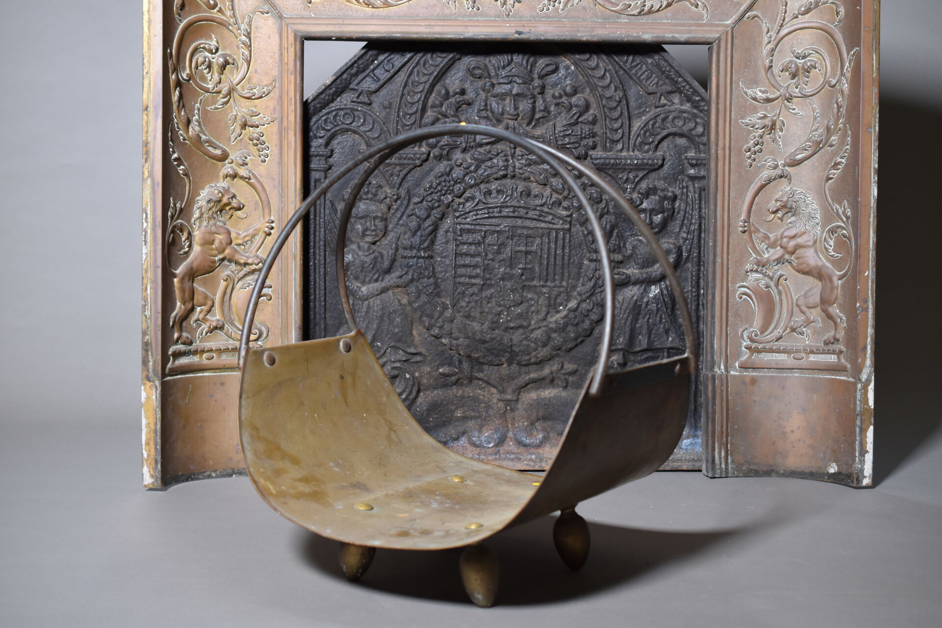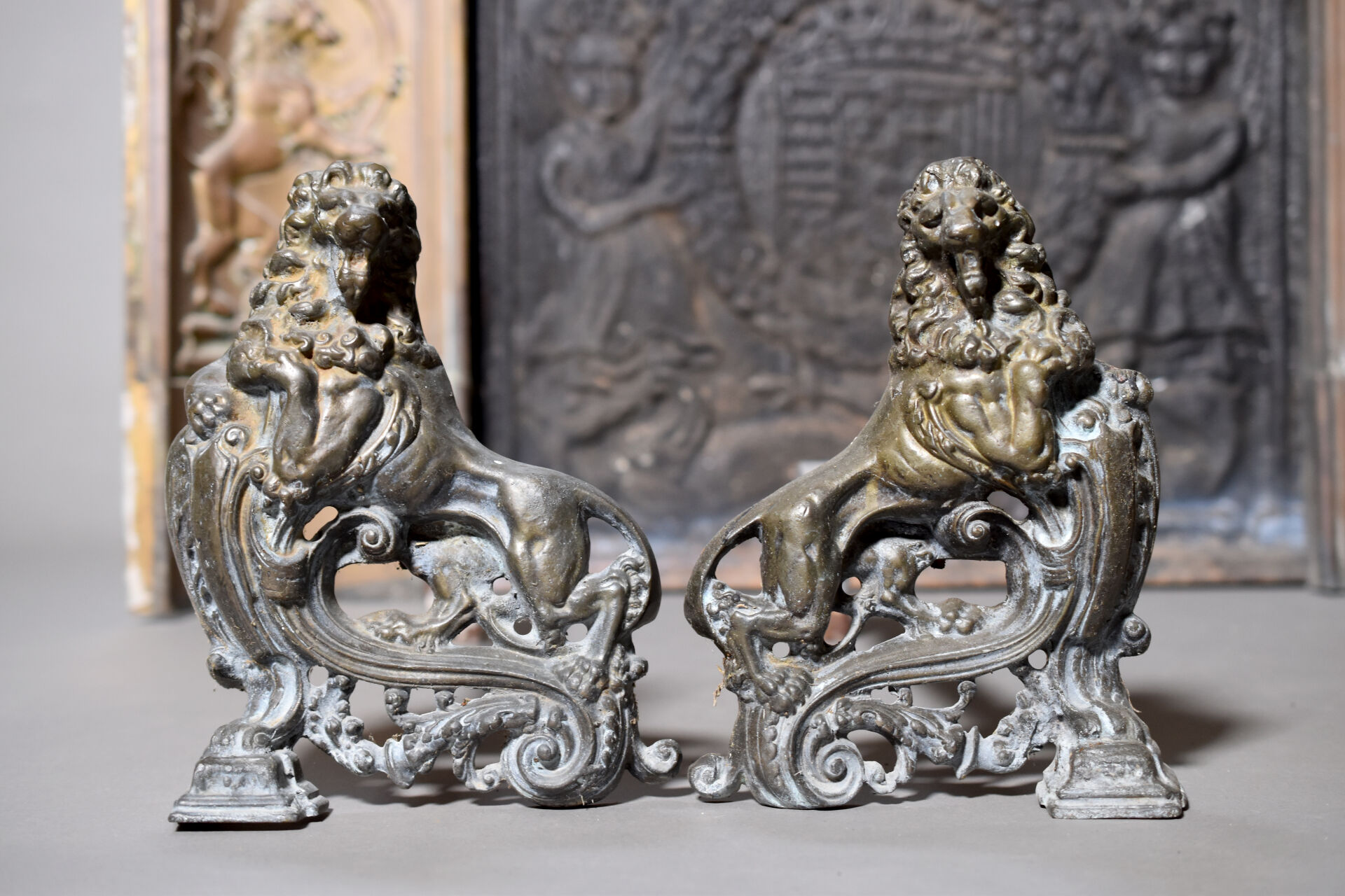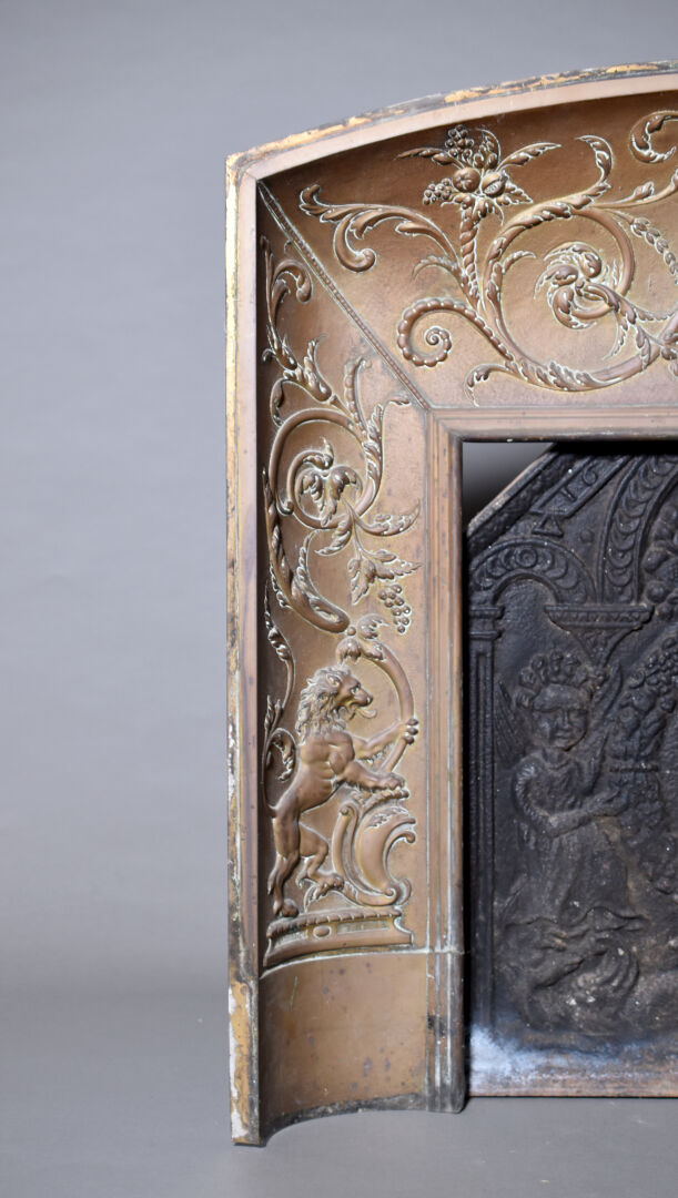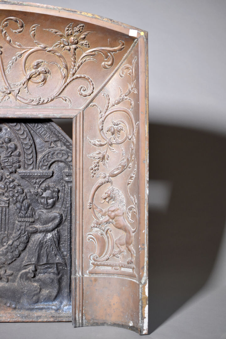Ensemble de cheminée soit une plaque en fonte, un manteau(?) en cuivre à décor repoussé d’entrelacs, une paire de chenets ornés de lions, un porte buches.
