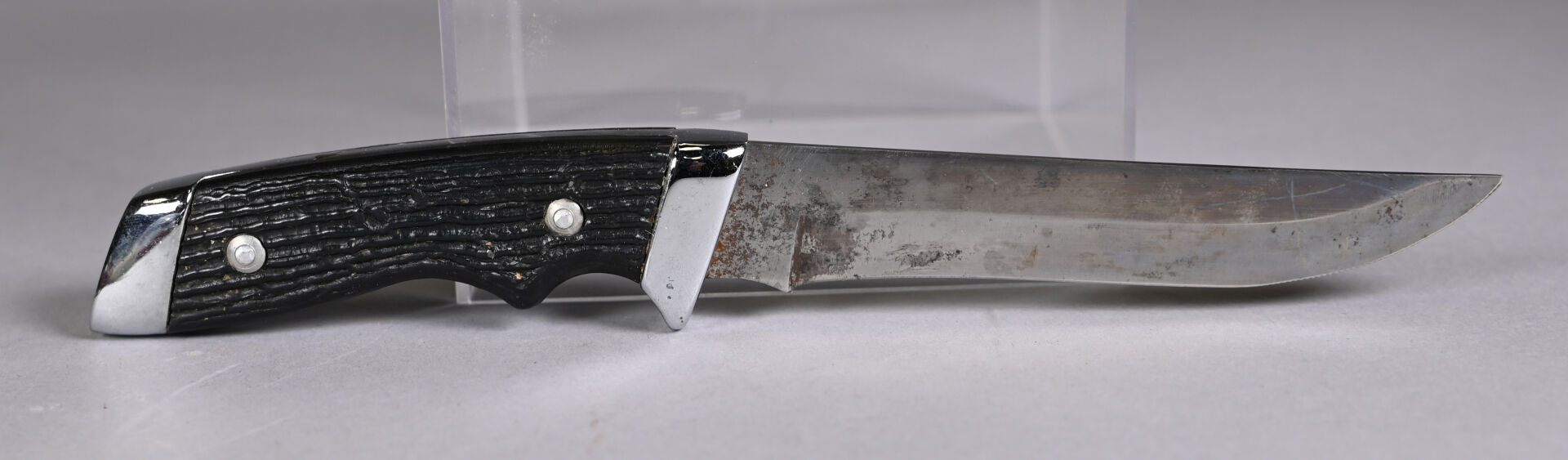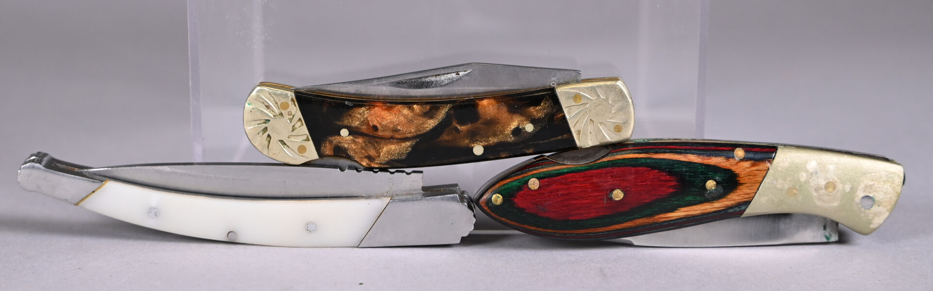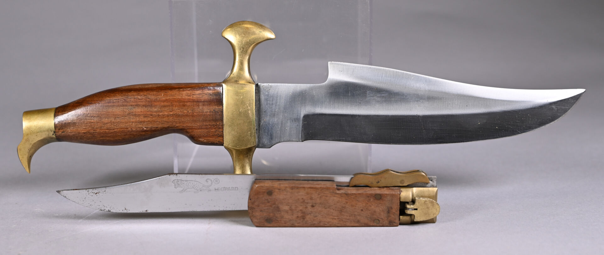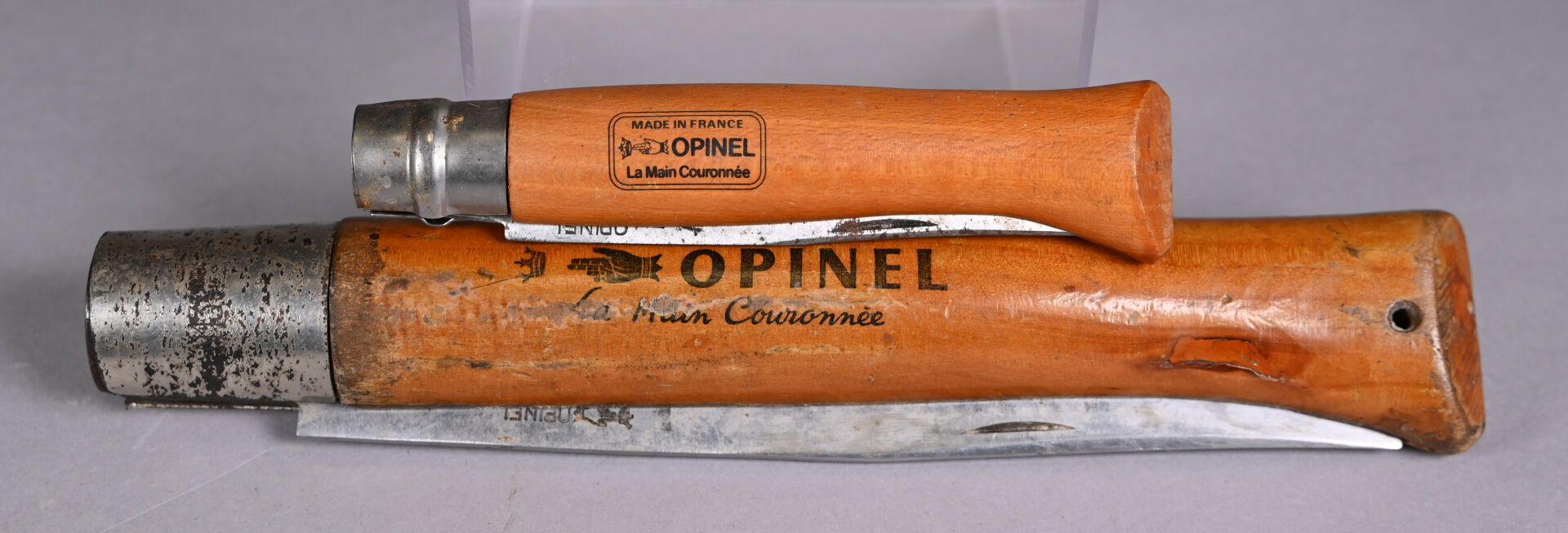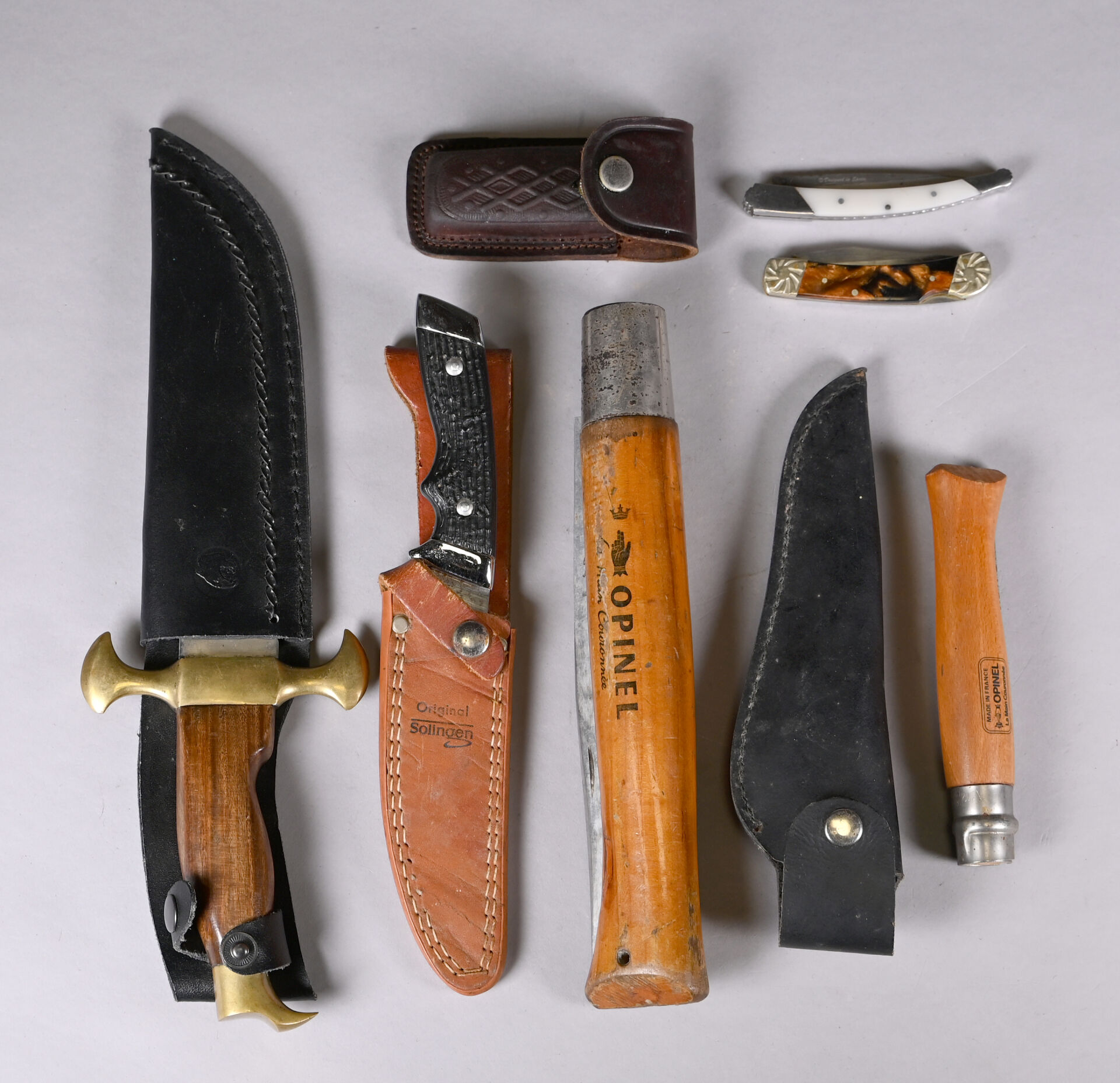 Ensemble de couteaux soit deux OPINEL (12 et 13), 1 SOLINGEN, 2 LEOPARD, 2 ALBAINOX et 1 couteau de chasse LEOPARD. Avec quelques fourreaux.