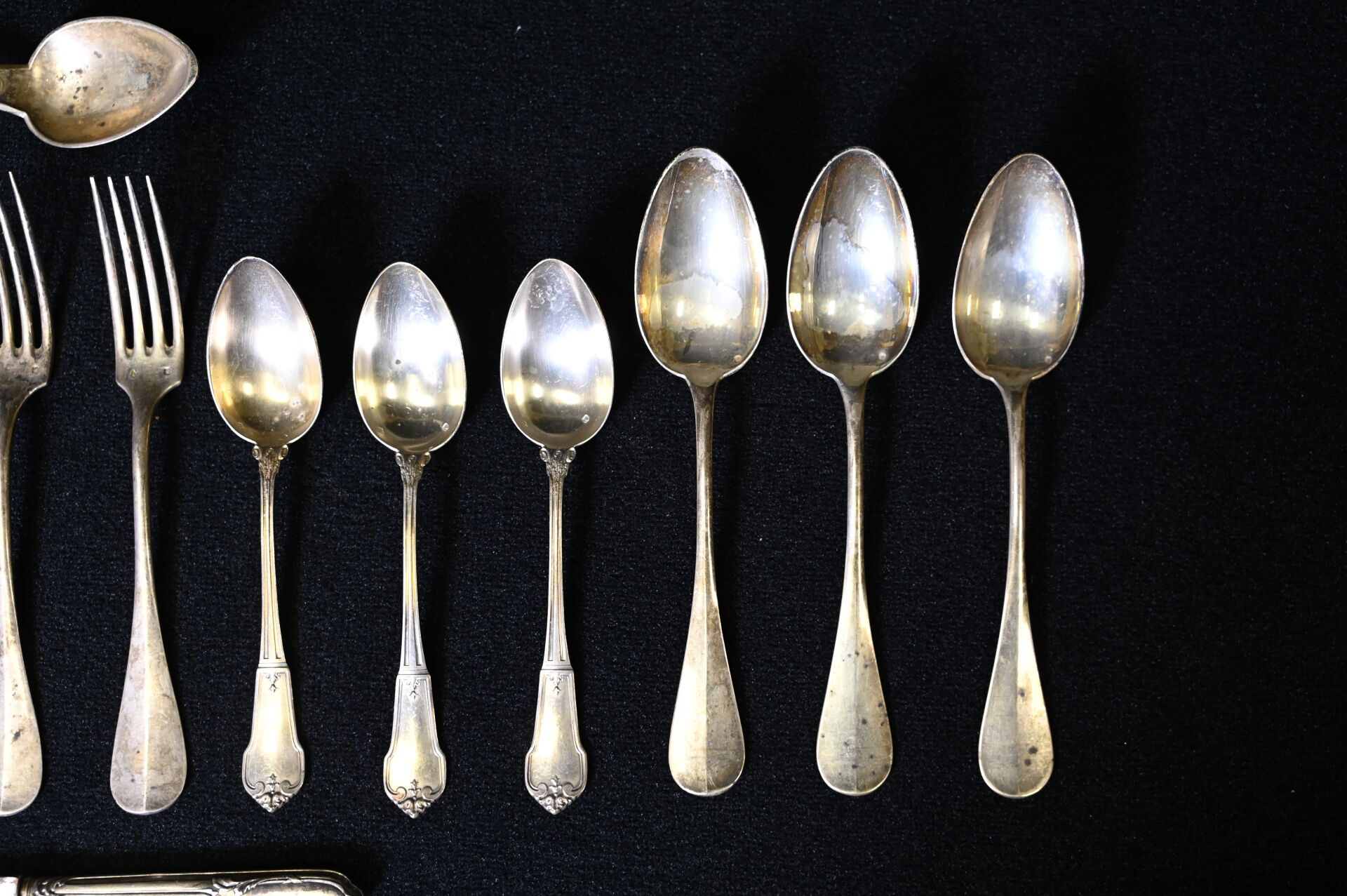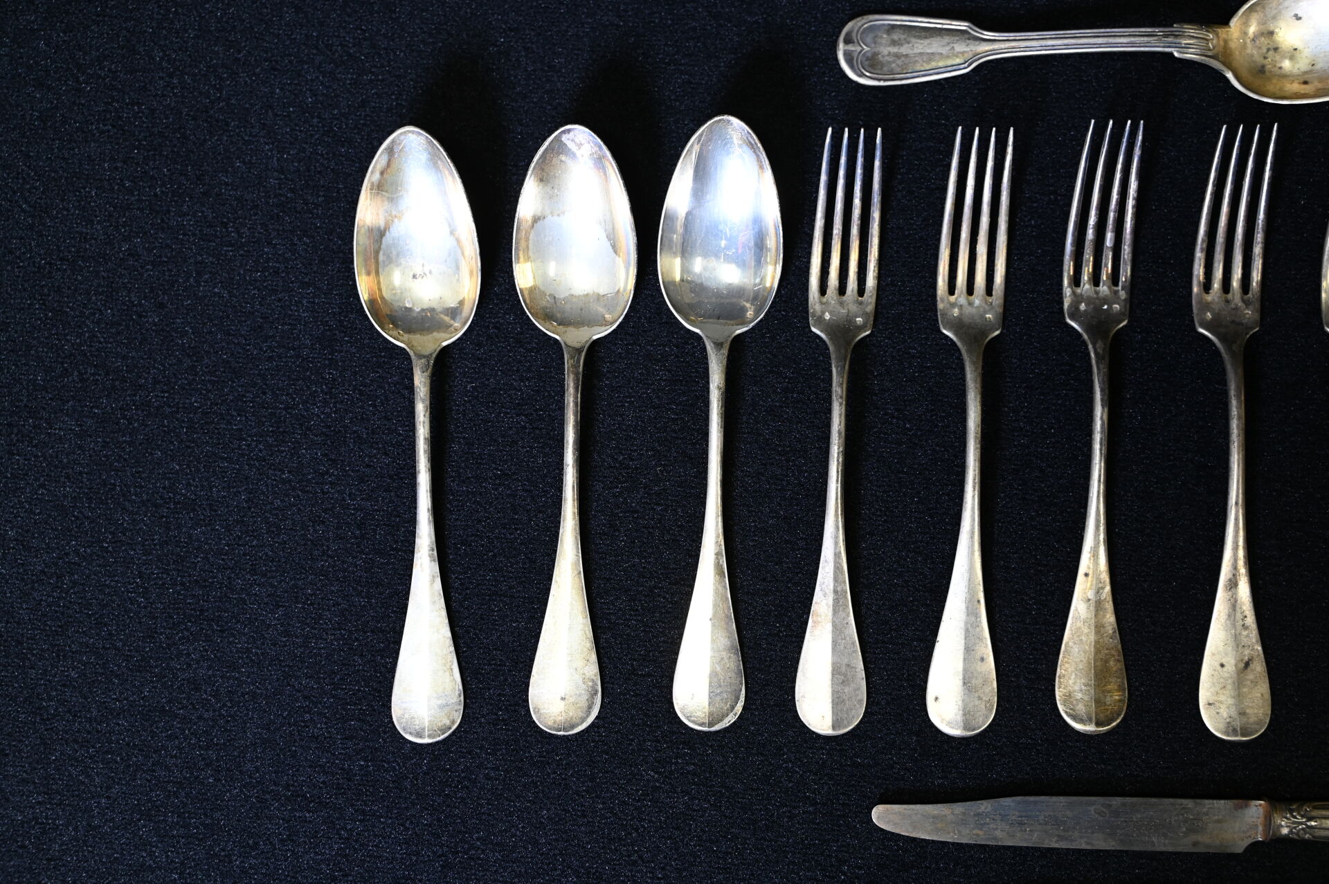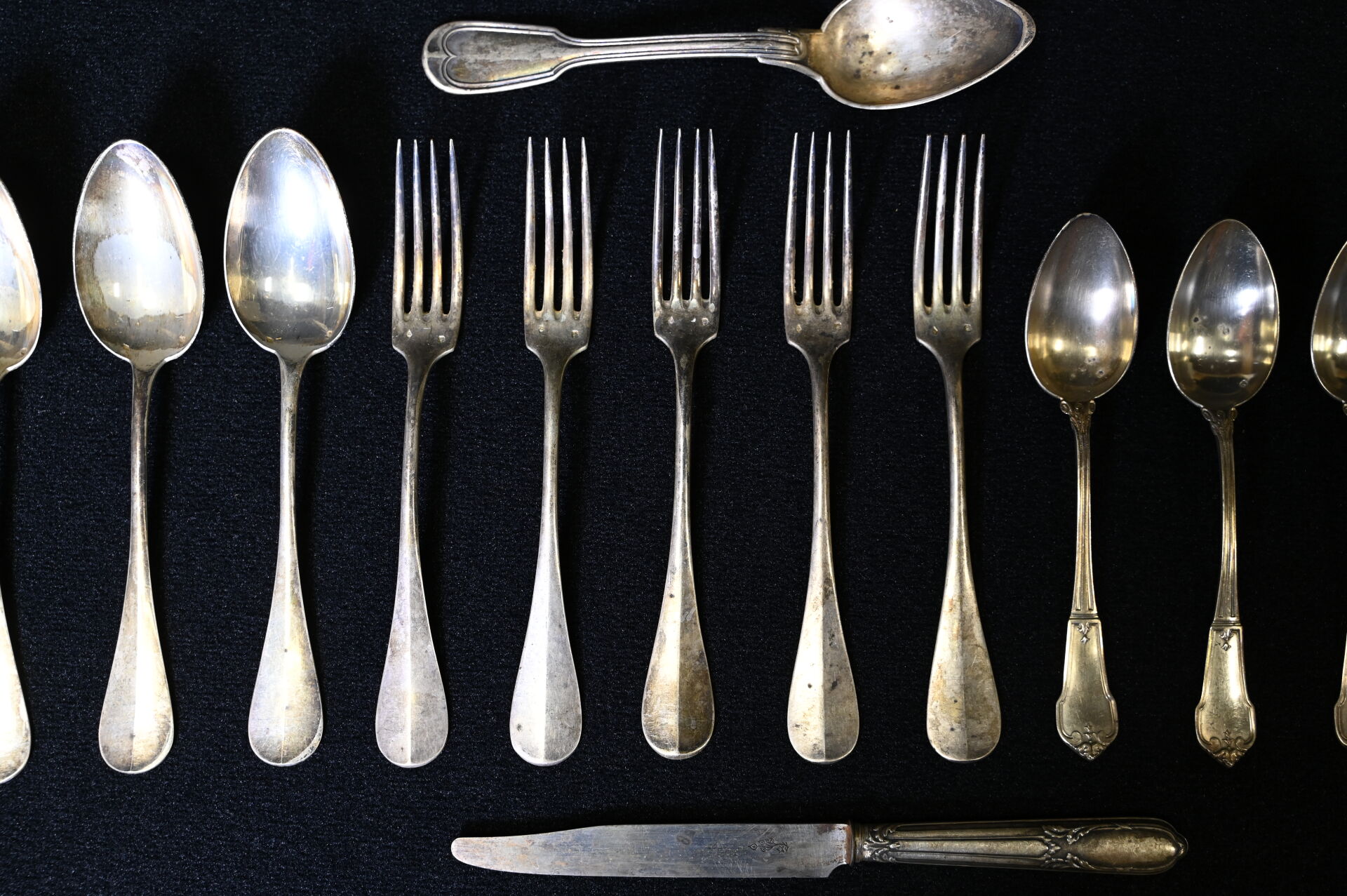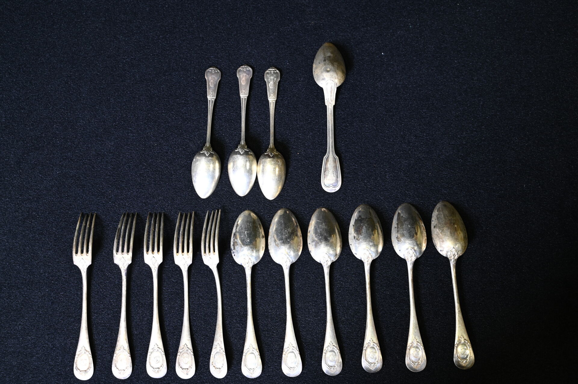 Ensemble de couverts en argent 925/1000e soit 10 grandes cuillères dépareillées, 5 grandes fourchettes. Poids: 1 066 g. On joint 3 couteaux à manches en argent fourré. Poids brut. : 194 g.