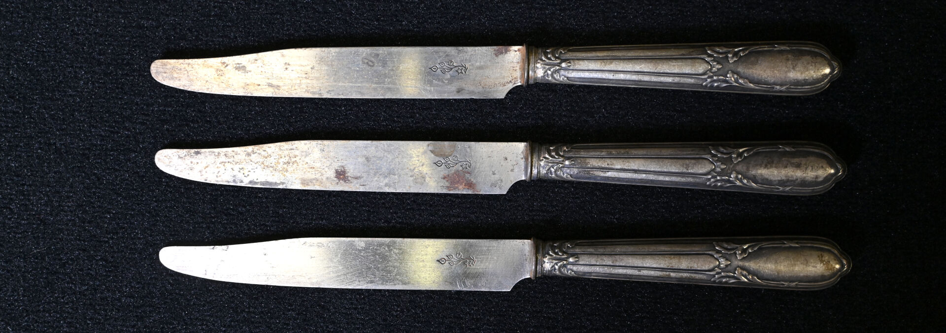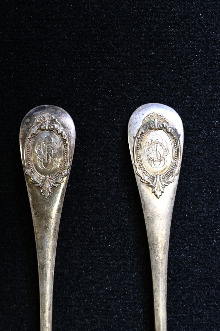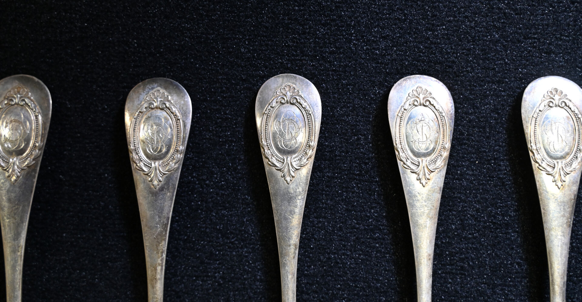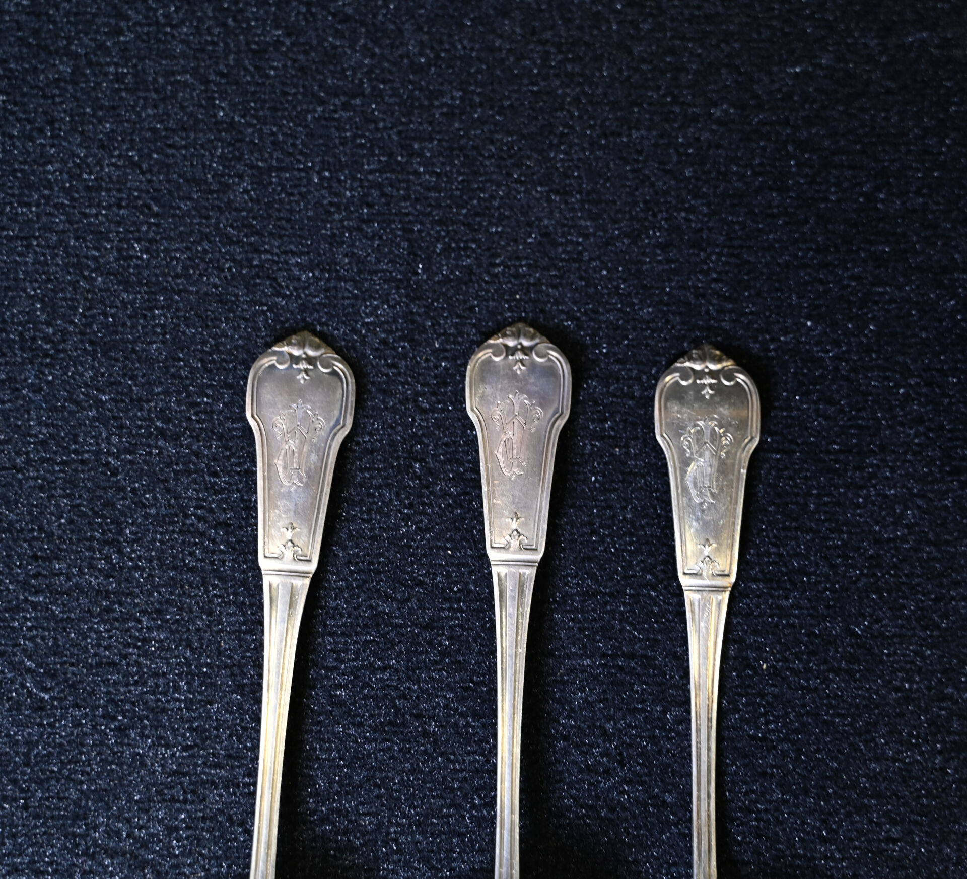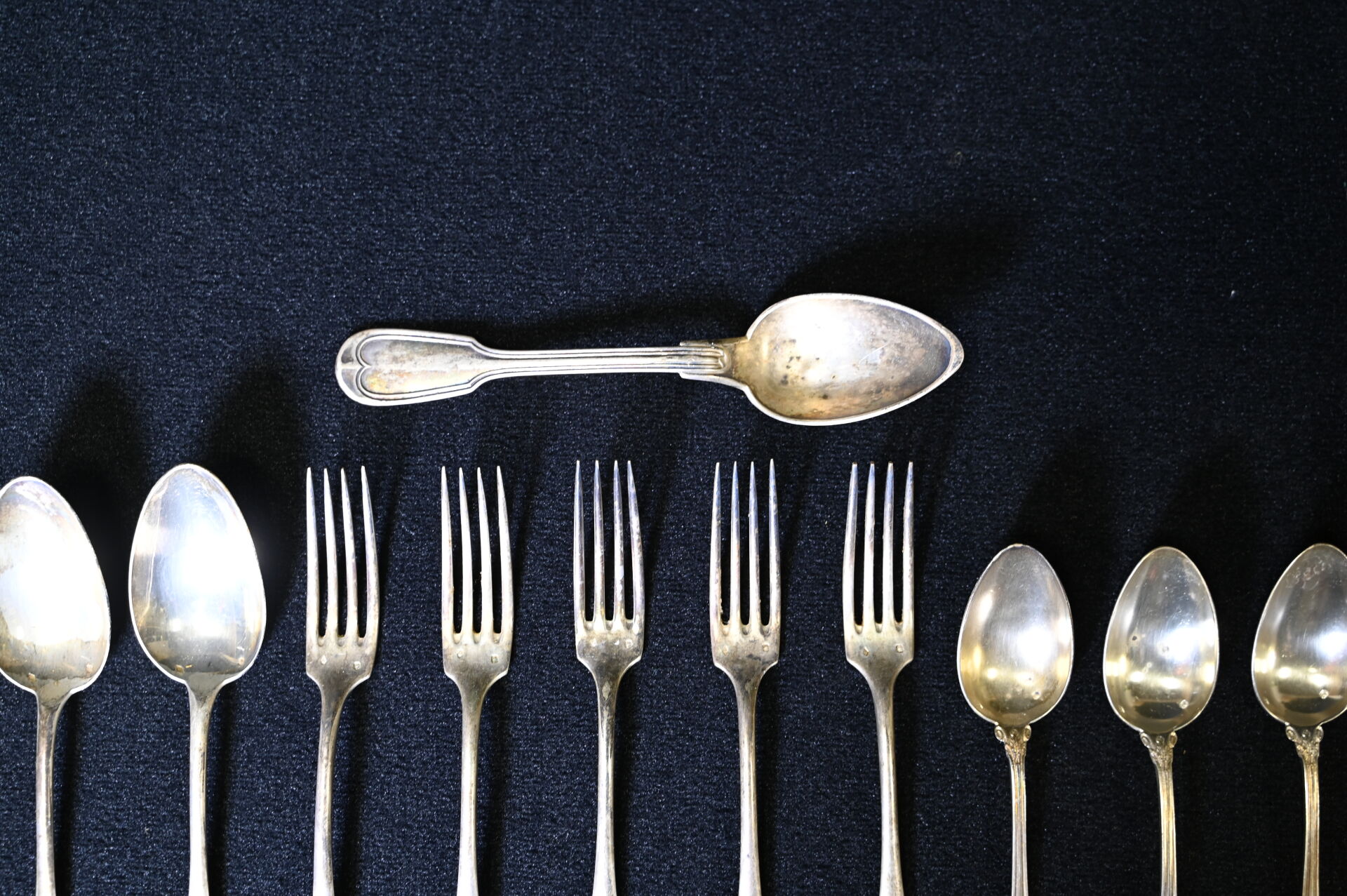 Ensemble de couverts en argent 925/1000e soit 10 grandes cuillères dépareillées, 5 grandes fourchettes. Poids: 1 066 g. On joint 3 couteaux à manches en argent fourré. Poids brut. : 194 g.