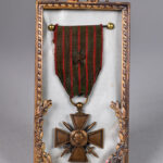 Ensemble de décorations militaires soit Croix de Guerre 1914-1917 avec citation à l’ordre du régiment. Dans un cadre en laiton. Une Croix du combattant, une médaille de la Croix Rouge ainsi qu’une barrette de réduction dont médaille interalliés 1914-1918, Ordre du Nichan Iftikhar commandeur (?), médaille des blessés de guerre, croix de guerre, médaille commémorative Grande Guerre.