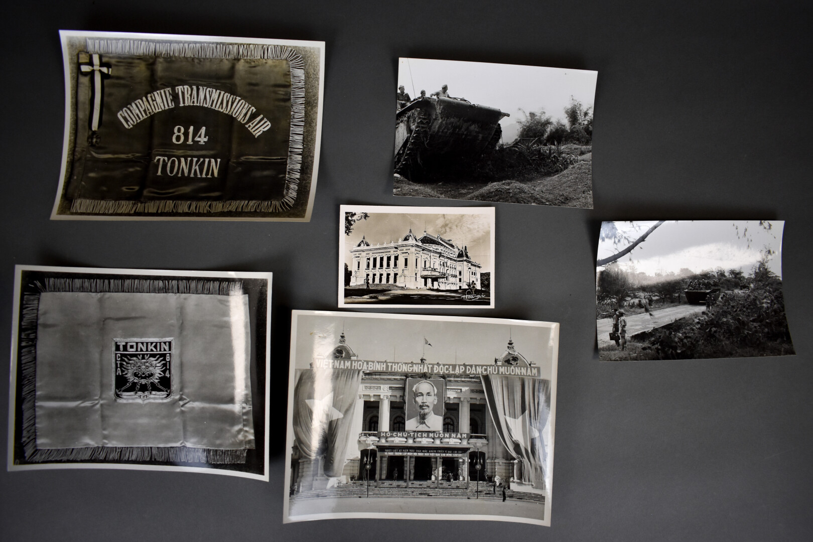Ensemble de deux albums de photographies Indochine des années 1950, essentiellement aviation, provenant d’un membre de la Compagnie Transmissions Air 814 Tonkin, crash aérien dont 250 I abattu à Diên Biên Phu, certaines annotées au dos, vie locale, Dakota, Bombardier B17, avec photos de presse, quelques cartes postales. Environ 300 photos. Dans deux albums laqués.