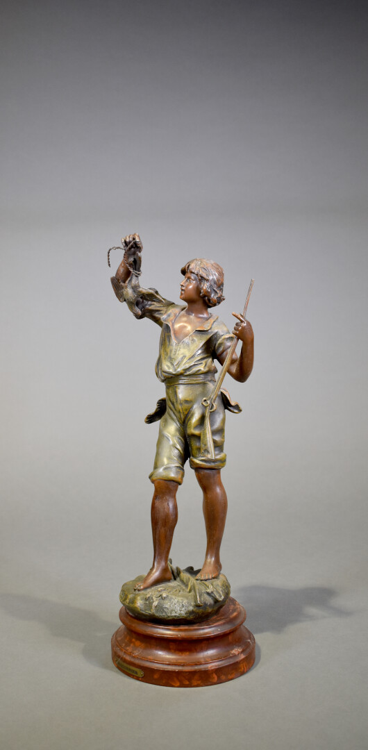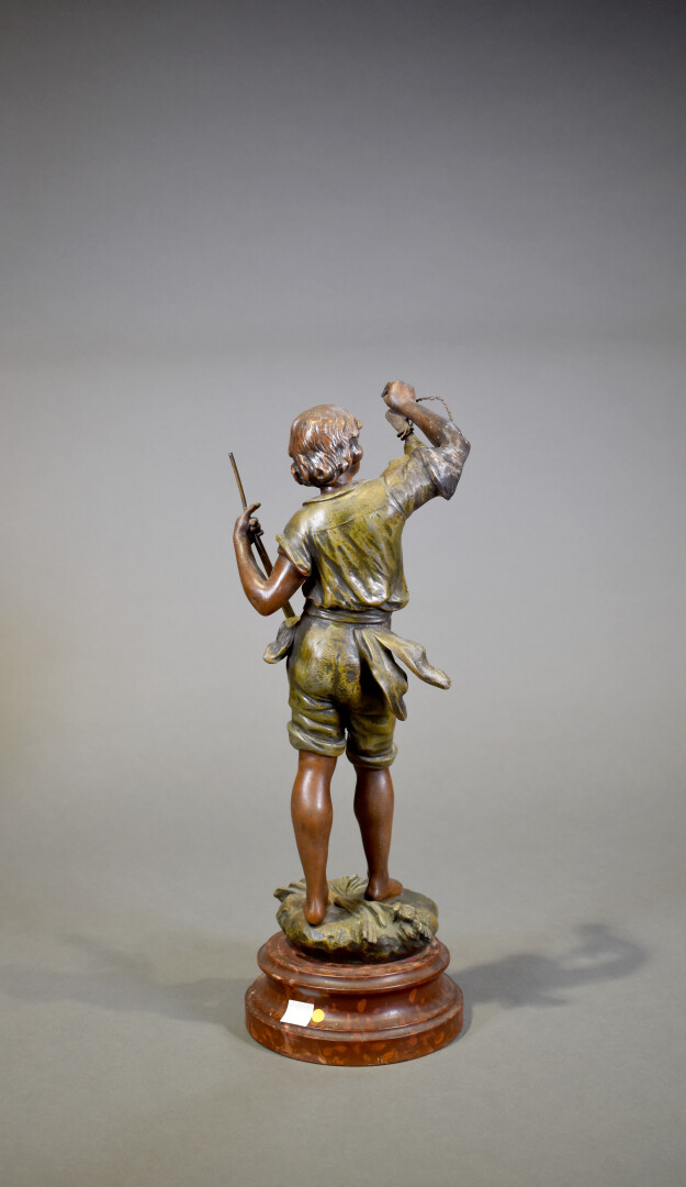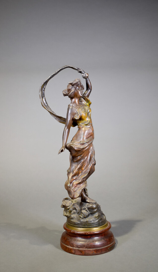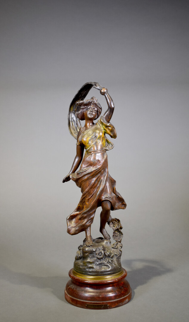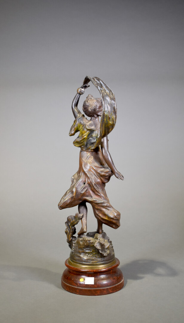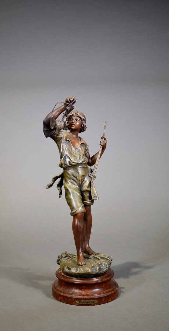 Ensemble de deux régules patinés vert et brun soit « Zephyr » d’après BARIAN et « Le Braconnier ». Socles en bois à l’imitation de marbre rouge griotte. Fin du XIXe ou début du XXe sièccle. Haut. : 49 cm – Haut. : 45 cm. Restauration.