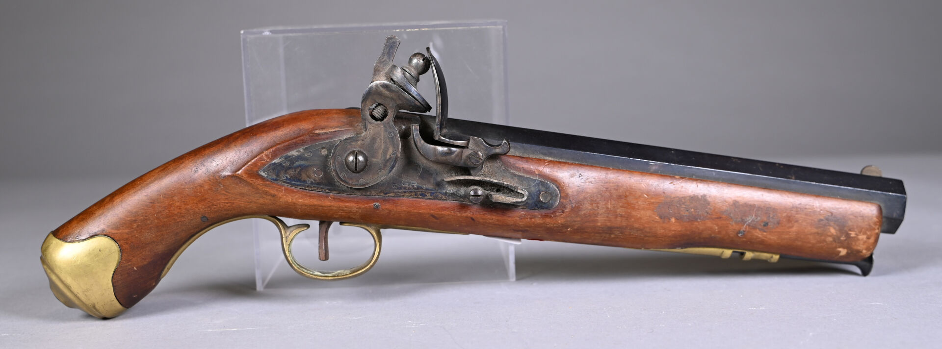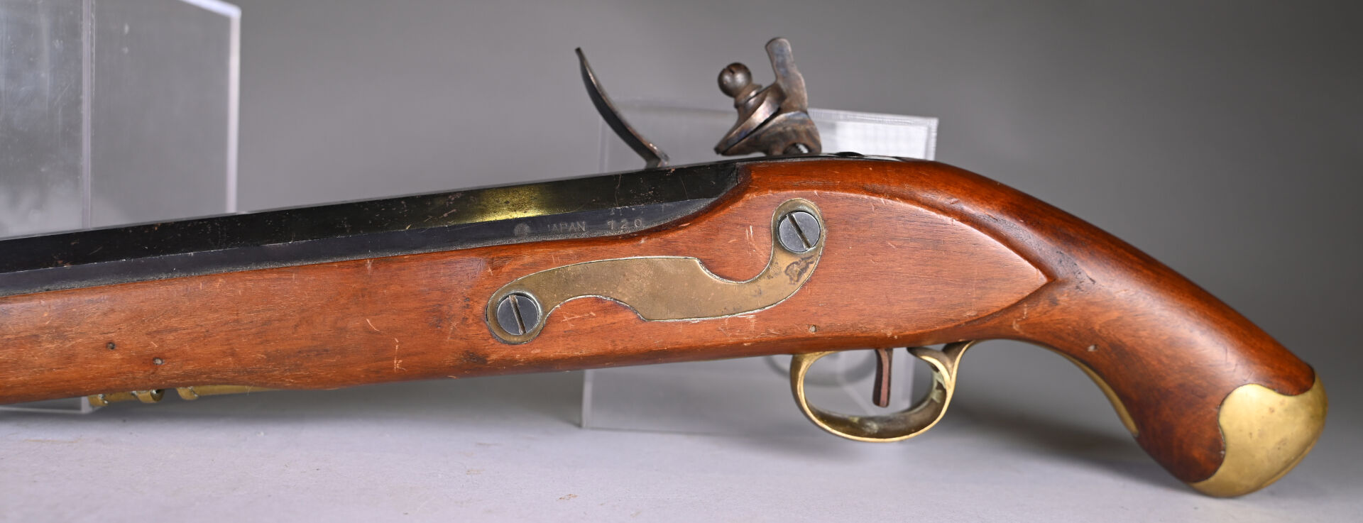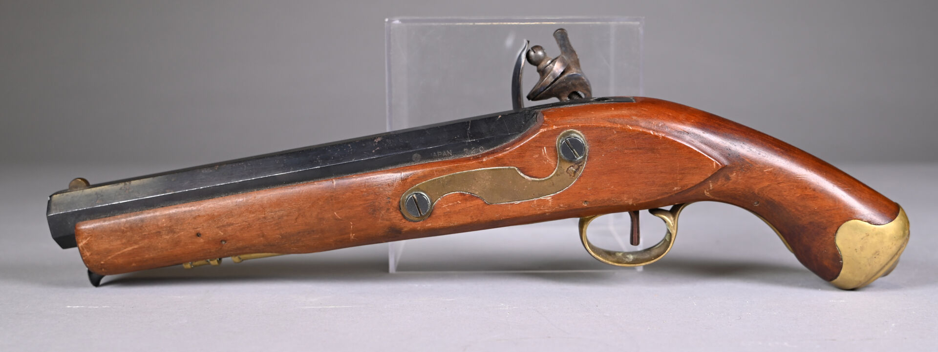 – une reproduction japonaise d’un pistolet à silex anglais, canon octogonal lisse de 230 mm. Mécanisme fonctionnel. État 2. Cat D.