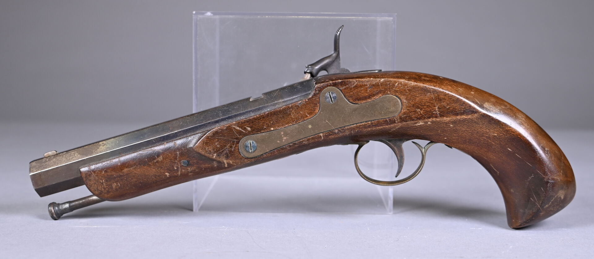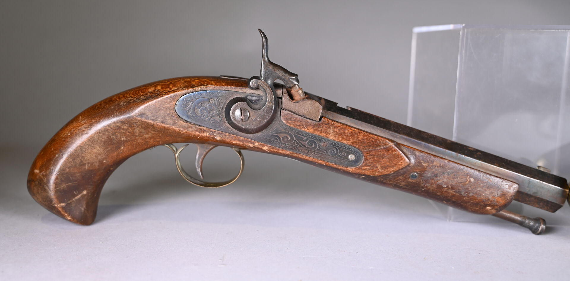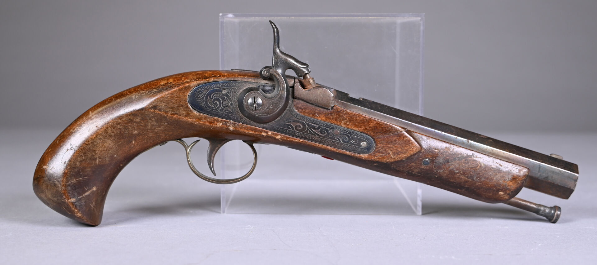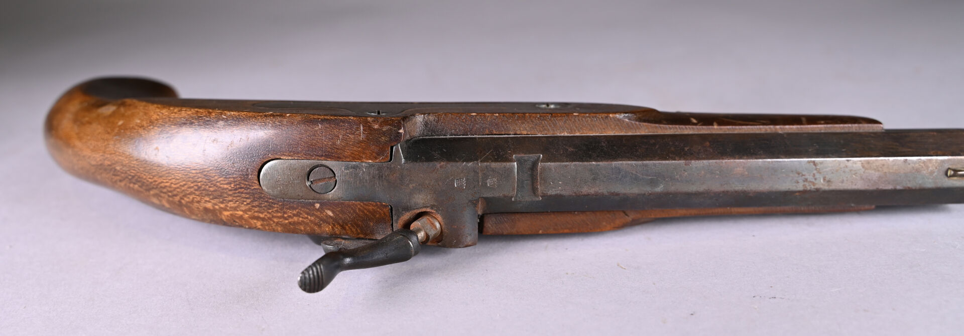 – une sans doute espagnole d’un pistolet de combat à percussion. Canon octogonal de 155 mm. Mécanisme fonctionnel. Manque la hausse. État 2. Cat. D.