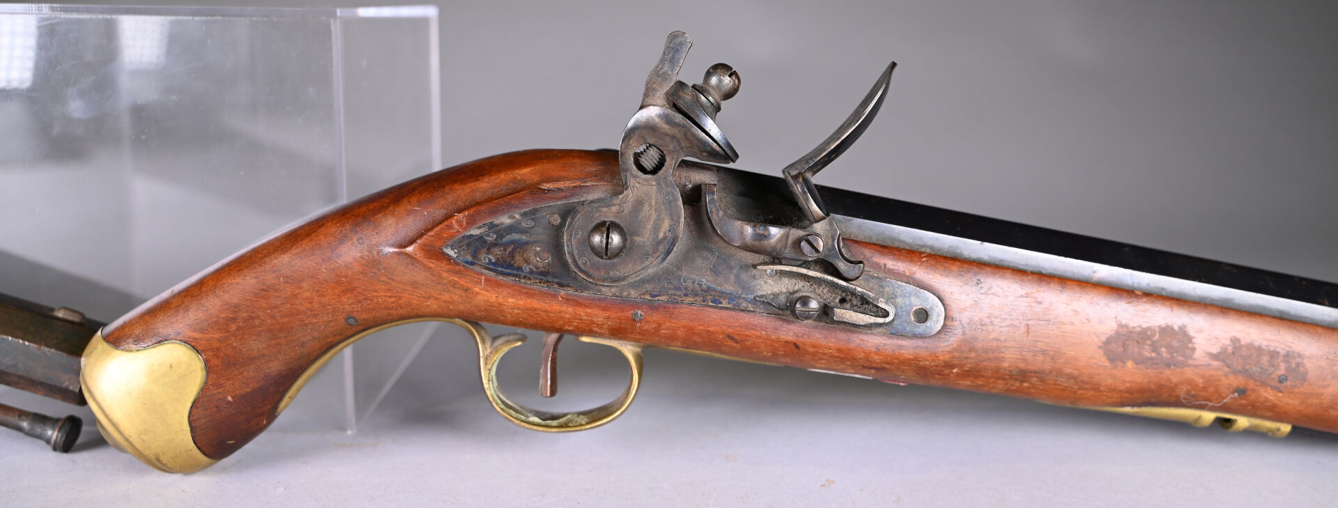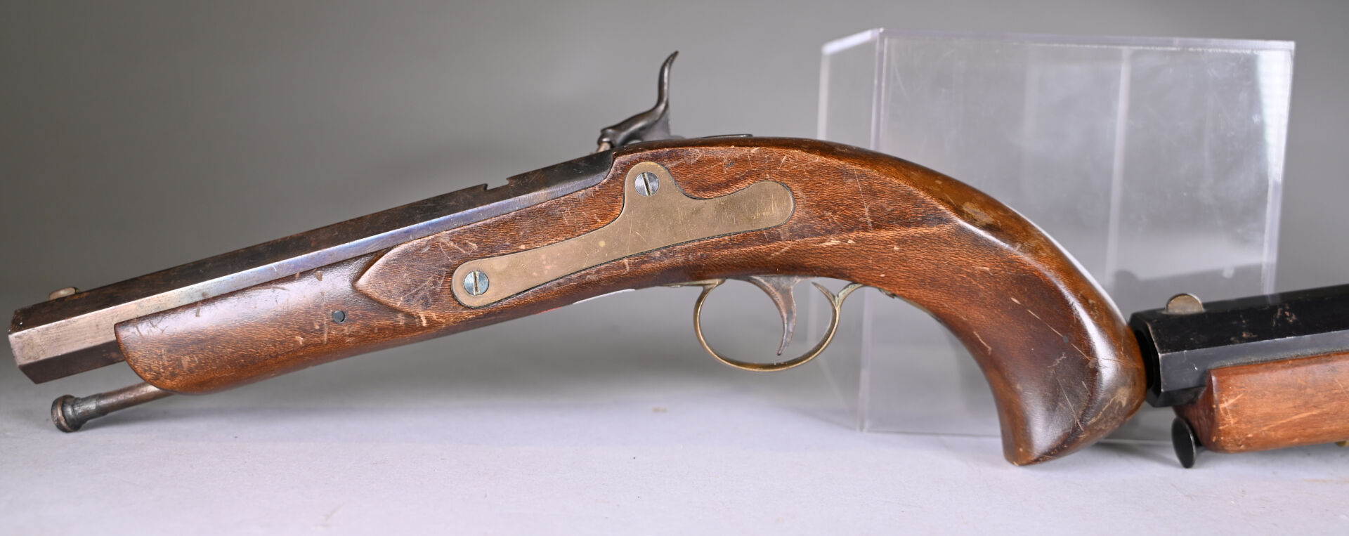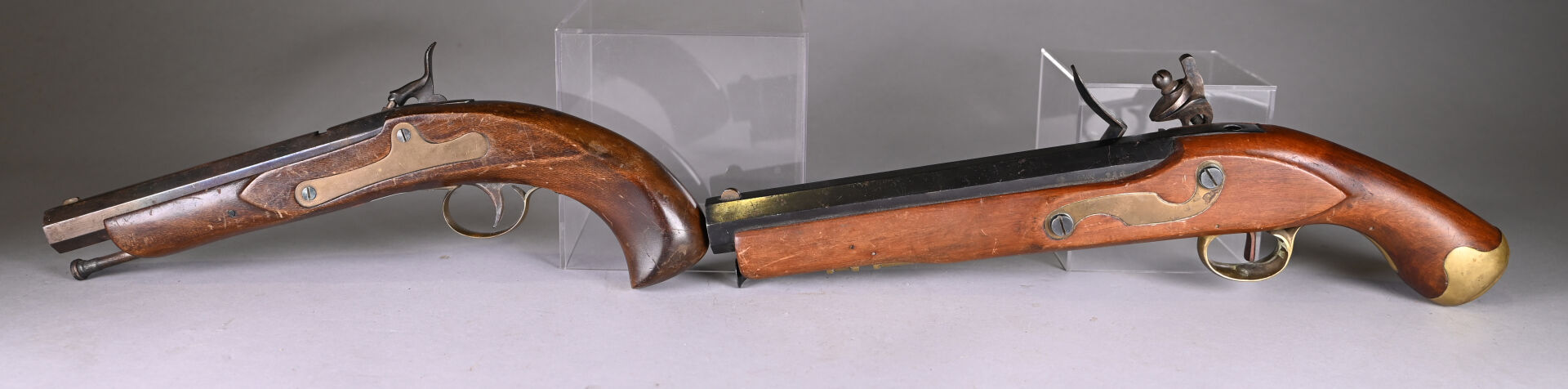 Ensemble de deux répliques modernes d’armes anciennes : – une reproduction japonaise d’un pistolet à silex anglais, canon octogonal lisse de 230 mm. Mécanisme fonctionnel. État 2. Cat D. – une sans doute espagnole d’un pistolet de combat à percussion. Canon octogonal de 155 mm. Mécanisme fonctionnel. Manque la hausse. État 2. Cat. D.