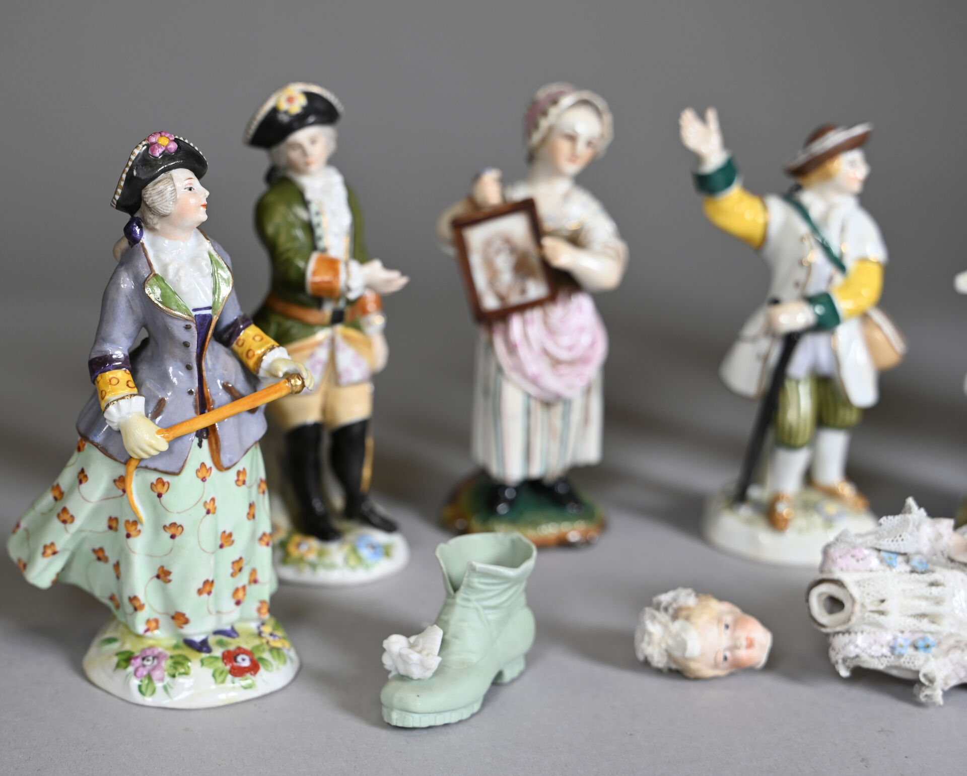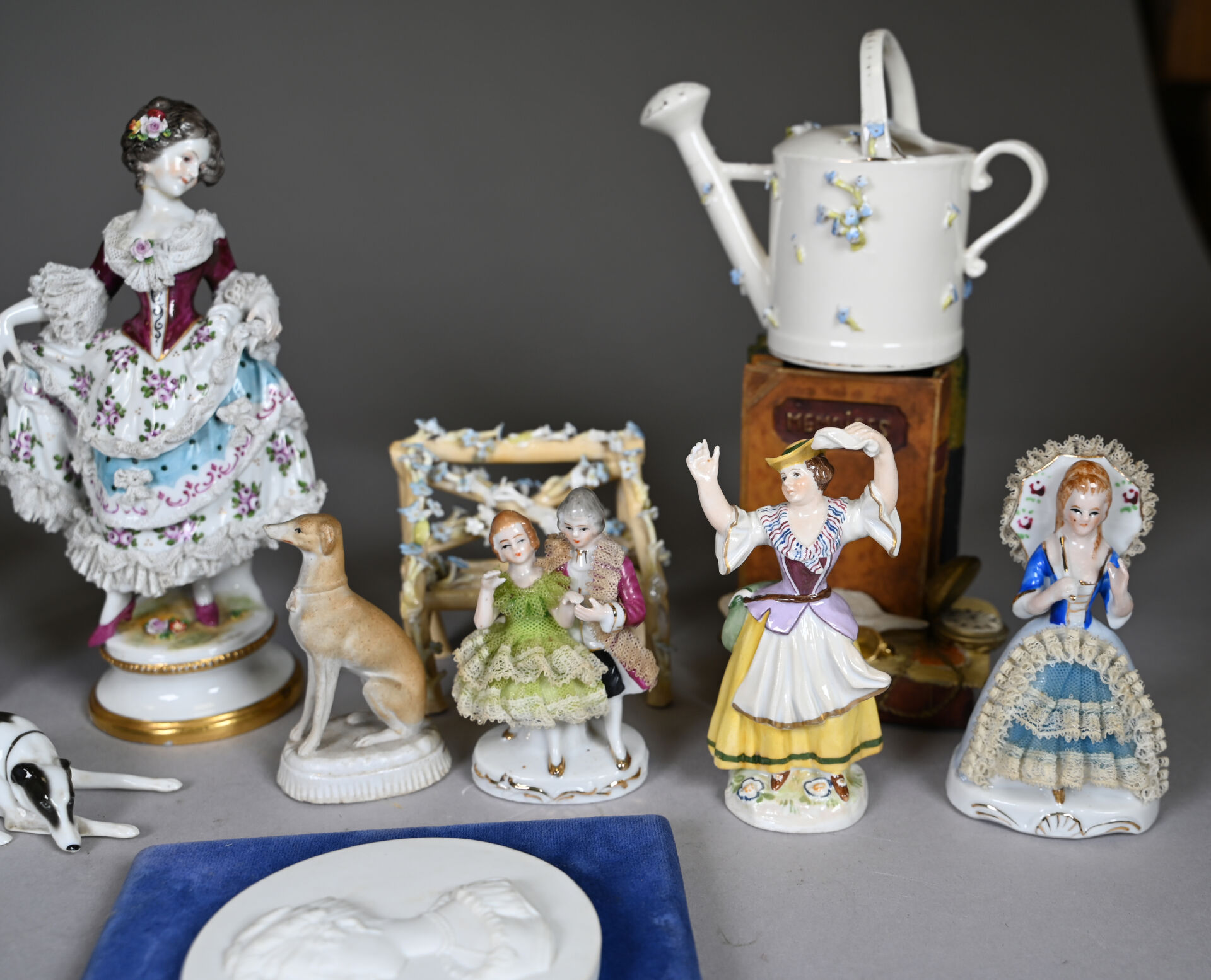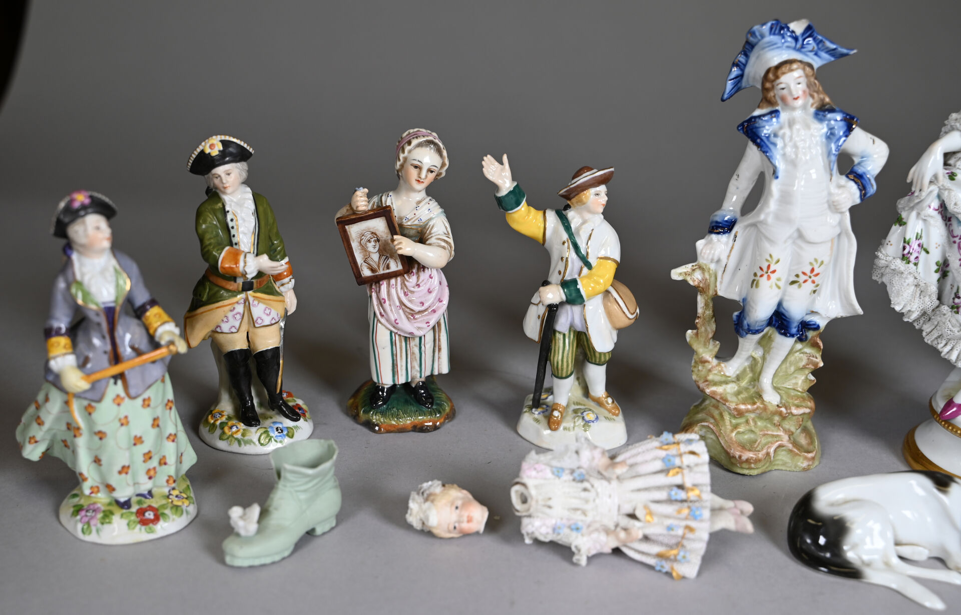 Ensemble de figurines en porcelaine, biscuit et céramique (éclats, usures, manques, restaurations). Saxe, Limoges et divers. 1 petite caisse.