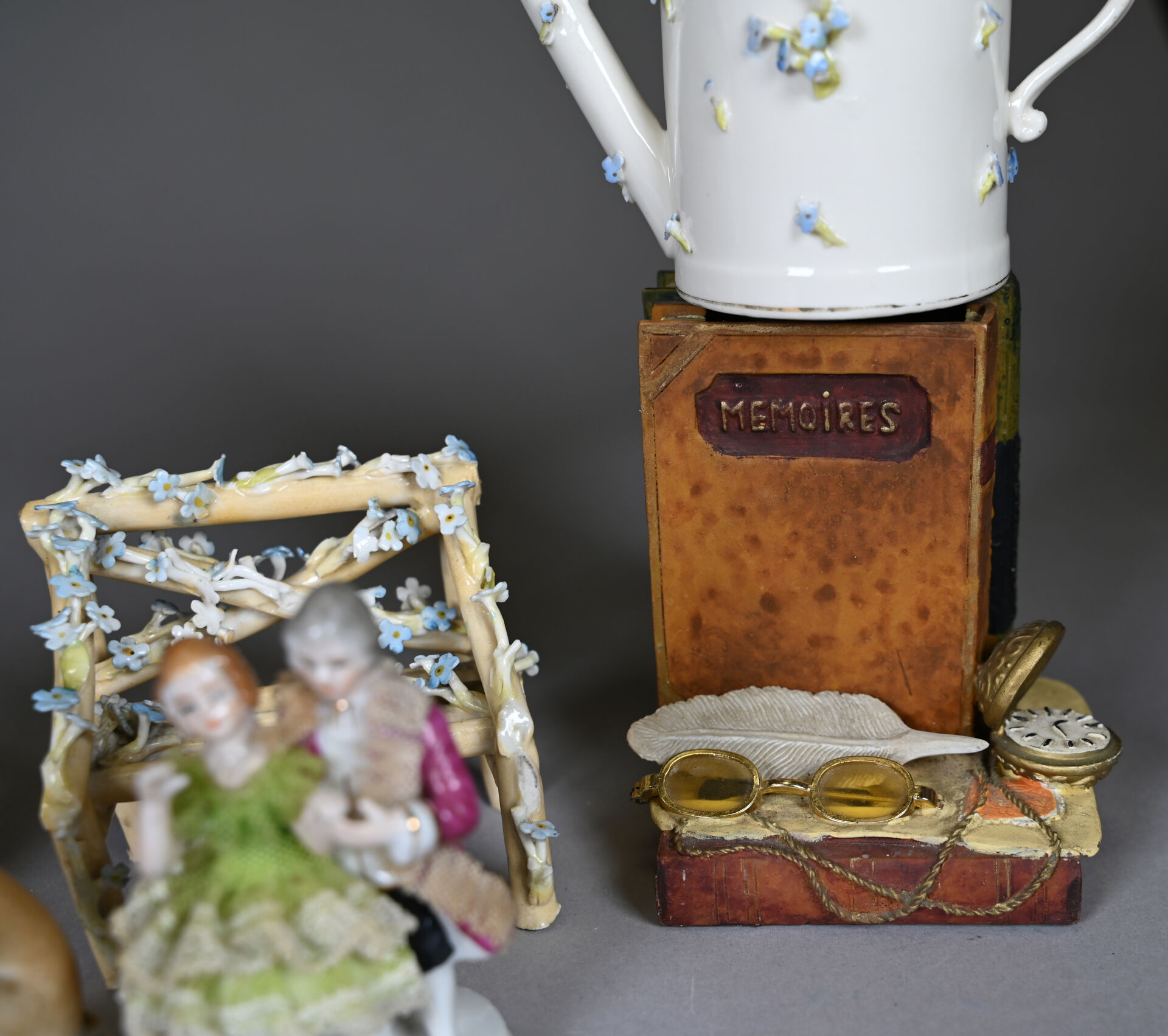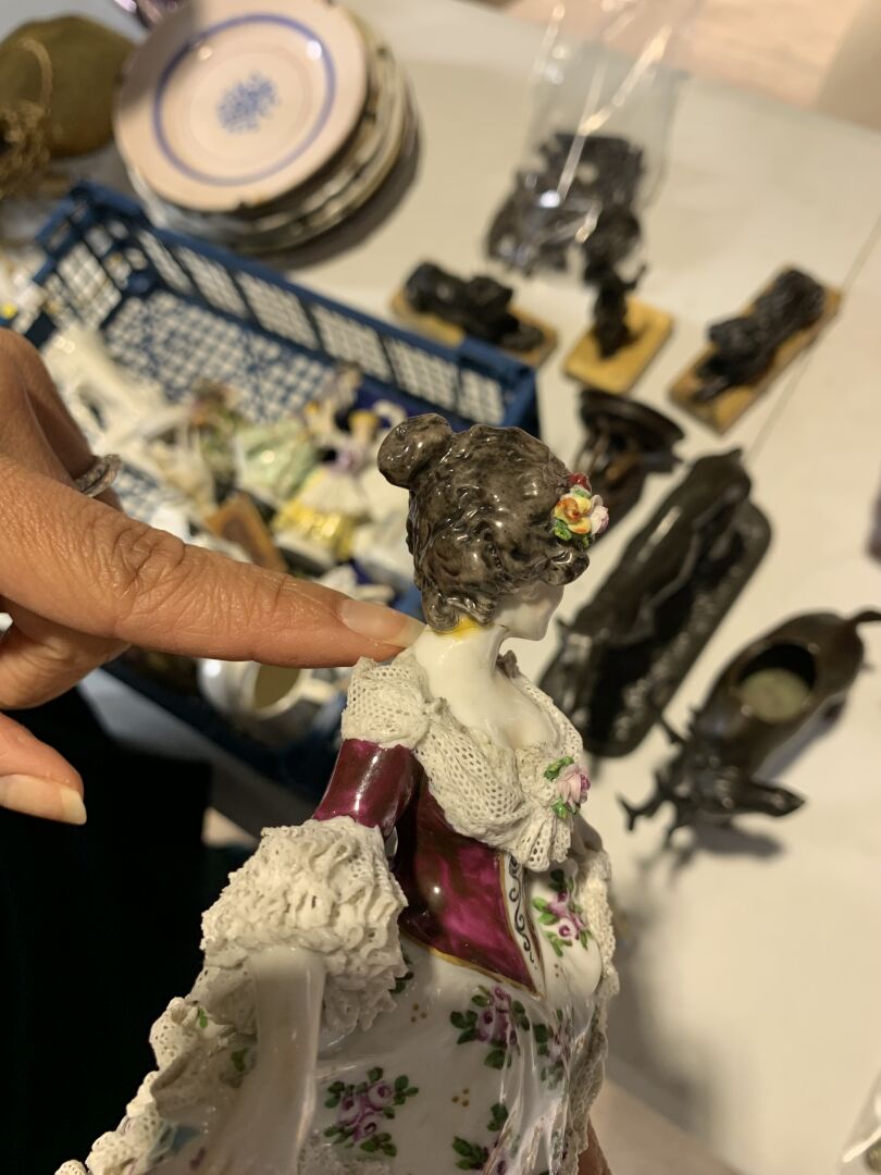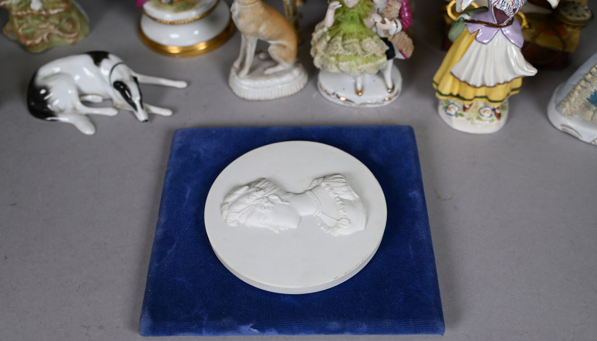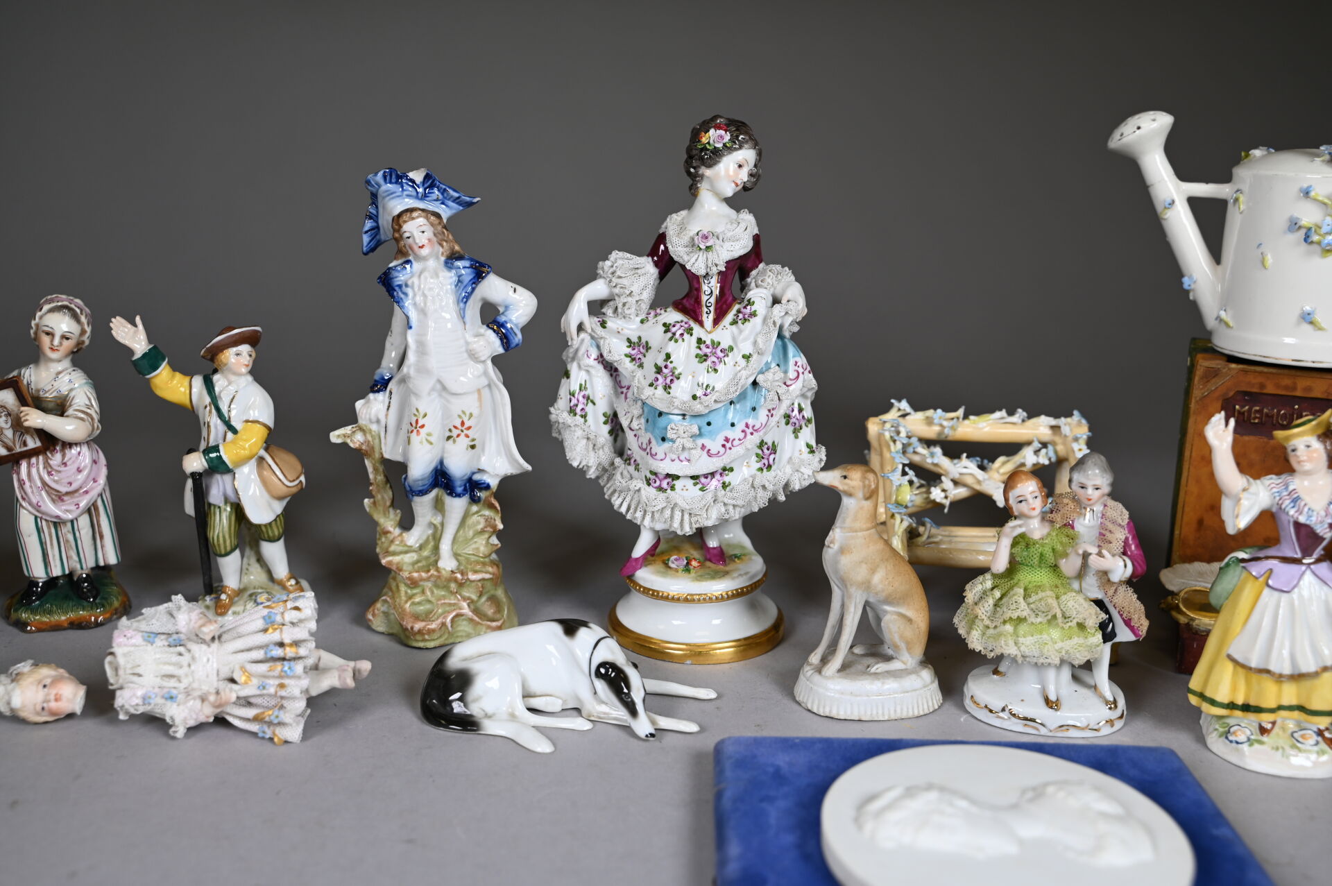 Ensemble de figurines en porcelaine, biscuit et céramique (éclats, usures, manques, restaurations). Saxe, Limoges et divers. 1 petite caisse.