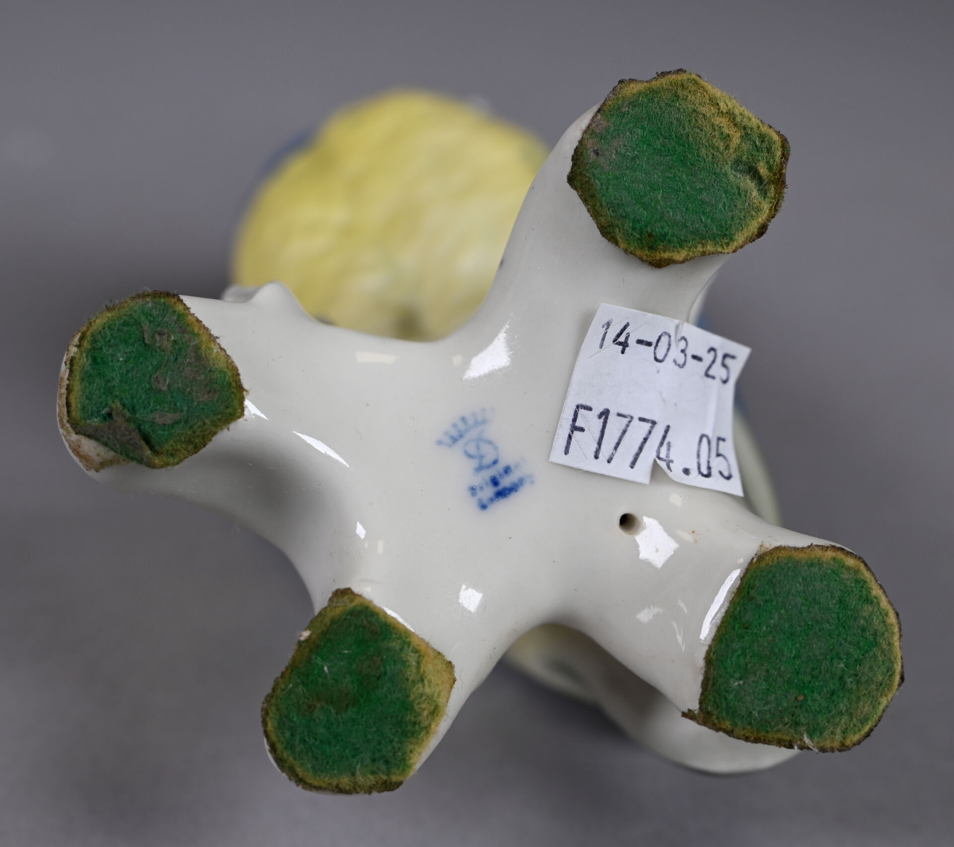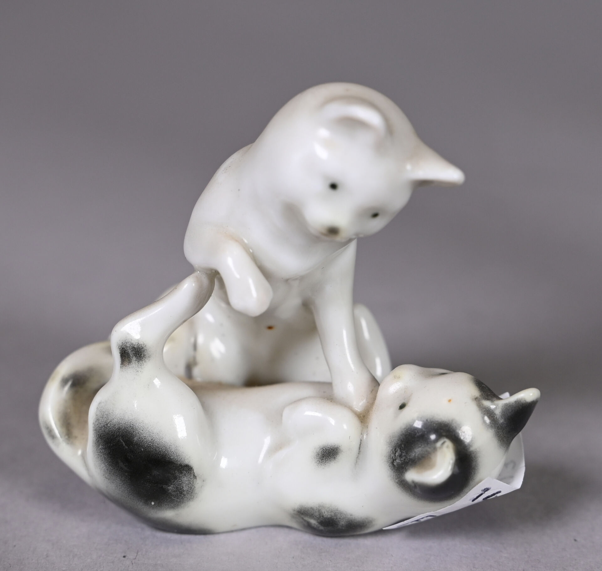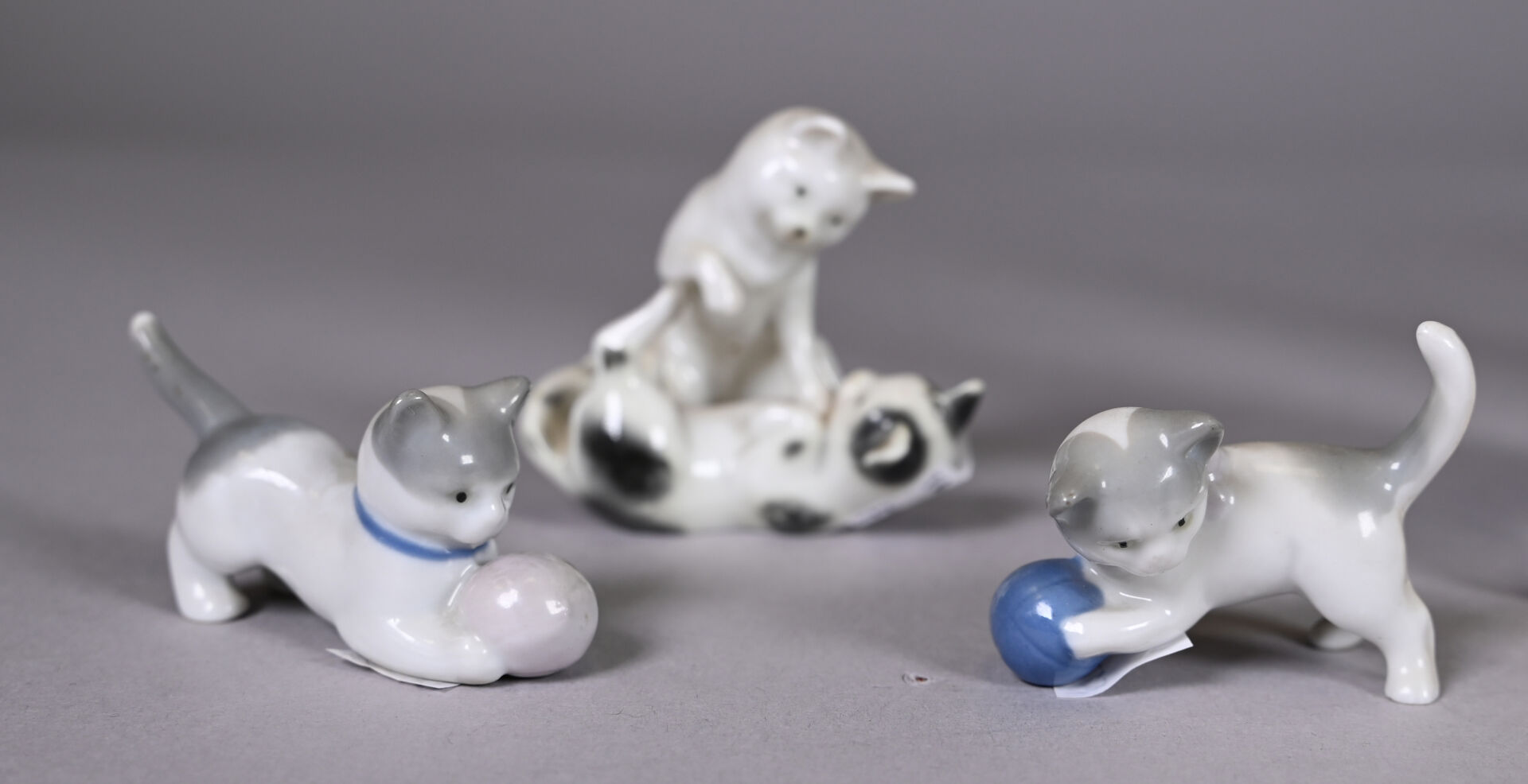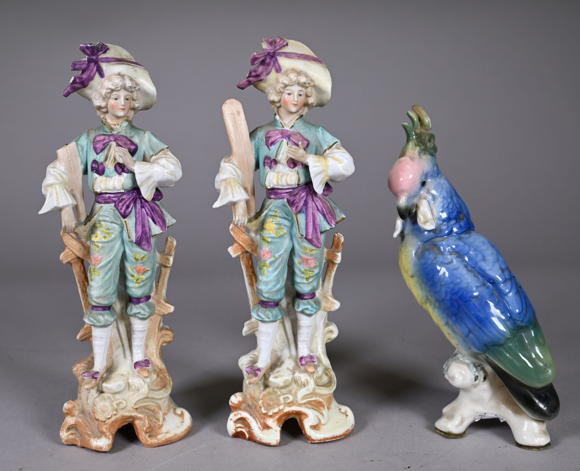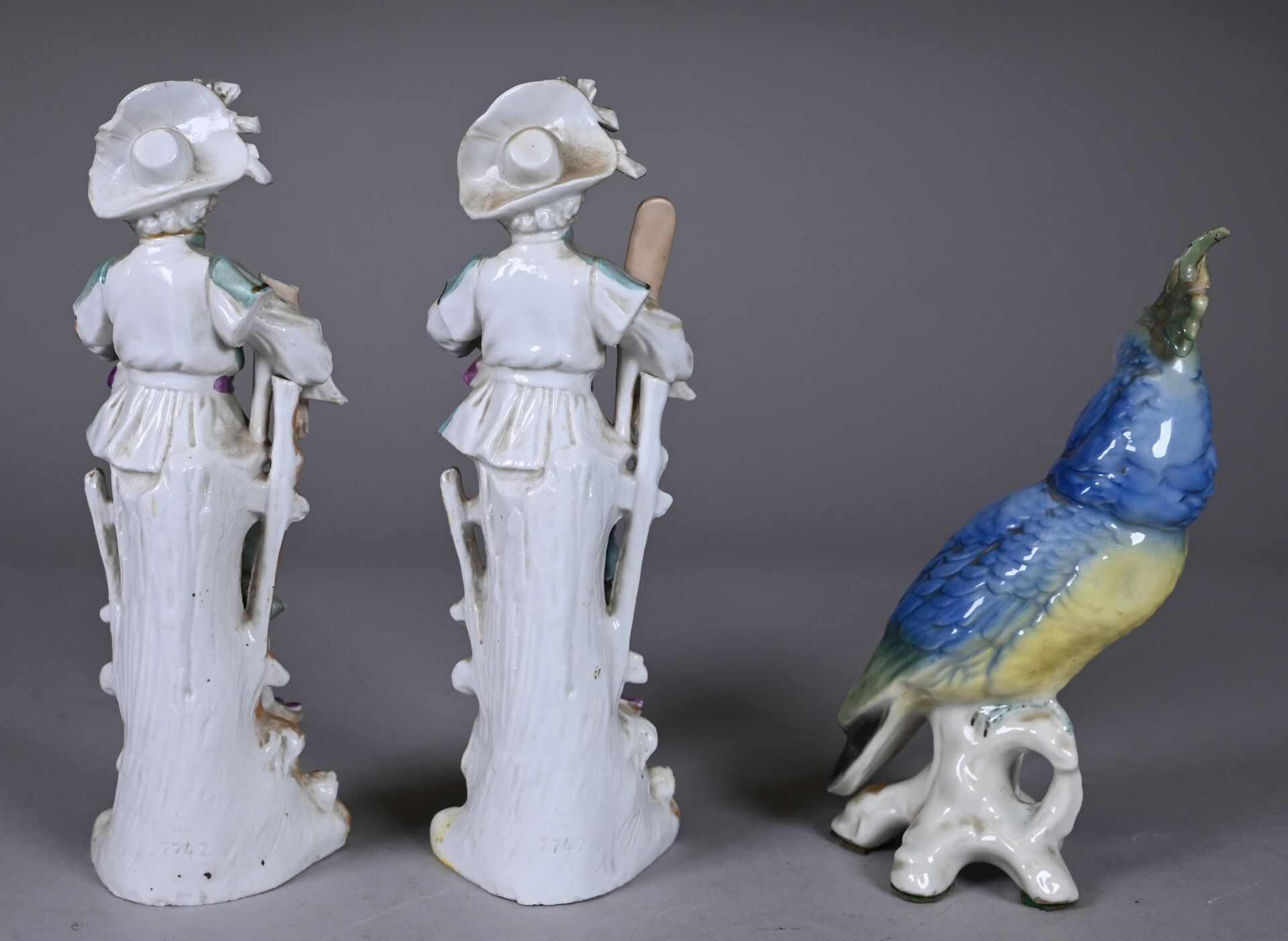 (*) Ensemble de figurines en porcelaine dont Saxe soit deux personnages dans le goût du XVIIIe siècle, un perroquet, chatons au jeu (éclats et restaurations). Haut. des personnages : 23 cm.