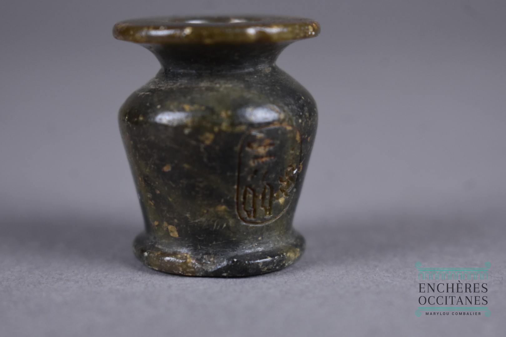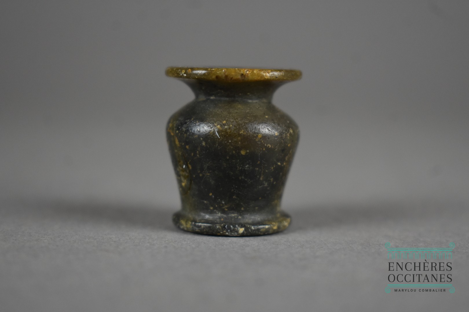 Ensemble de huit pièces dont 1 unguentarium en verre (éclats au col), 1 coupelle sur pied en pierre verte, 1 pied droit votif en bronze, 1 coupelle en terre cuite de style grec archaïque, 1 vase à pierre dure à anses ouvertes (cassé, restauré ; Égypte, Nagada I ?) et divers.
