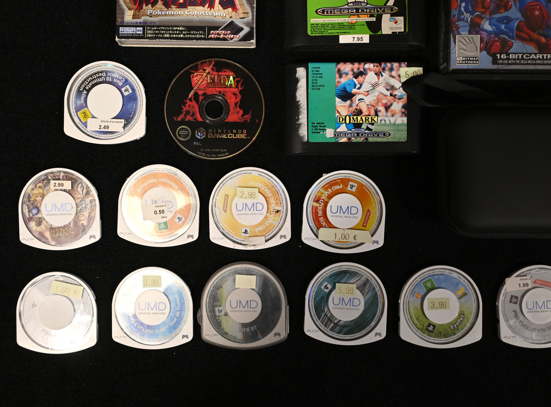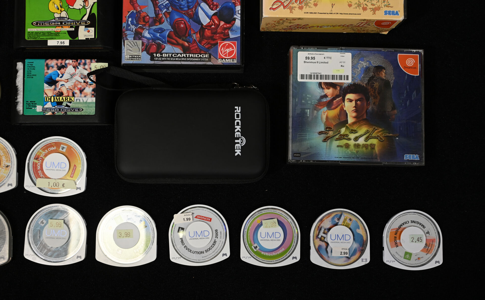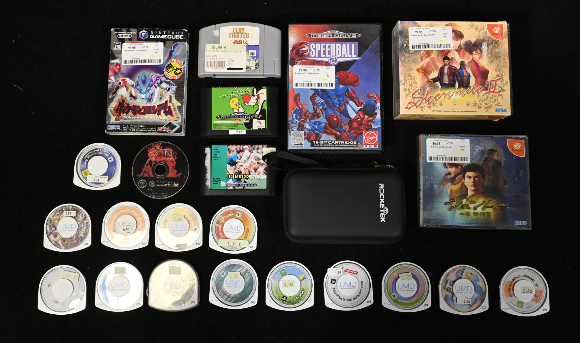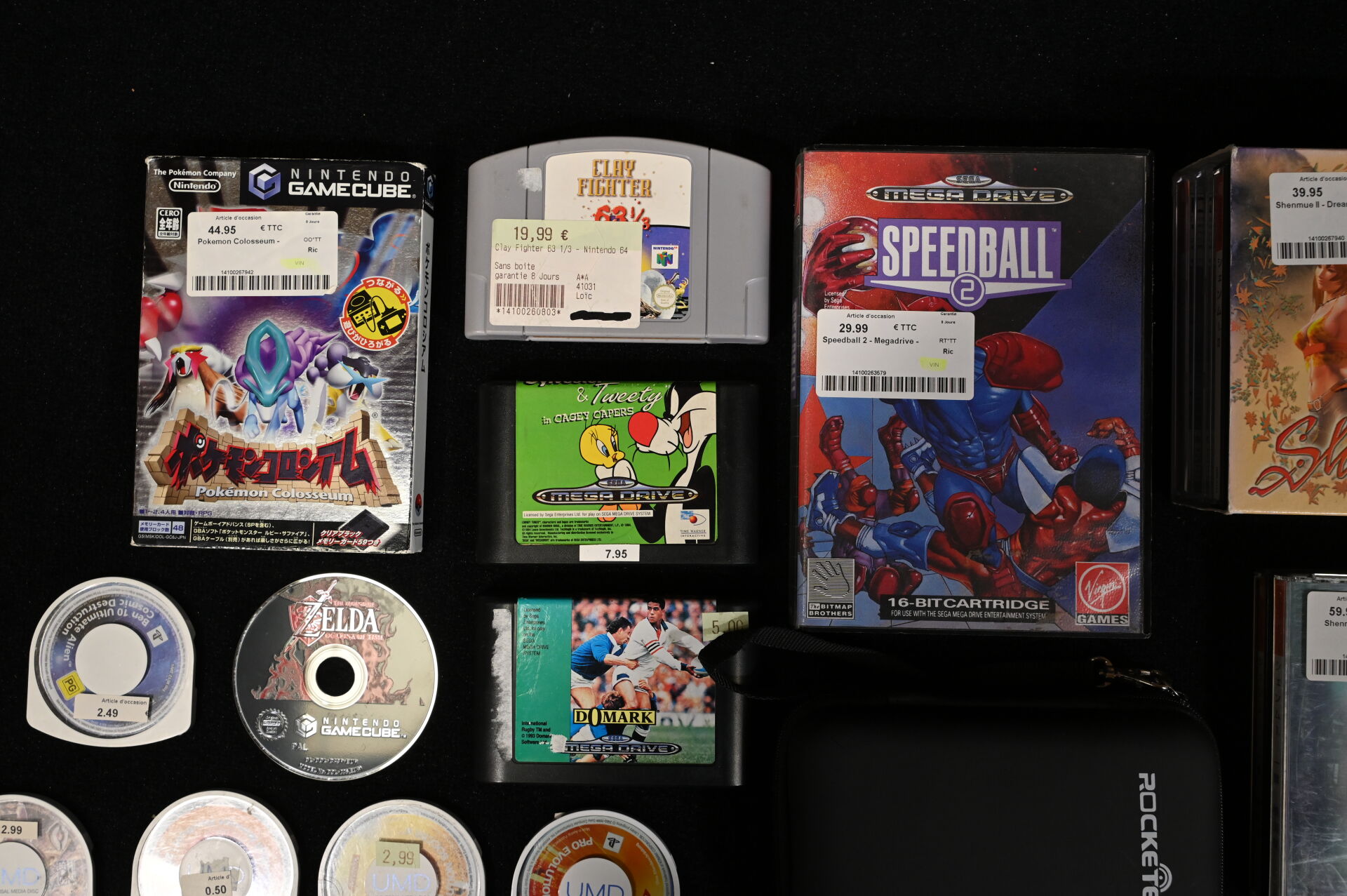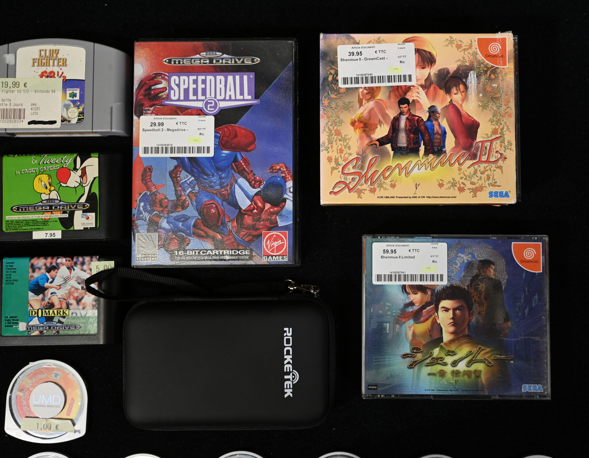 * Ensemble de jeux de divers consoles, soit : – SEGA DREAMCAST – Coffret SHENMUE II UNLIMITED – Édition japonaise – SEGA DREAMCAST – Coffret SHENMUE II – Édition japonaise – NINTENDO GAMECUBE – POKEMON COLOSSEUM – Édition japonaise, manque un accessoire. – NINTENDO GAMECUBE – THE LEGEND OF ZELDA OCARINA OF TIME (absence de boîte) – NINTENDO 64 – CLAY FIGHTER 63 1/3 – SEGA MEGA DRIVE – SYLVESTER AND TWEETY – SEGA MEGA DRIVE – SPEEDBALL 2 – SEGA MEGA DRIVE – DOMARK (absence de boîte) – SONY PSP – 14 jeux.